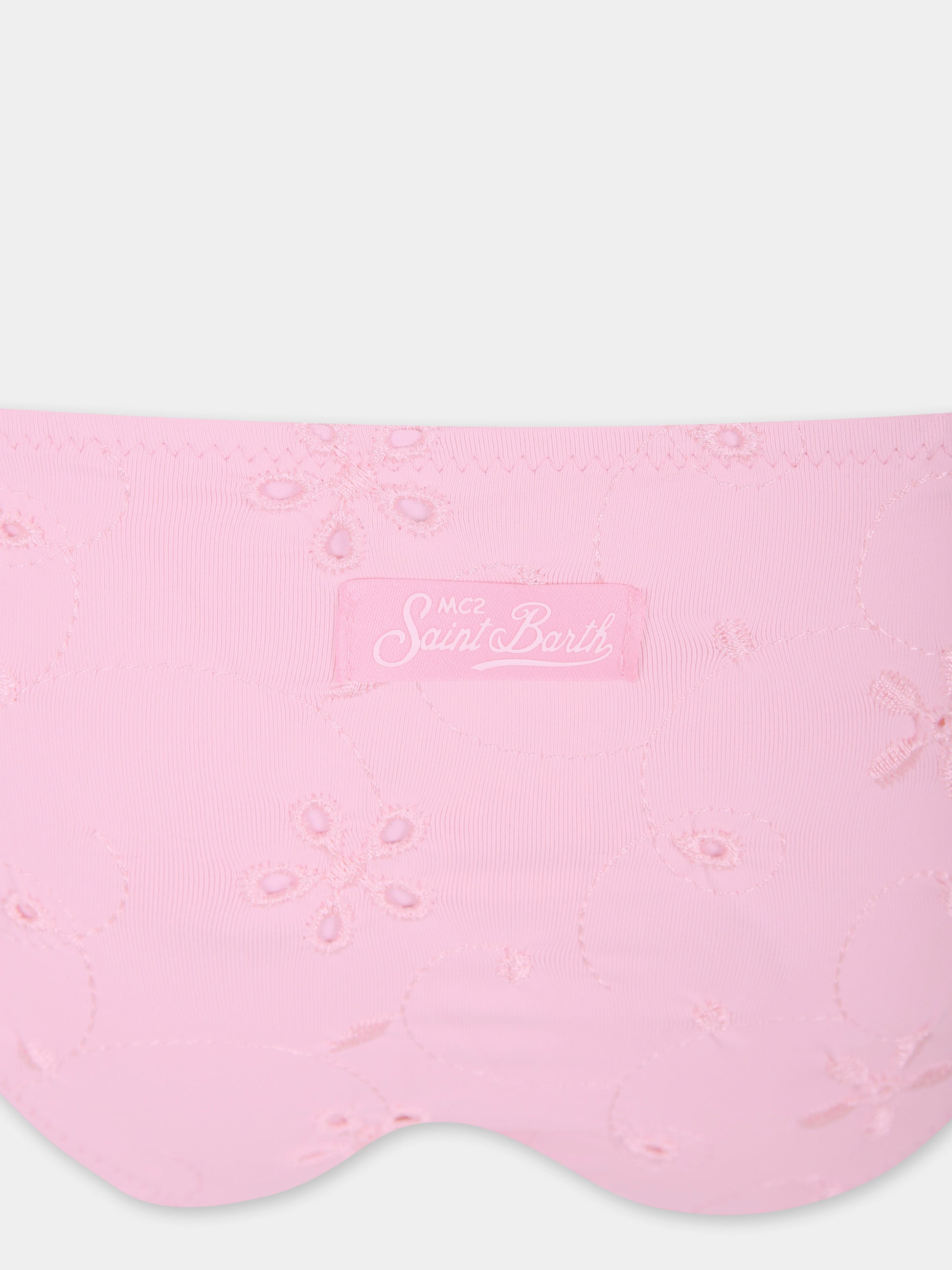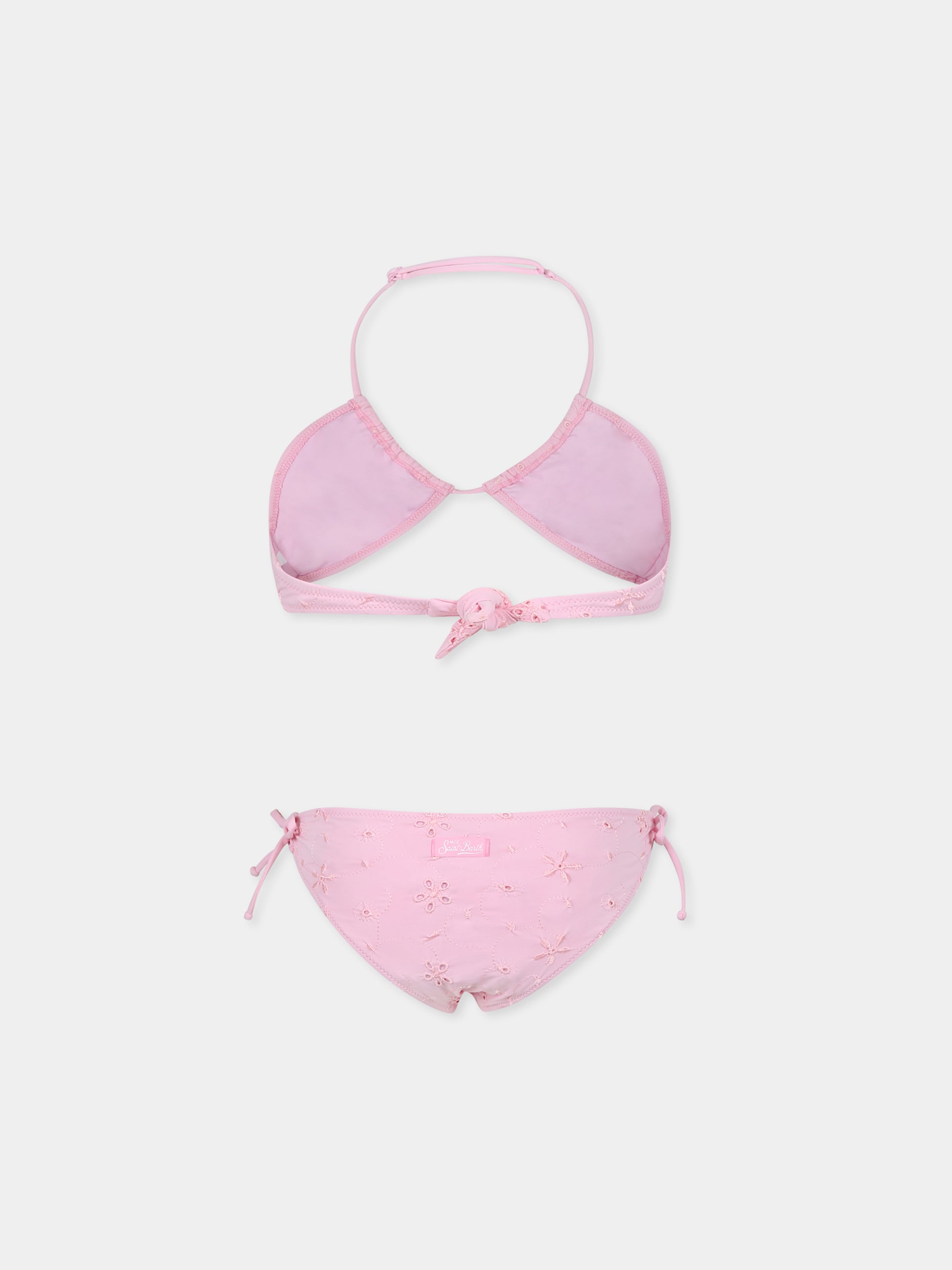 Colore: Rosa Descrizione: Bikini rosa composto da top con chiusura regolabile sul retro, slip da bagno con chiusure laterali con fiocco. È decorato con fiori ricamati all-over e patch logata sul retro. Dettagli: 80% Poliestere, 20% Elastan. Lavare a mano.