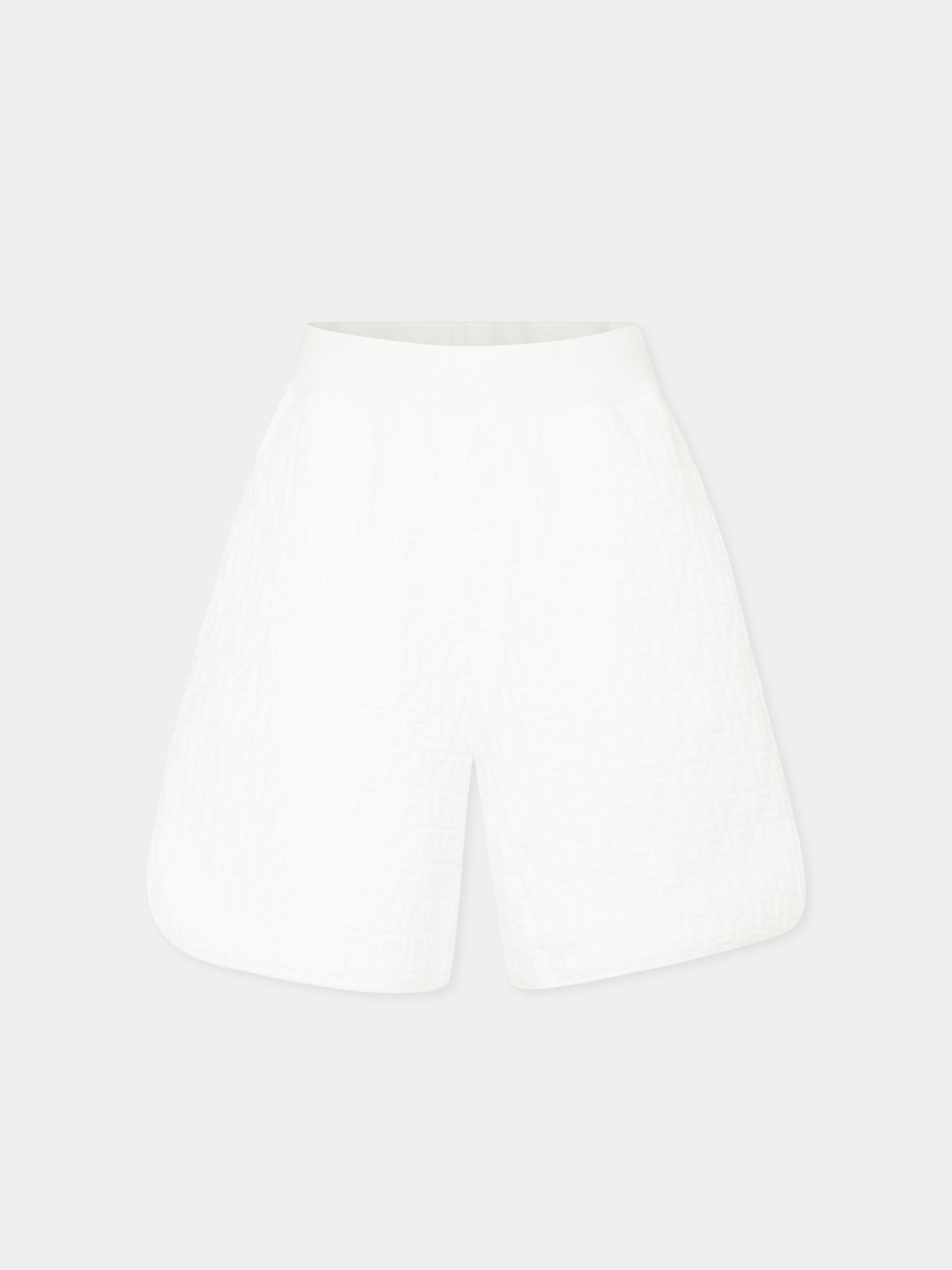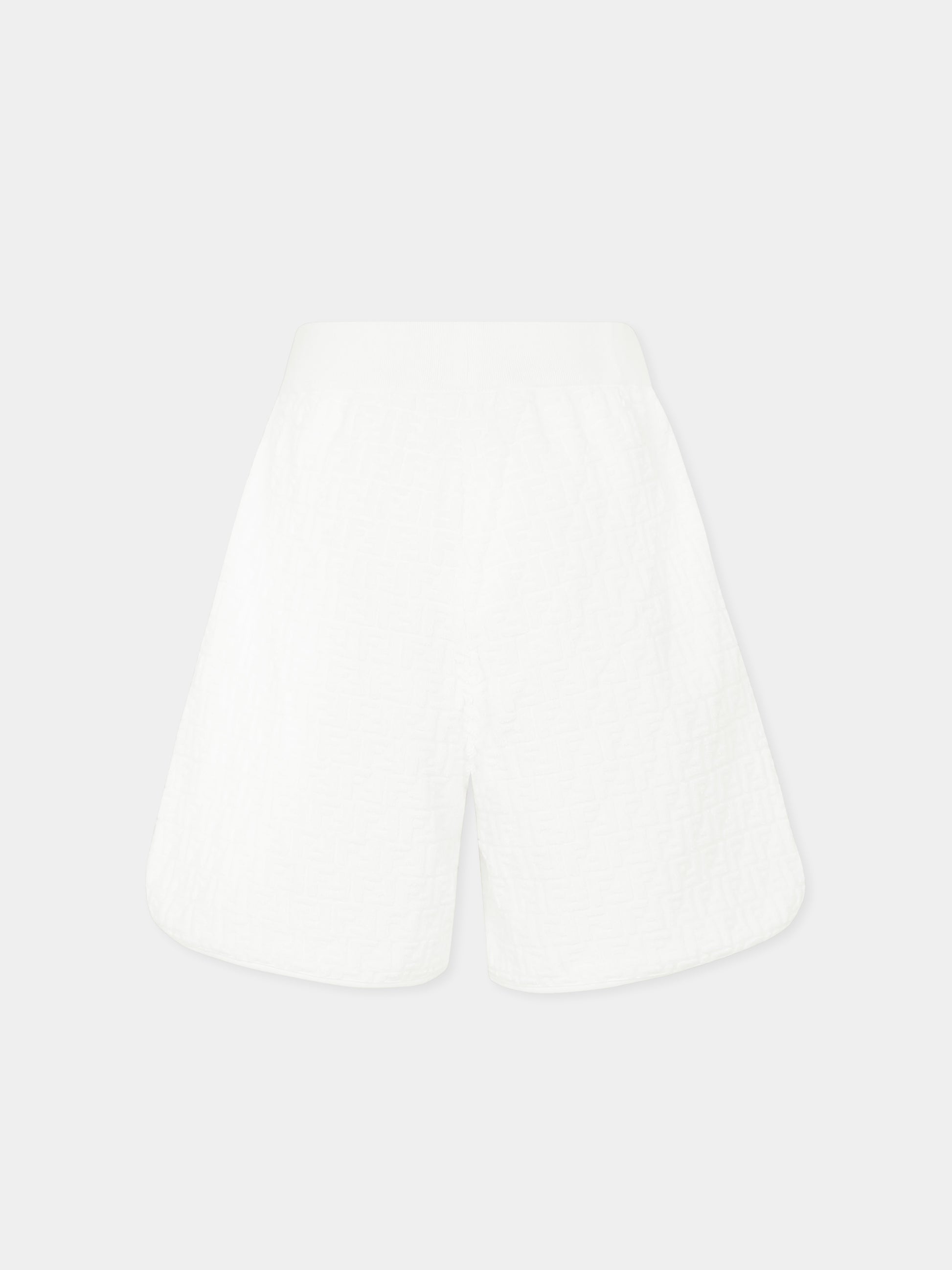 Colore: Bianco Descrizione: Shorts bianchi del luxury brand Fendi Kids, realizzati in misto cotone. Presentano una vita elasticizzata e tacshe laterali. Sono decorati con iconica FF in spugna all-over a rilievo. Made in Italy Dettagli: 87% Cotone, 13% Poliammide. Lavare a 30°C.