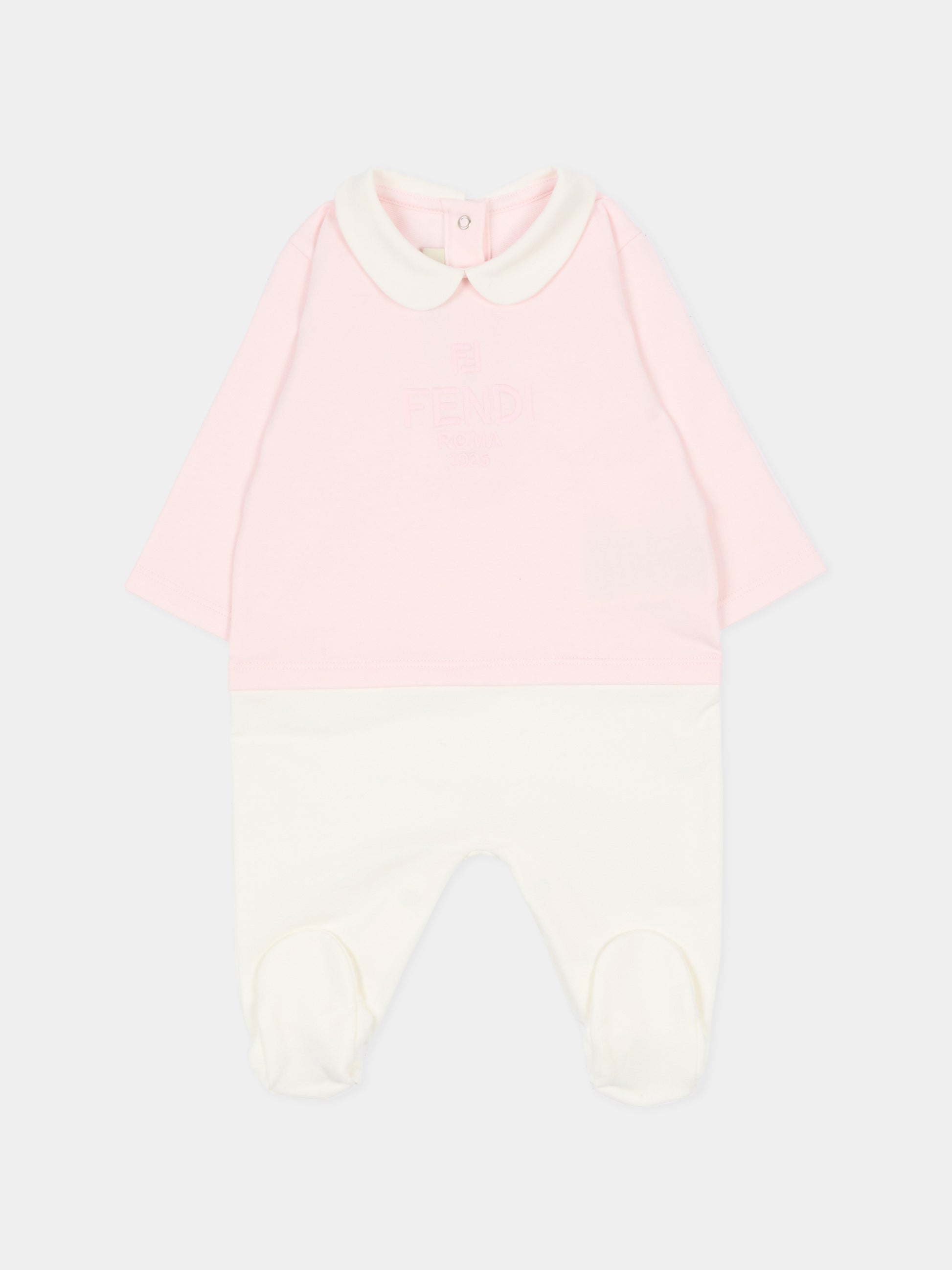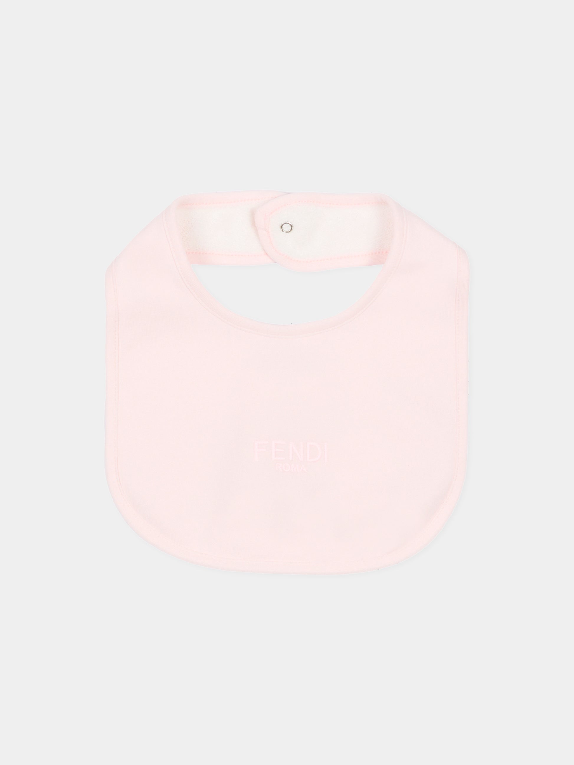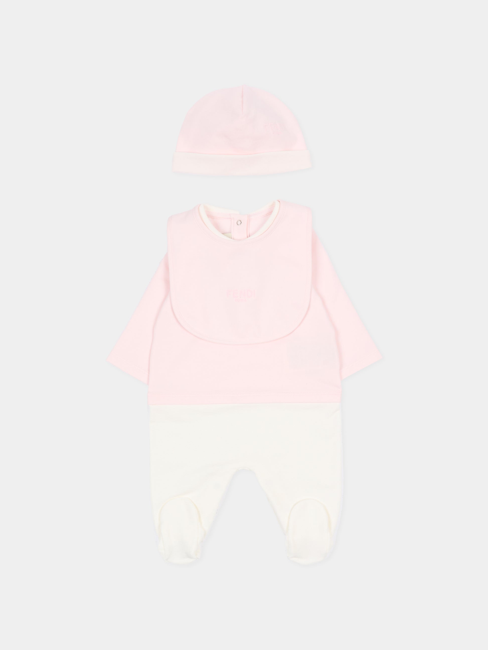 Colore: Rosa Descrizione: Set tutine rosa del luxury brand Fendi Kids, realizzato in misto cotone, composto da tutina, berretto e bavaglino. Tutina in cotone garzato, a maniche lunghe, con colletto peter pan bianco, piedini, chiusura con bottoni automatici sul retro e tra le gambe; é decorata con logo Fendi Roma ricamato sulla parte anteriore. Berretto con risvolto bianco; decorato con logo ricamato. Bavaglino con chiusura con bottone automatico sul retro; decorato con logo ricamato, sulla parte anteriore, Dettagli: 97% Cotone, 3% Elastan. Lavare a 30°C.