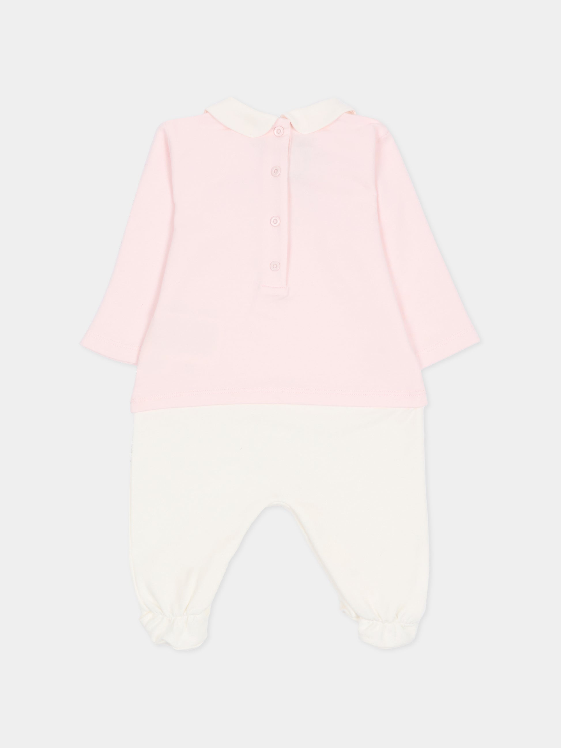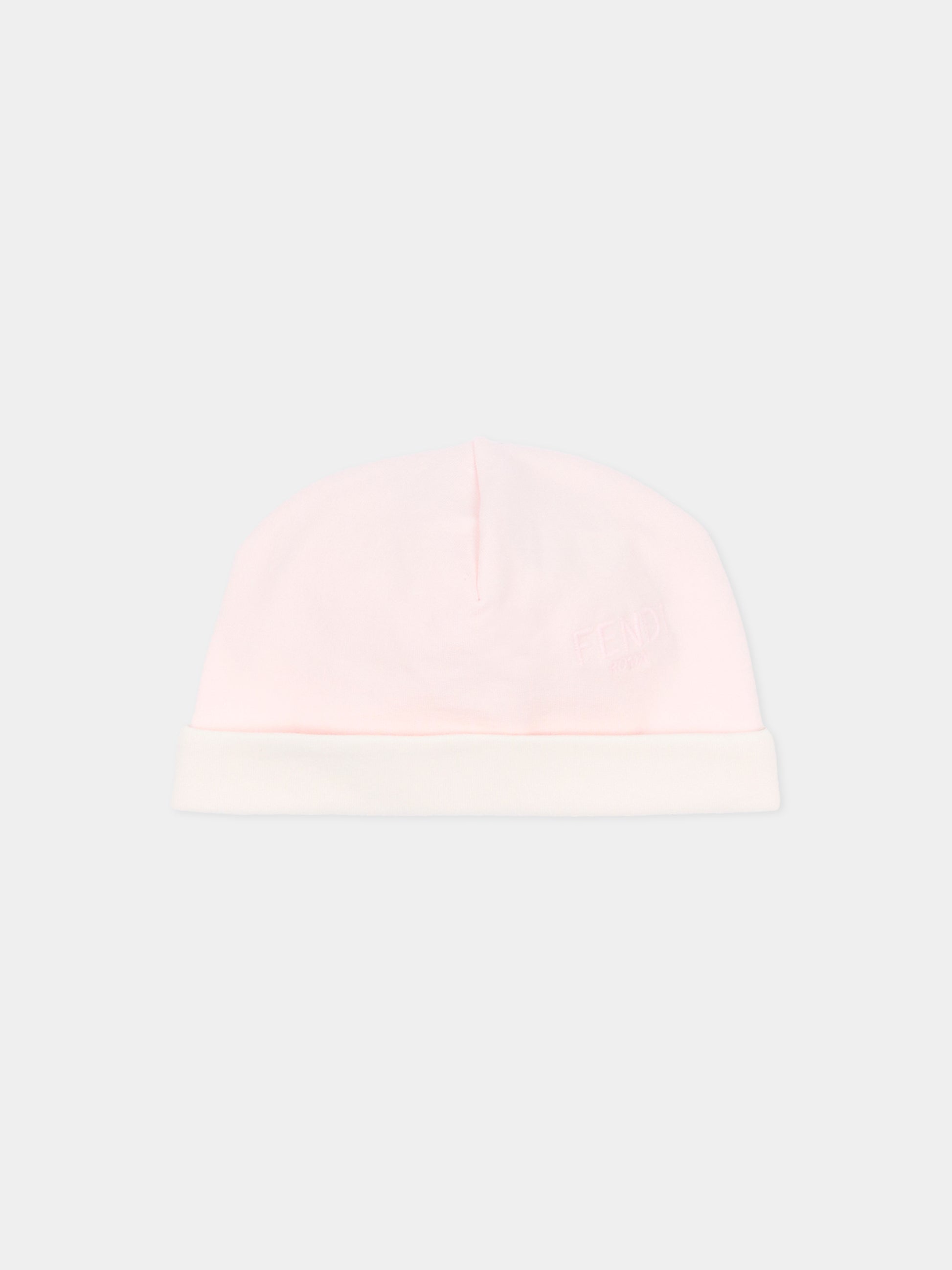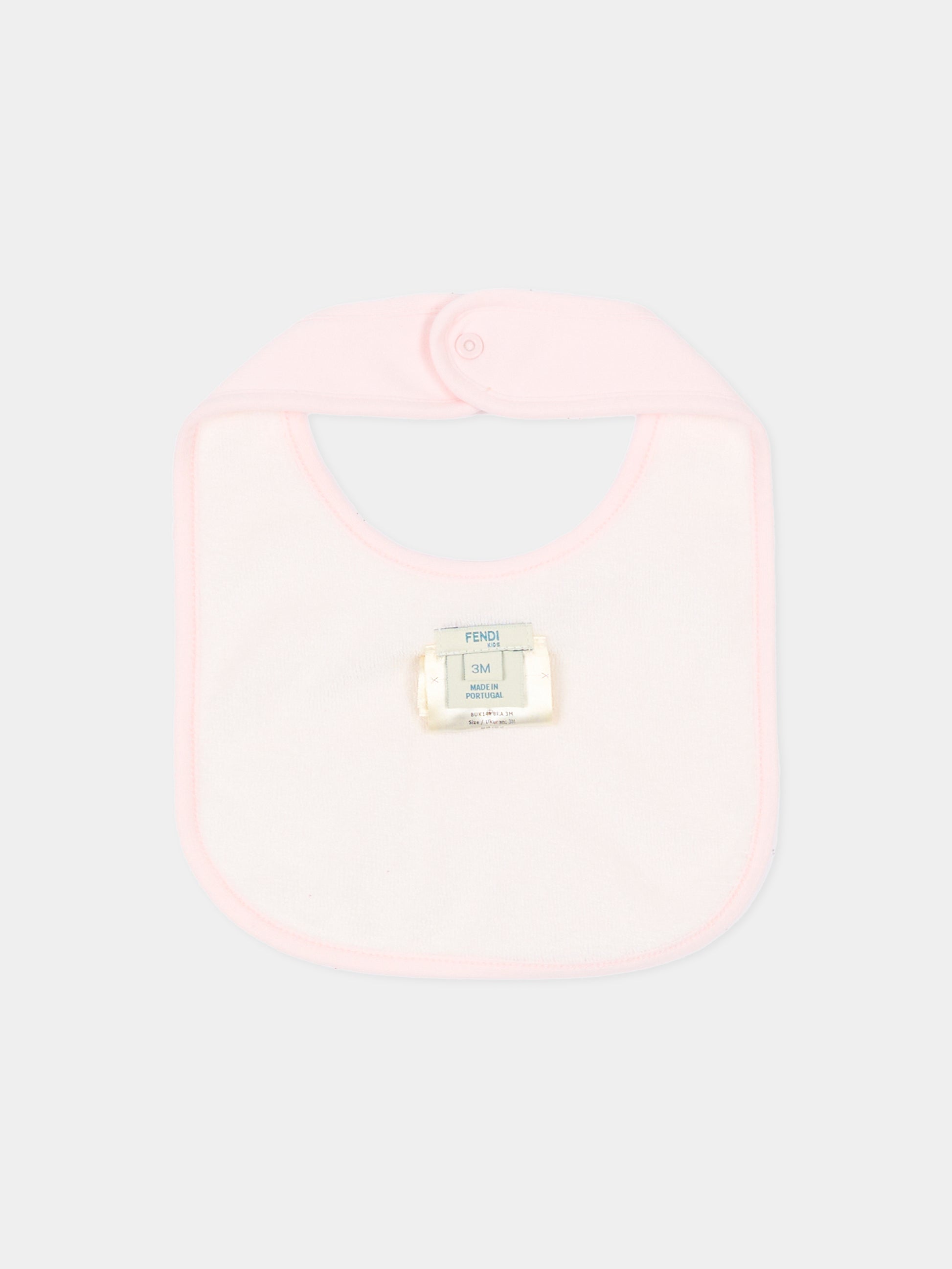 Colore: Rosa Descrizione: Set tutine rosa del luxury brand Fendi Kids, realizzato in misto cotone, composto da tutina, berretto e bavaglino. Tutina in cotone garzato, a maniche lunghe, con colletto peter pan bianco, piedini, chiusura con bottoni automatici sul retro e tra le gambe; é decorata con logo Fendi Roma ricamato sulla parte anteriore. Berretto con risvolto bianco; decorato con logo ricamato. Bavaglino con chiusura con bottone automatico sul retro; decorato con logo ricamato, sulla parte anteriore, Dettagli: 97% Cotone, 3% Elastan. Lavare a 30°C.