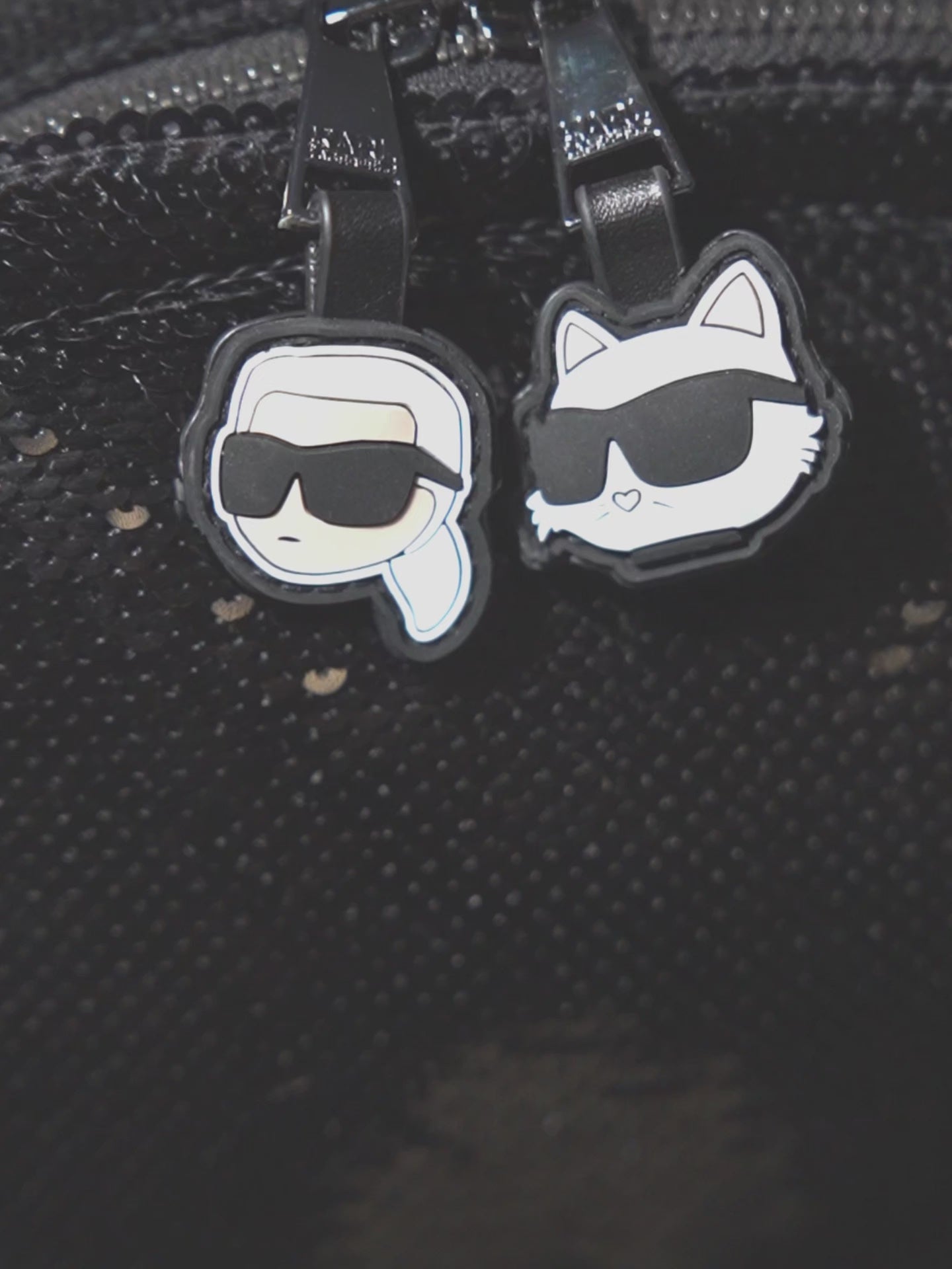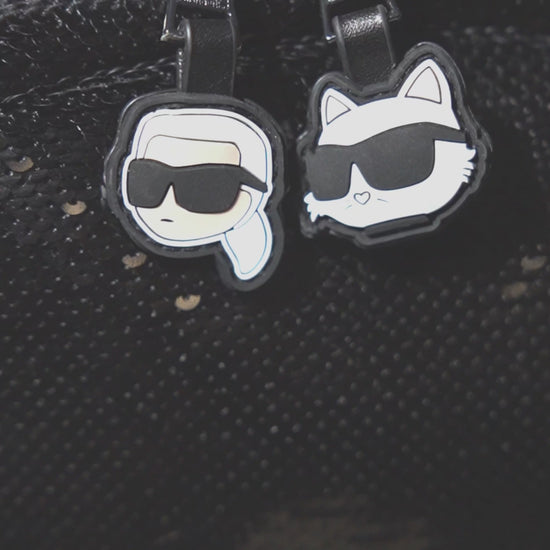 Colore: Nero Descrizione: Zaino nero con paillettes all-over, chiusura con zip sulla parte superiore, spallaci regolabili e tasca con chiusura con zip sulla parte anteriore. È decorato con Karl Lagerfeld e Choupette sulla zip. Dettagli: 100%Poliestere.
