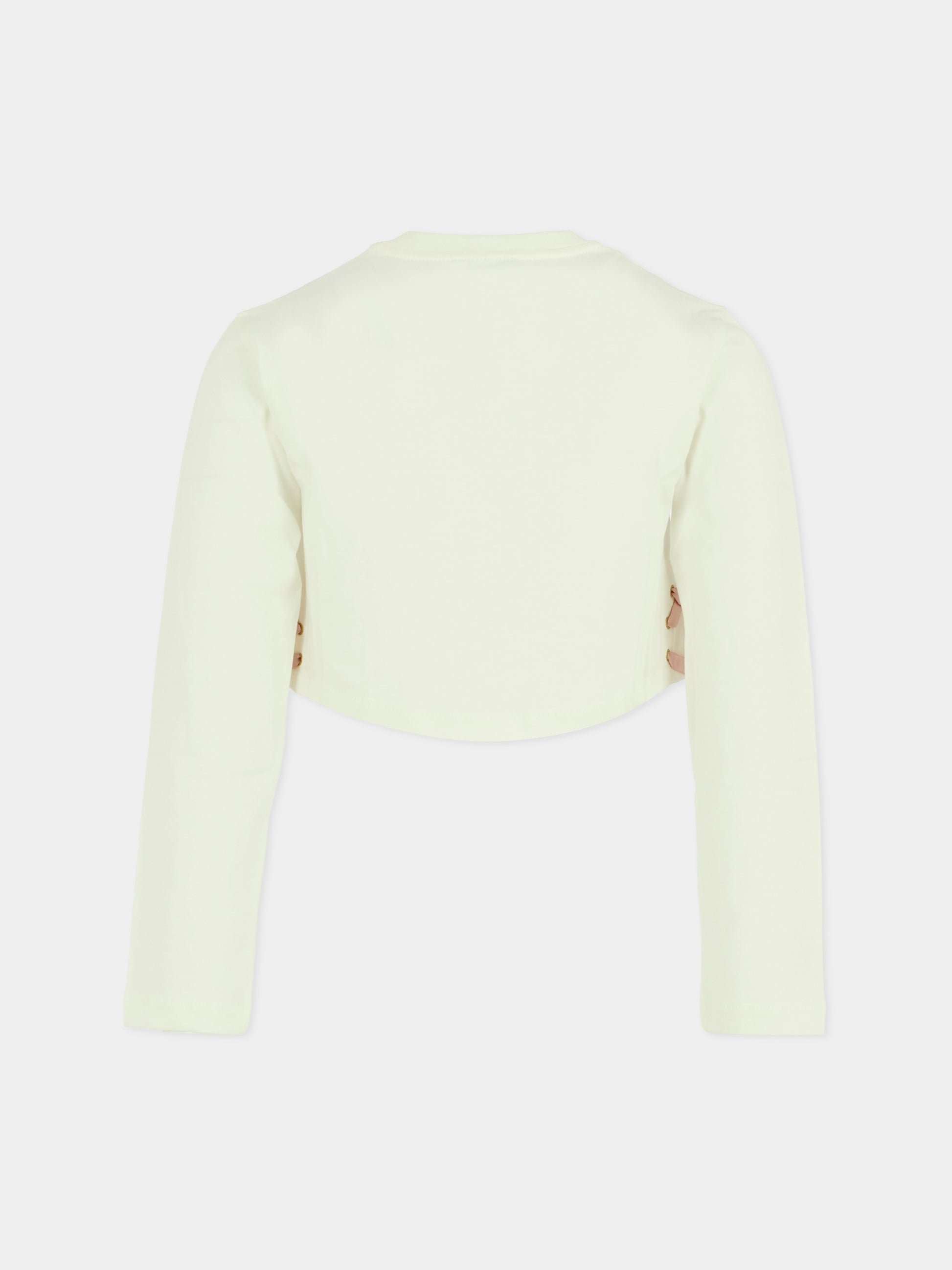 Colore: Avorio Descrizione: T-shirt crop avorio a maniche lunghe, con girocollo a costine e laccetti sui lati. È decorata con patch logato in metallo sulla parte anteriore. Made in Italy Dettagli: 100% Cotton. Lavare a 30°C.