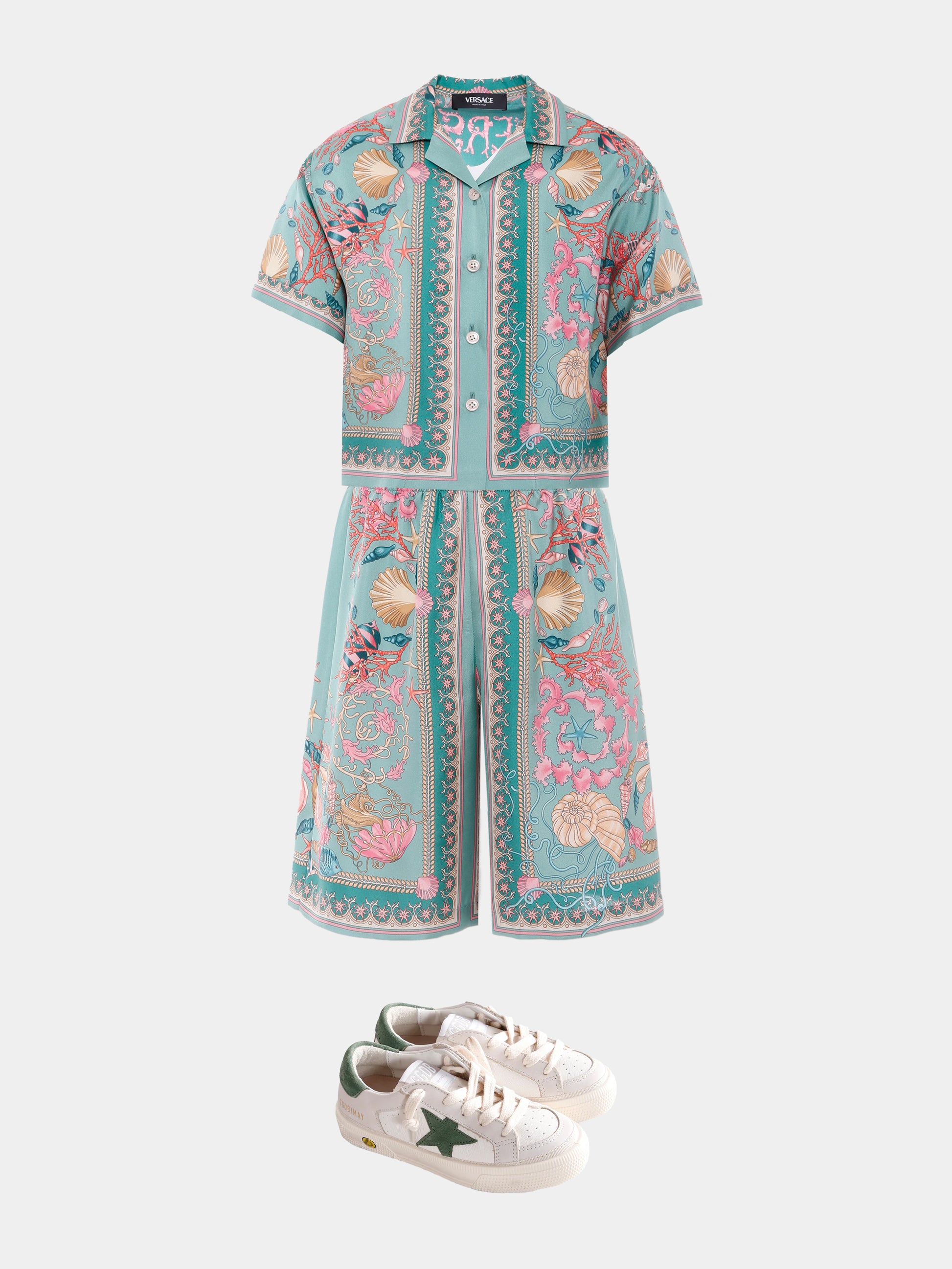 Colore: Multicolor Descrizione: Shorts in twill di seta con elastico in vita; questo capo fa parte della capsule La Vacanza ed è caratterizzato da una stampa Underwater Barocco che raffigura le iconiche foglie di acanto e motivi di fiori, conchiglie, coralli e stelle marine. Made in Italy Dettagli: 100% Seta. Lavare a secco.