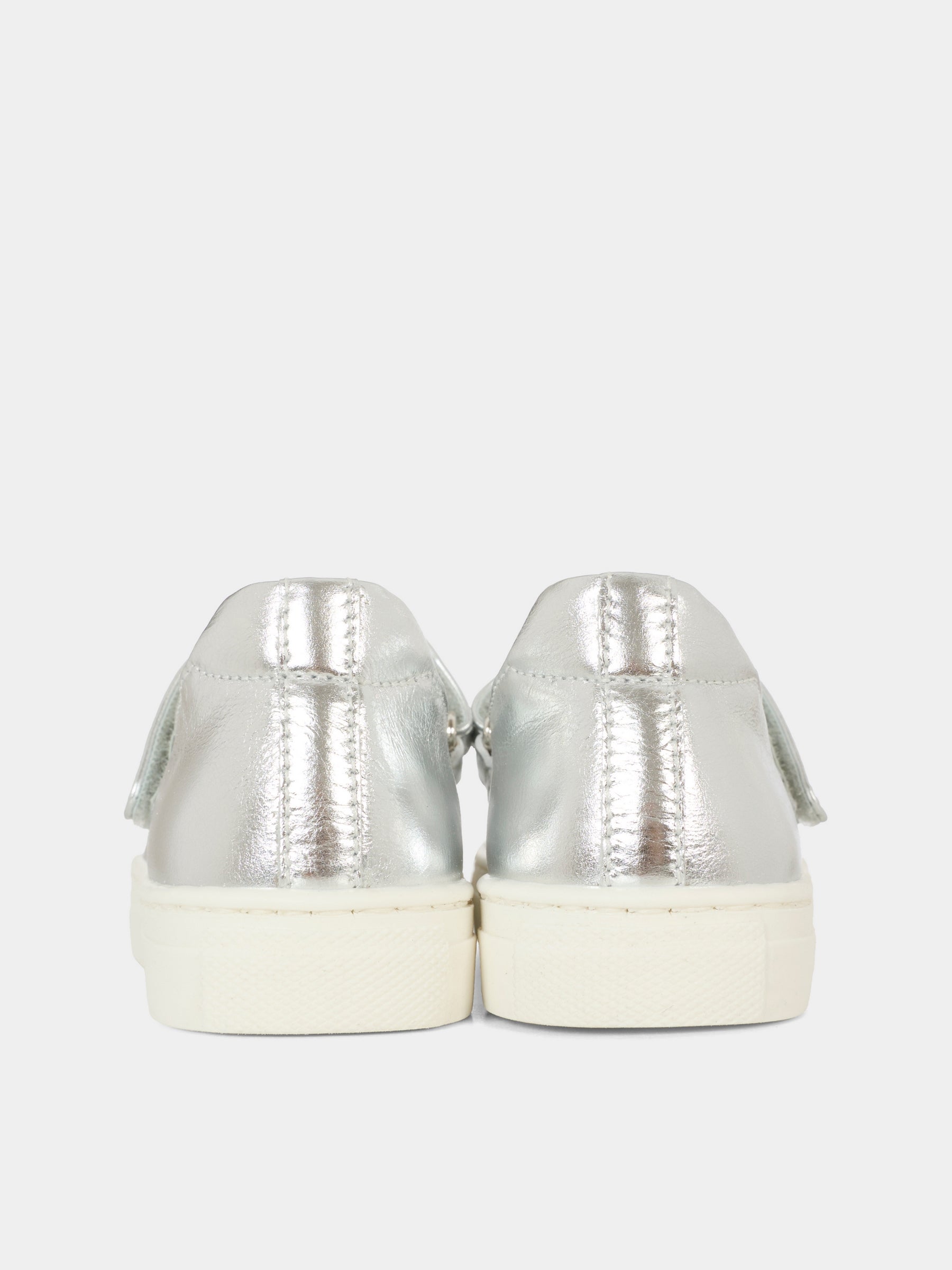Colore: Argento Descrizione: Ballerine argento metallizzato in pelle, con suola in gomma bianca, cinturino con chiusura a strappo e punta tonda. Sono decorate con patch a forma di Teddy Bear, applicato sulla parte anteriore e logo laterale. Made in Italy Dettagli: 100% Pelle.