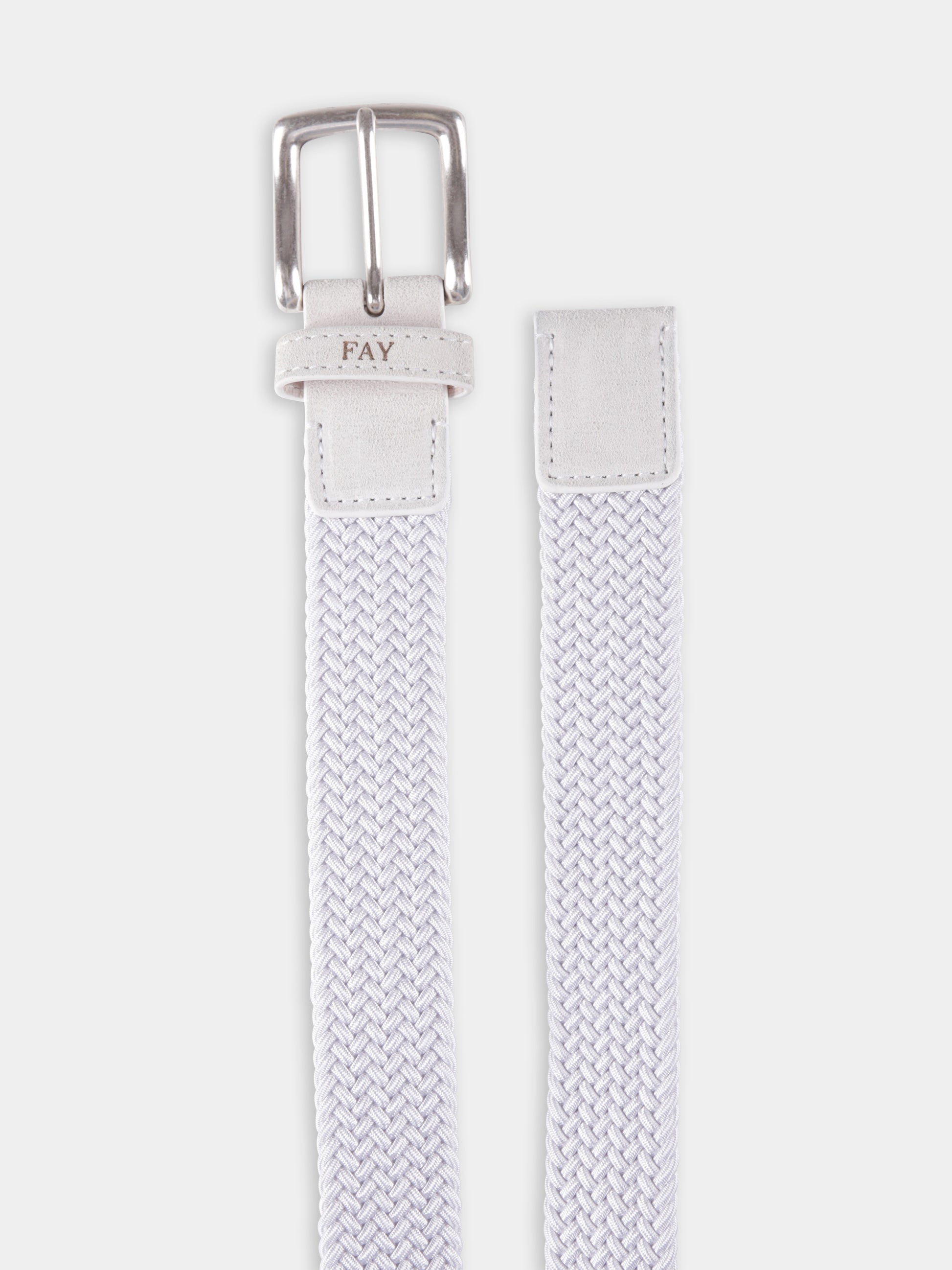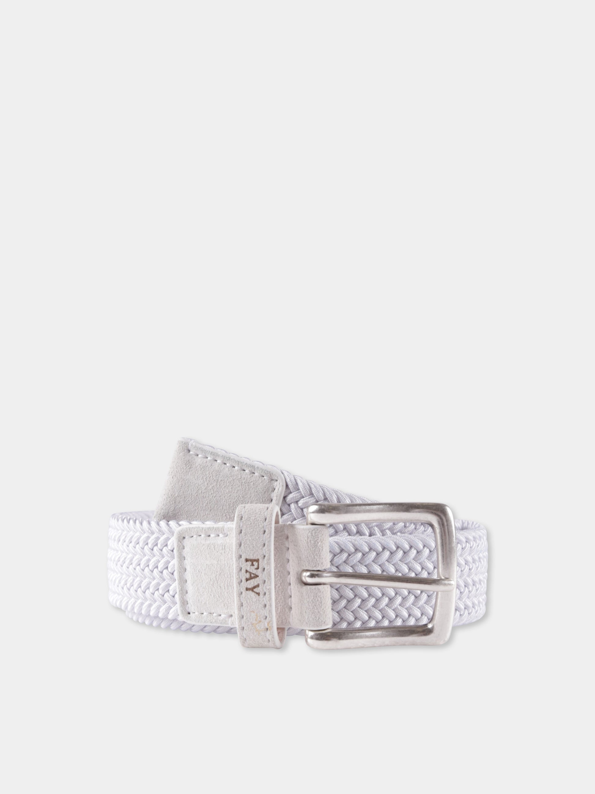 Colore: Bianco Descrizione: Cintura bianca in tessuto stretch intrecciato, chiusura con fibbia. È decorata con logo frontale. Made in Italy Dettagli: 60% Viscosa, 40% Elastan.