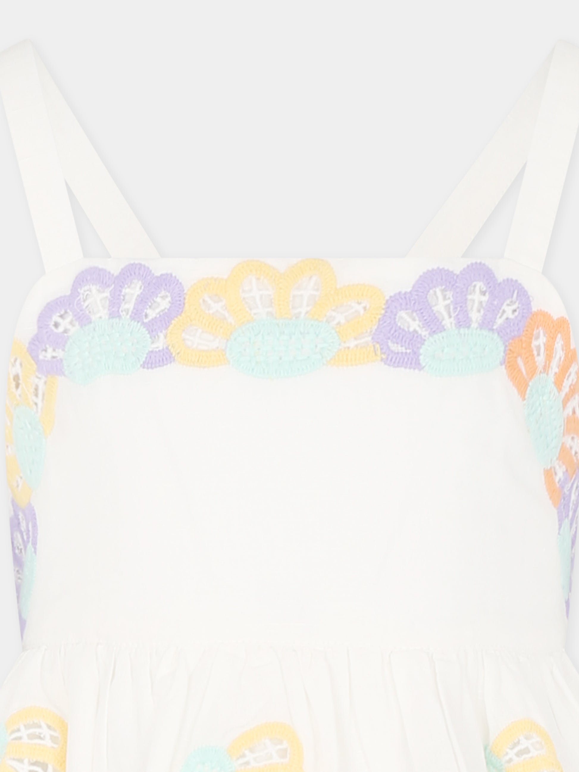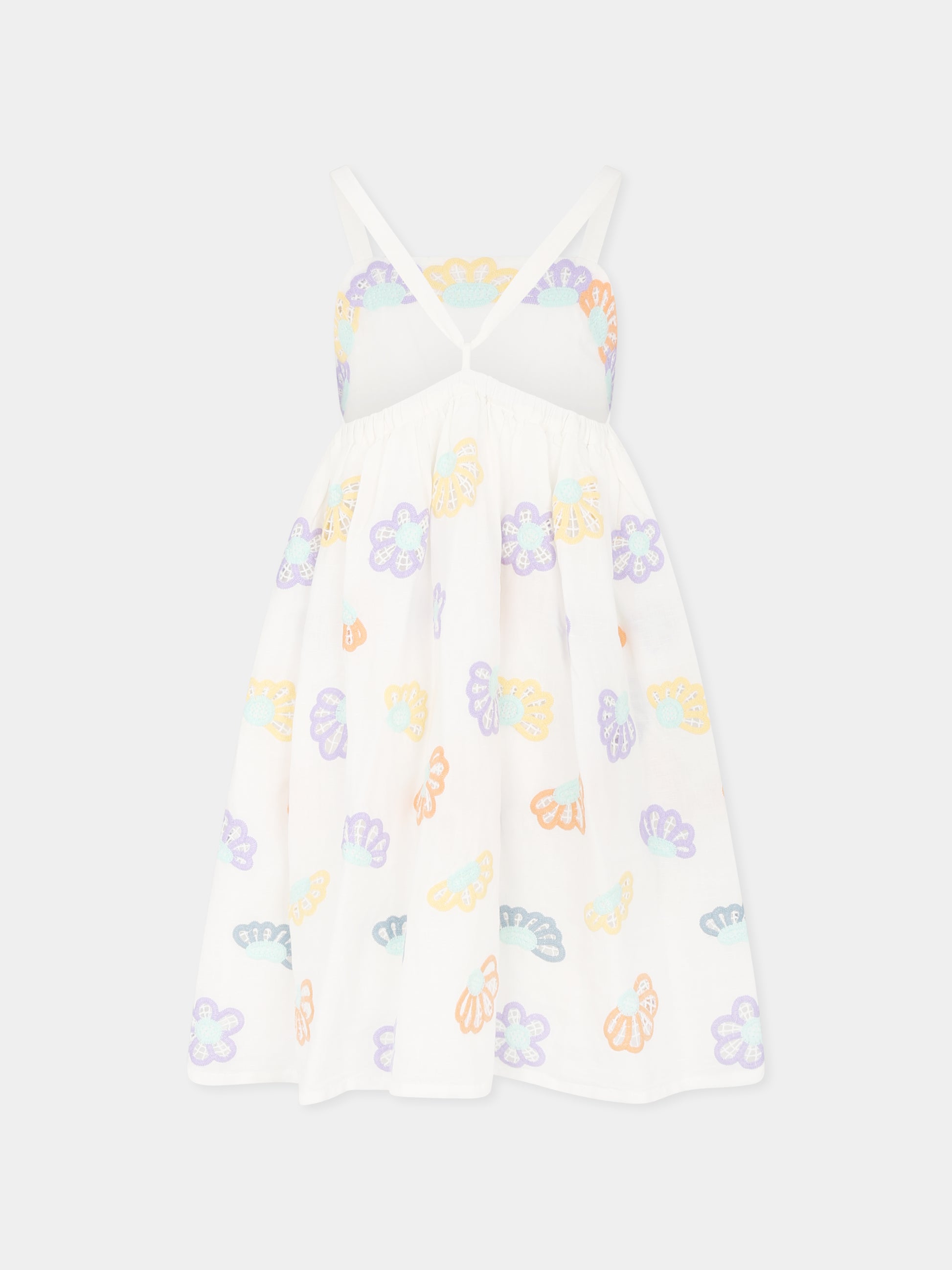 Colore: Bianco Descrizione: Vestito bianco in misto lino e cotone, con spalline, scollo quadrato ed elastico sul retro. È decorato con ricamo floreale e dettagli traforati all-over. Dettagli: 100% Cotone organico. Lavare a 30°C.