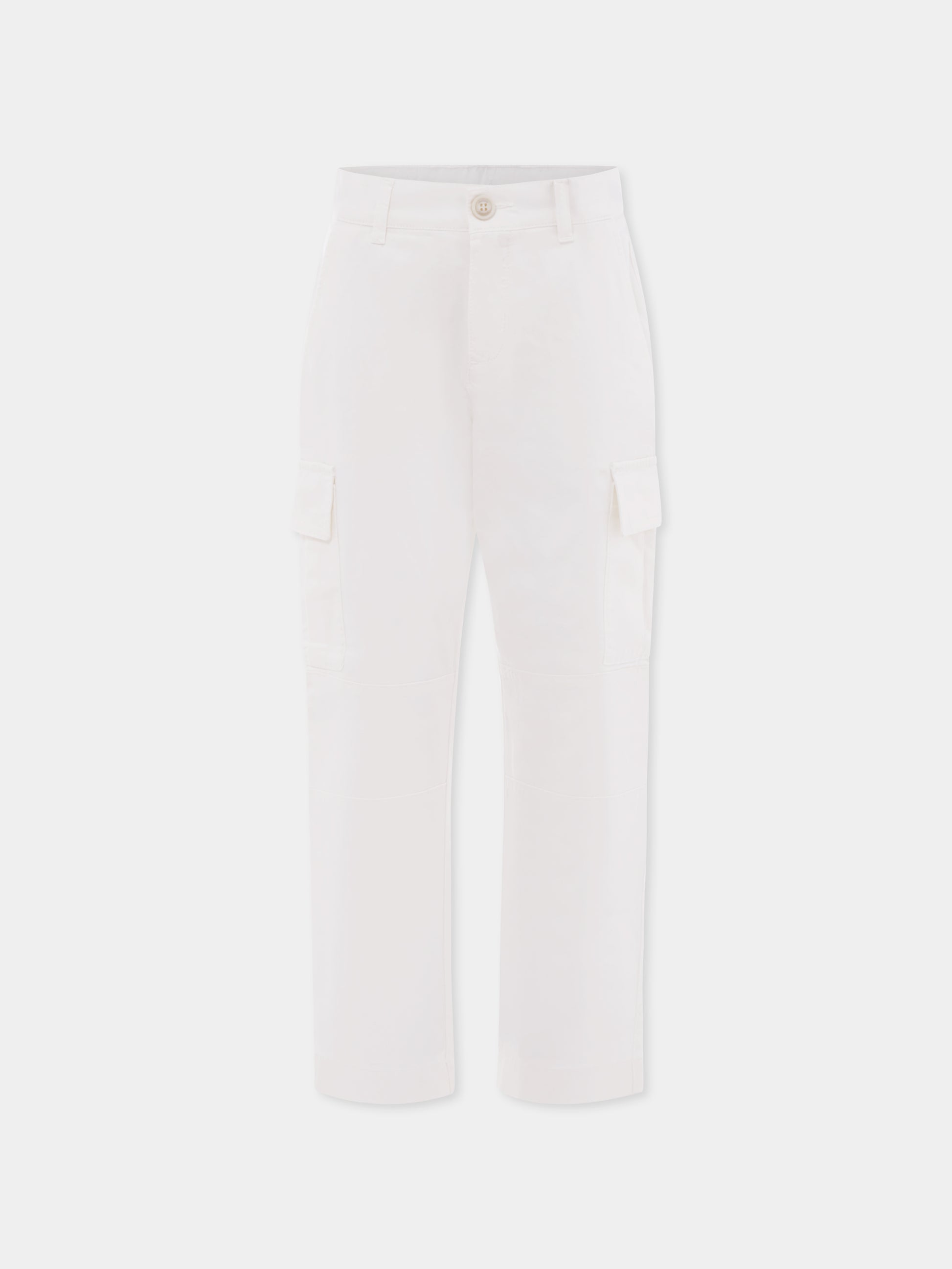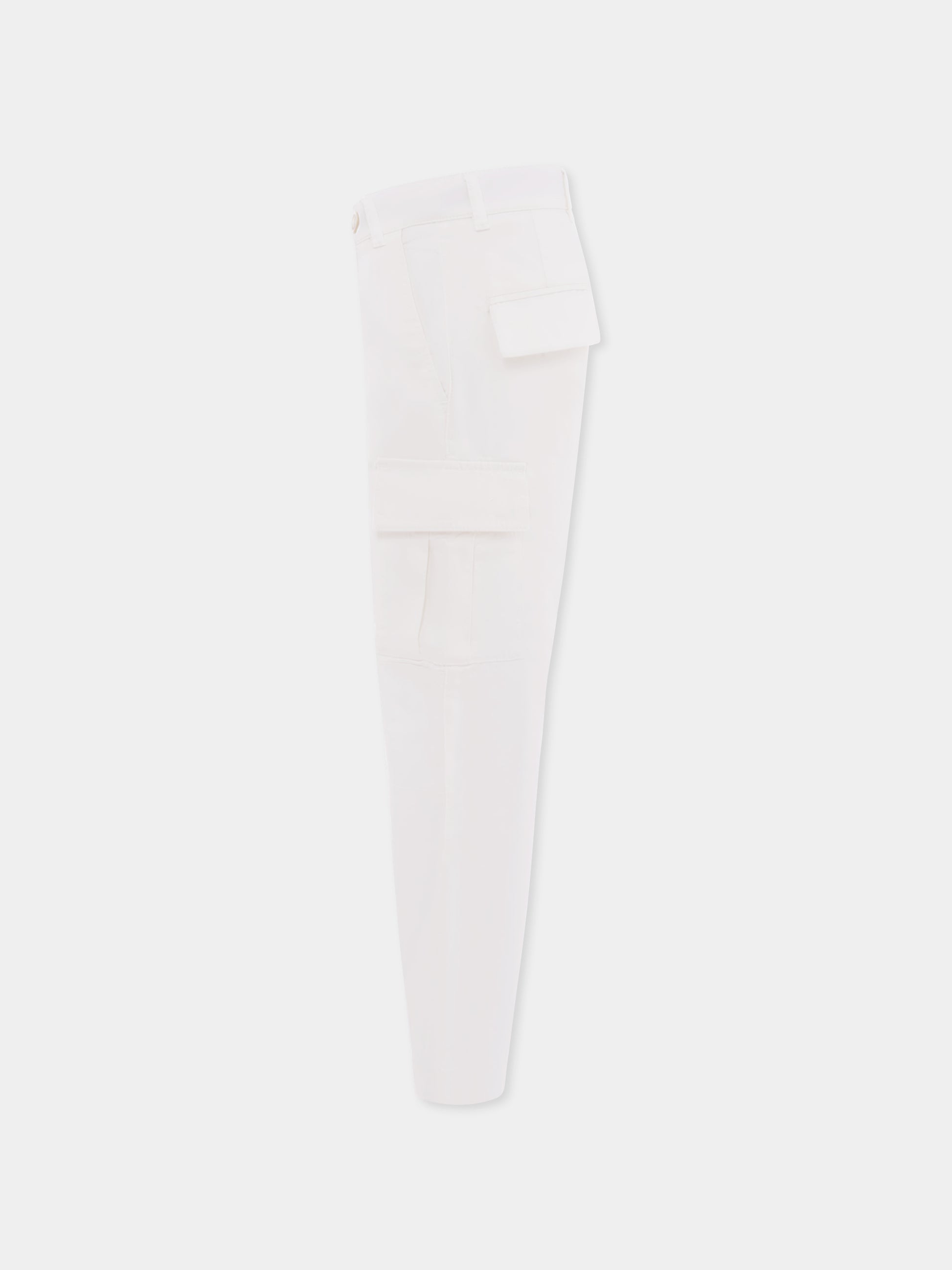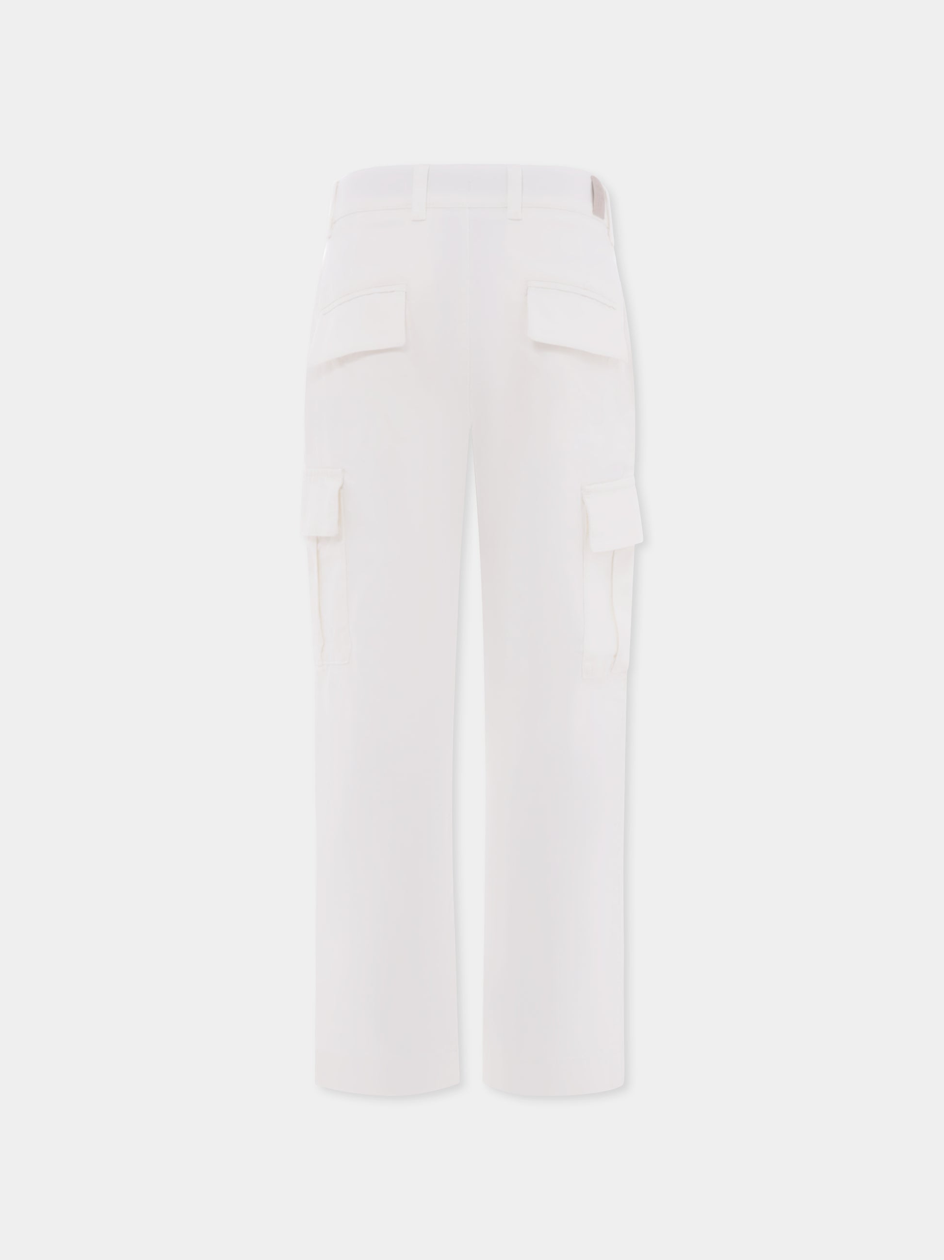 Colore: Avorio Descrizione: Pantaloni avorio in misto cotone, con passanti per cintura, chiusura frontale con zip e bottone, tasche laterali, tasche con patta sul retro e tasche cargo sui lati. Sono decorati con patch logata sul retro. Dettagli: 75% Cotone, 23% Lino, 2% Elastan. Lavare a 30°C.