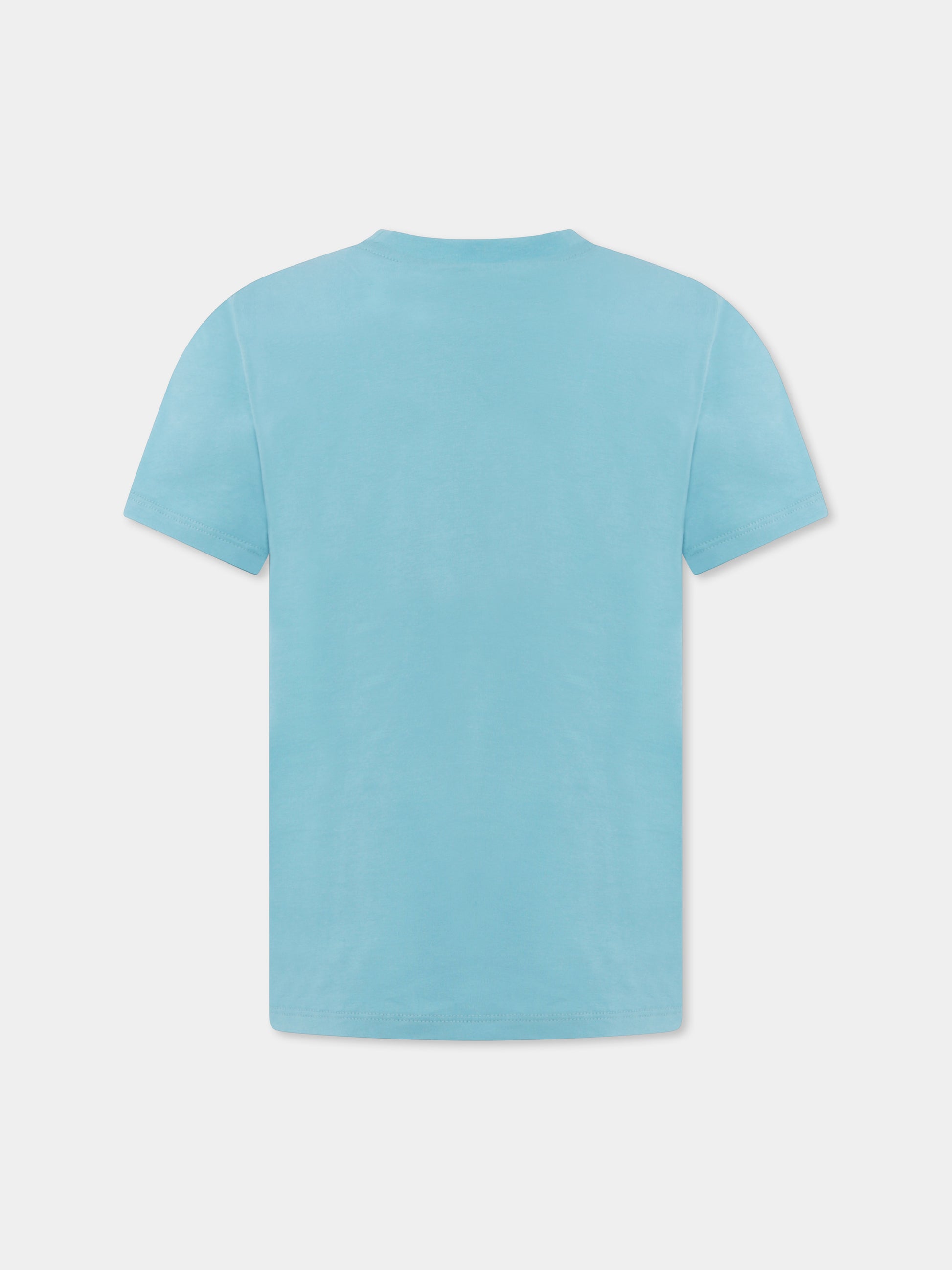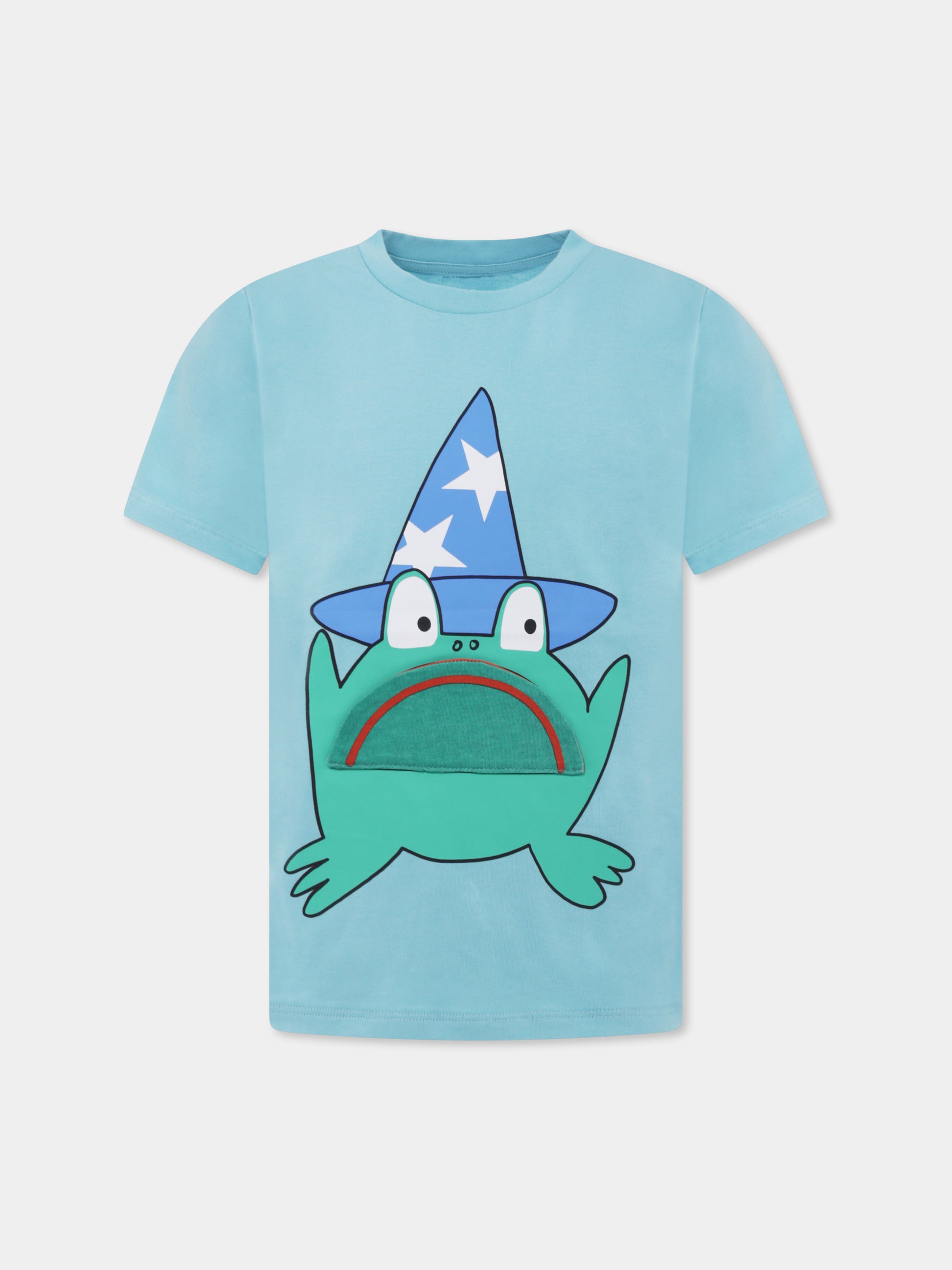 Colore: Azzurro Descrizione: T-shirt azzurra in cotone organico certificato GOTS, con maniche corte e girocollo a cotine. È decorata con stampa rana e bocca che si apre e chiude sulla parte anteriore. Dettagli: 100% Cotone organico. Lavare a 30°C.