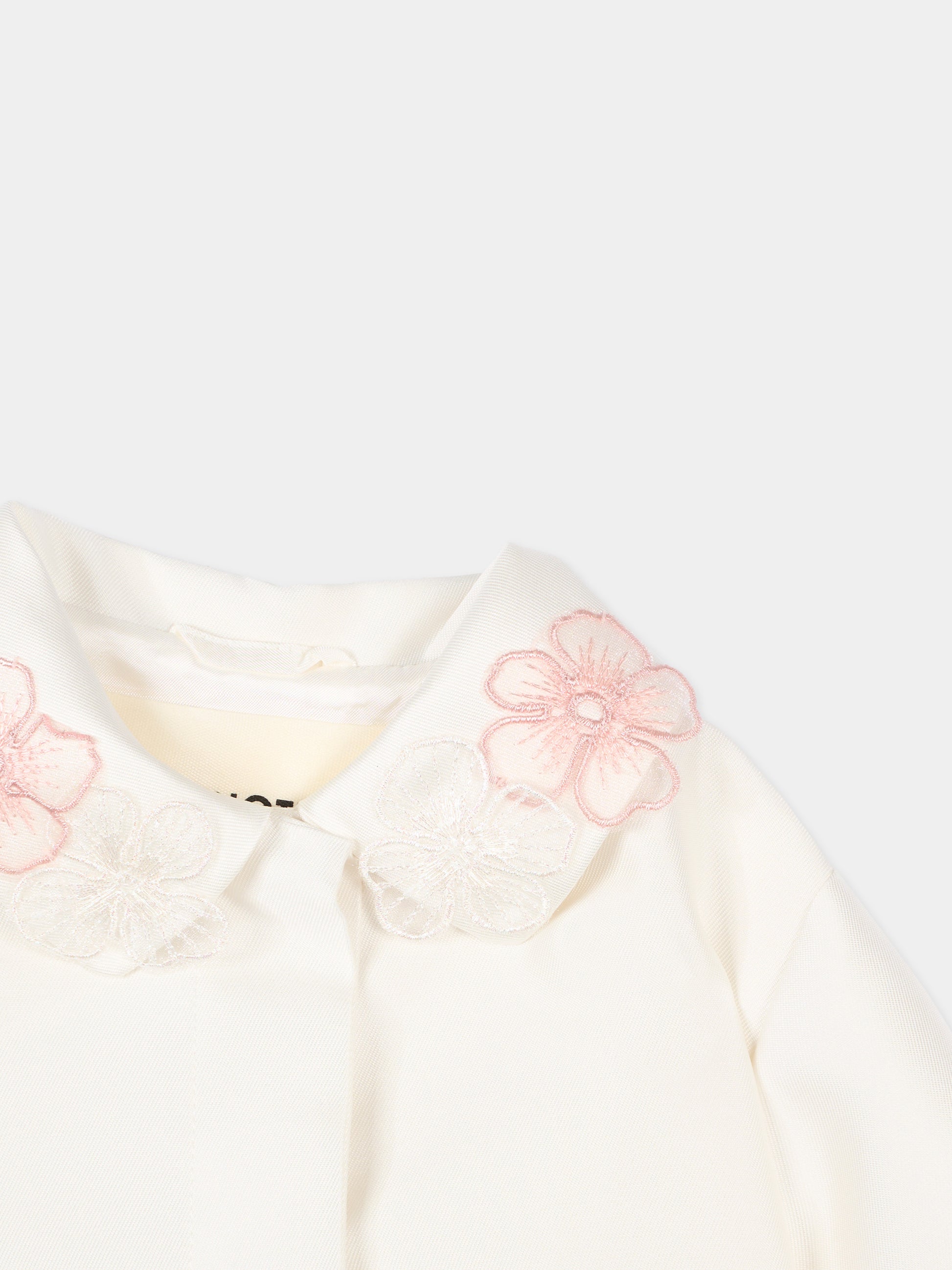 Giacca avorio in tessuto liscio lucido Simonetta dalla linea pulita e leggermente corta. Colletto classico impreziosito da ricami floreali applicati in rilievo nei toni del rosa cipria e dell’avorio che introducono una delicata nota bon ton. Maniche lunghe dritte e chiusura frontale coperta mantengono il davanti essenziale, lasciando risaltare il lavoro decorativo sullo scollo.