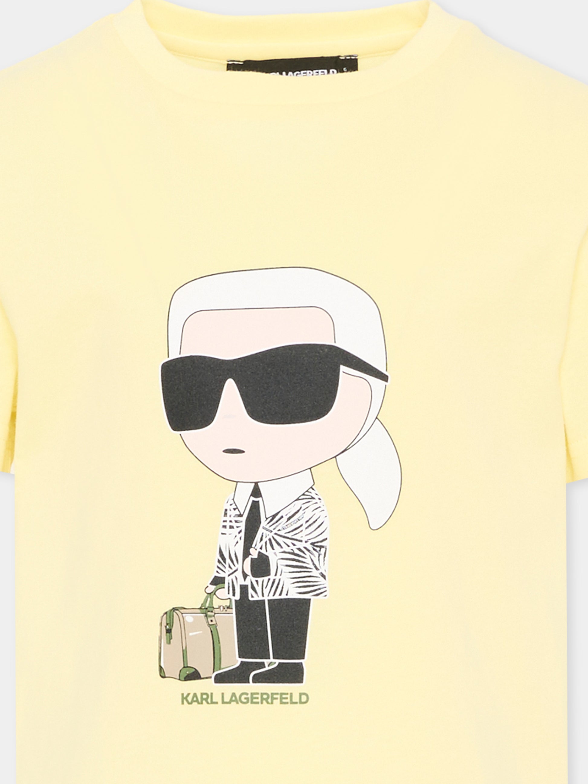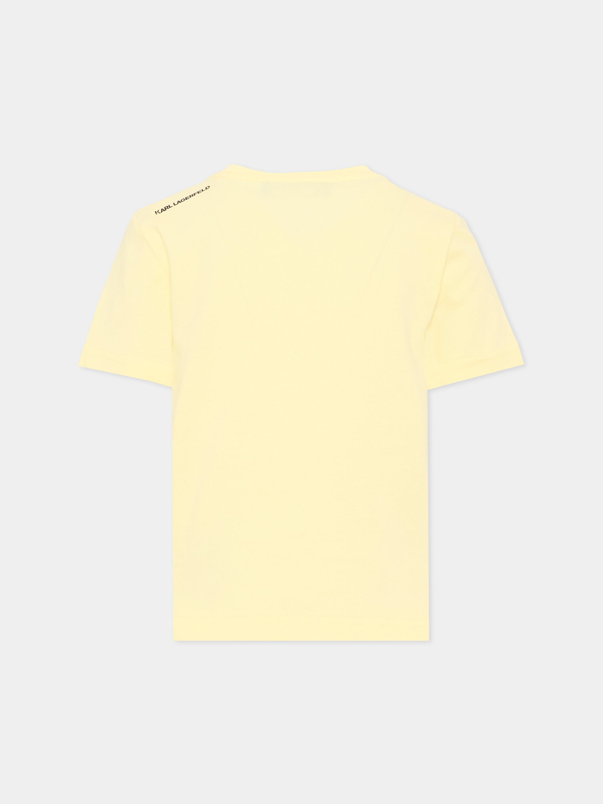 T-shirt a manica corta in jersey di cotone giallo Karl Lagerfeld Kids con grafica Ikonik Karl frontale dal tratto giocoso. Il modello presenta girocollo rifinito in maglia liscia e maniche corte dal taglio dritto che mantengono una linea pulita. Sul retro una piccola scritta logo a contrasto vicino alla spalla richiama il DNA grafico del brand. Volume regolare e fondo lineare completano una silhouette essenziale valorizzata dal motivo illustrato centrale.