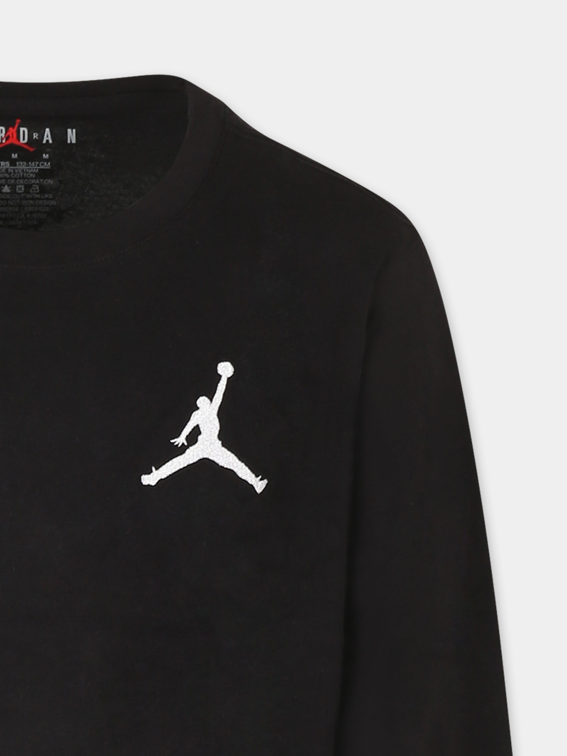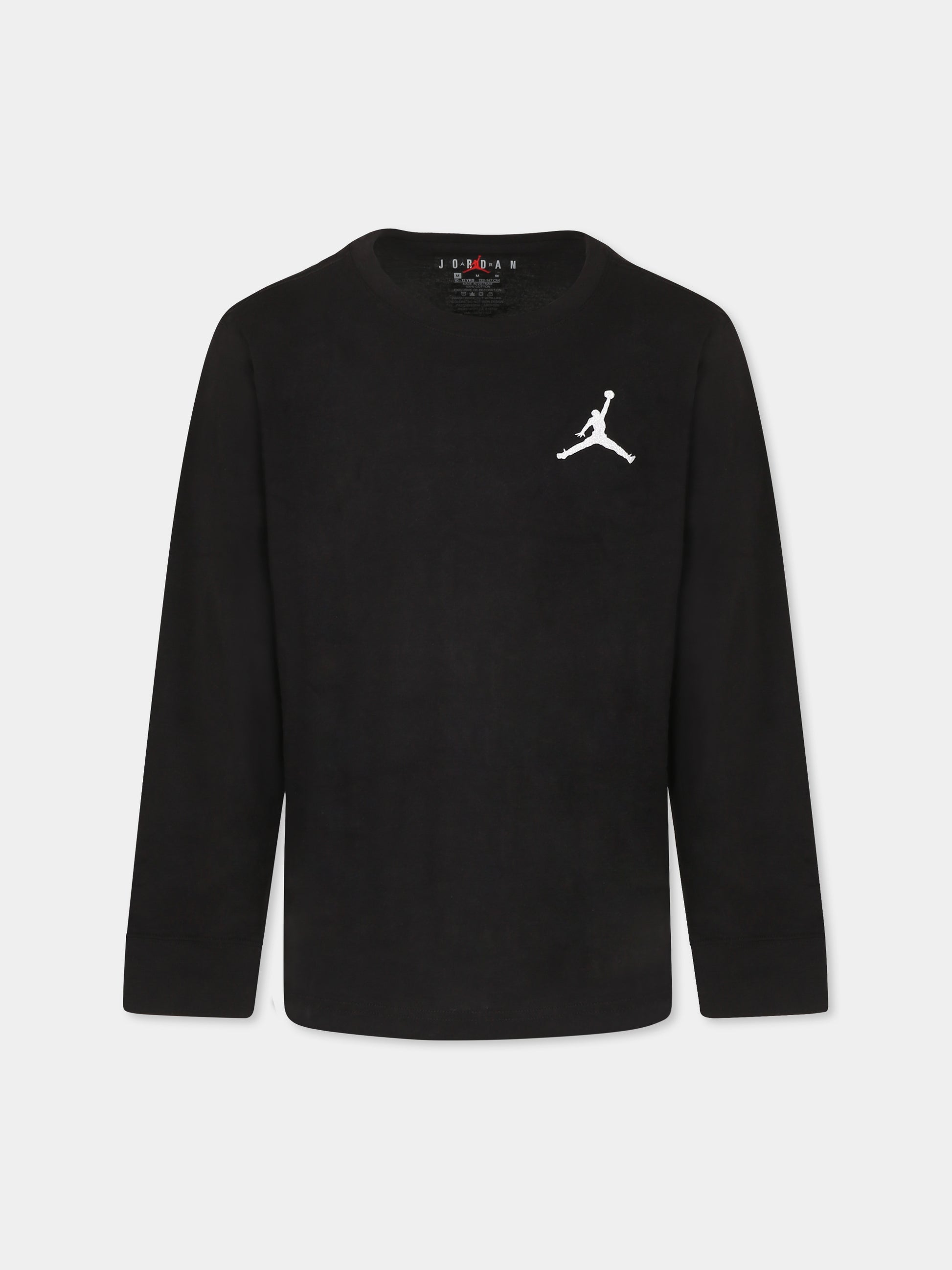 Colore: Nero Descrizione: T-shirt nera in cotone, a maniche lunghe, con girocollo e polsini a costine. È decorata con iconico Jumpman ricamato sul petto. Dettagli: 100% Cotone. Lavare a 30°C.