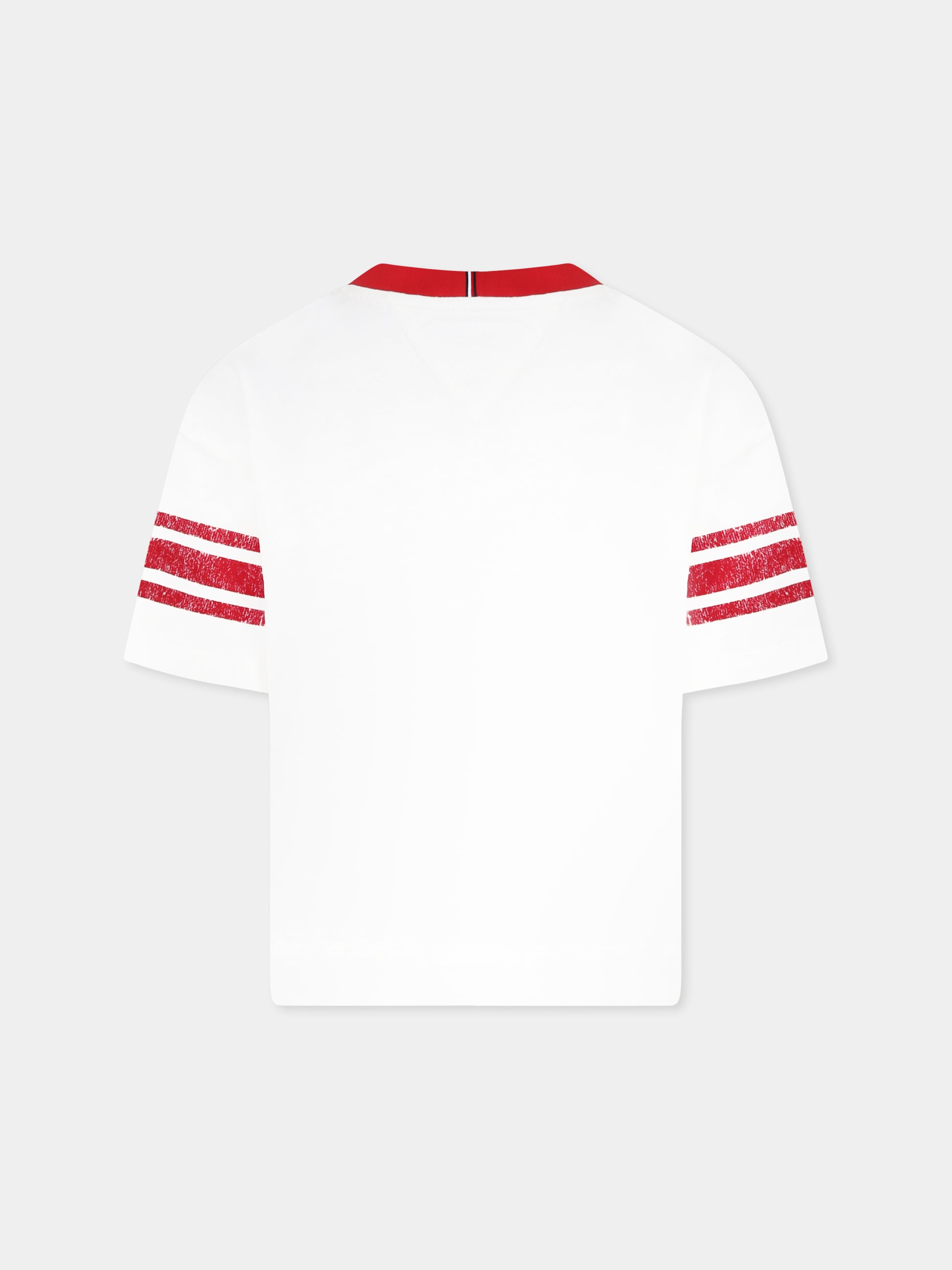 Colore: Avorio Descrizione: T.shirt avorio in misto cotone organico, con maniche corte, girocollo a coastine e dettagli a righe rosse effetto vintage sulle maniche. È decorata con logo vintage sulla parte anteriore e iconica bandierina ricamata. Dettagli: 100% Cotone. Lavare a 30°C.