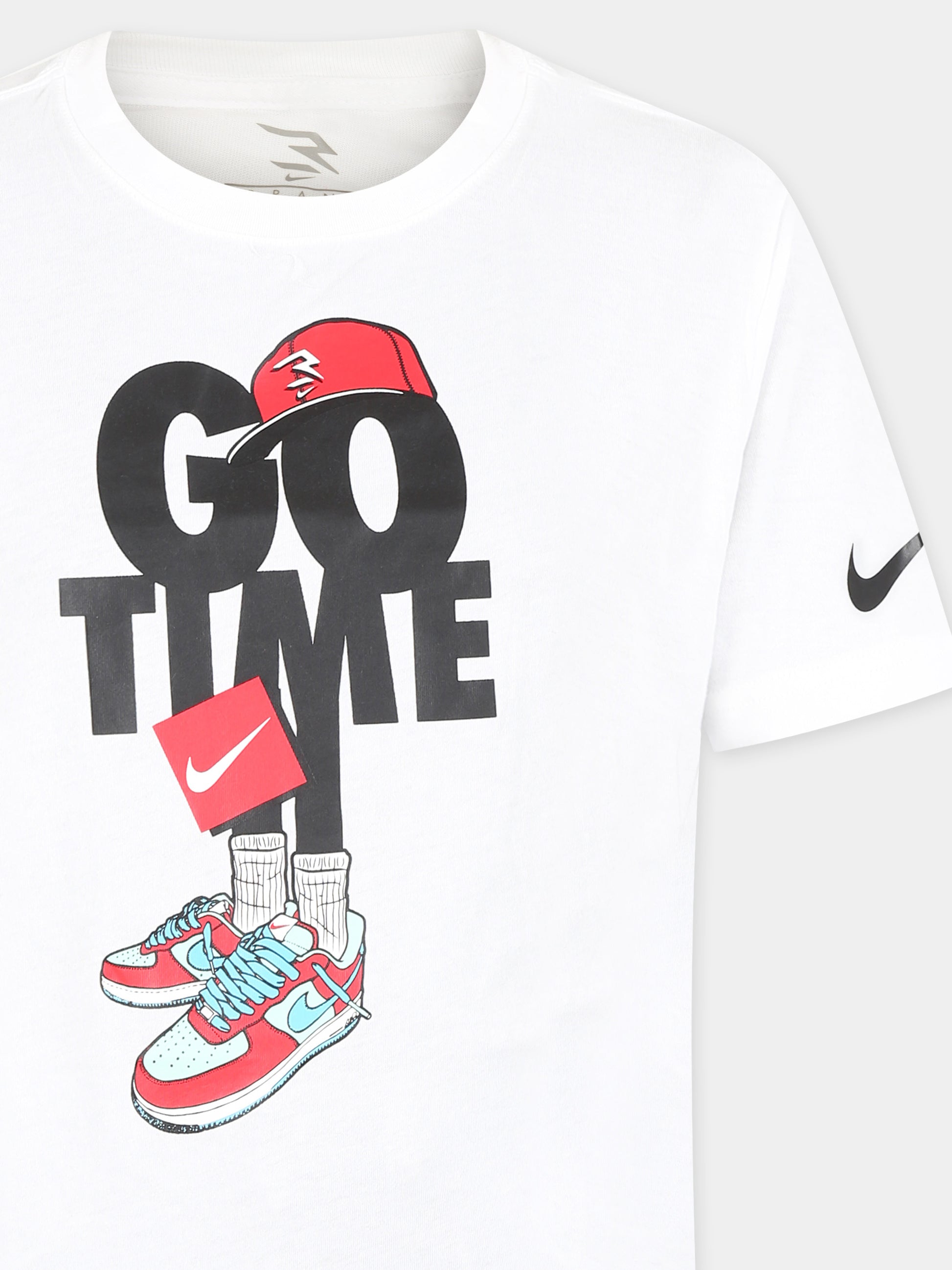 Colore: Bianco Descrizione: T-shirt bianca in misto cotone, con maniche corte e girocollo a costine. È decorata con scritta Go Time sulla parte anteriore e iconico swoosh sulla manica. Dettagli: 60% Cotone, 40% Poliestere. Lavare a 30°C.