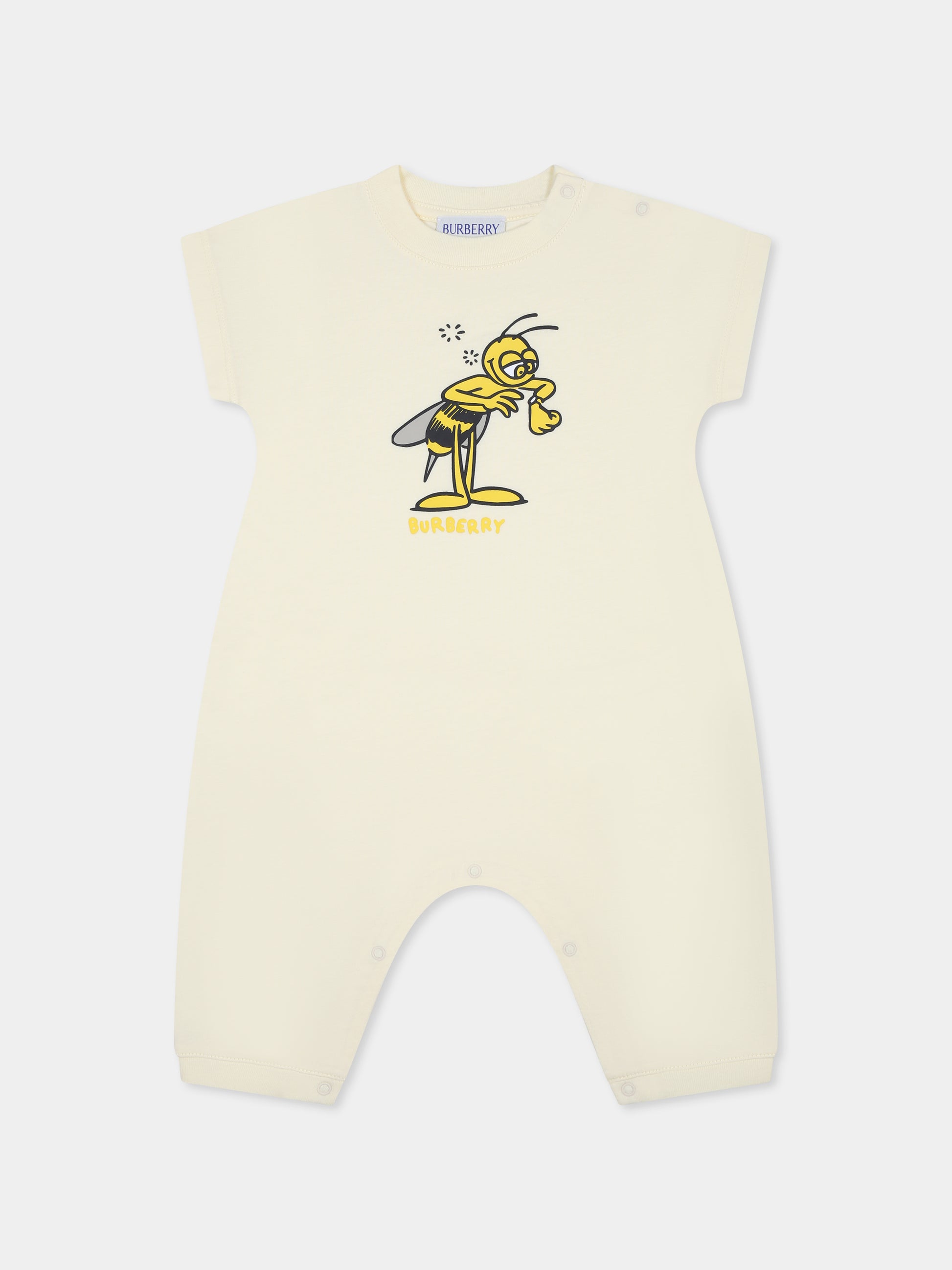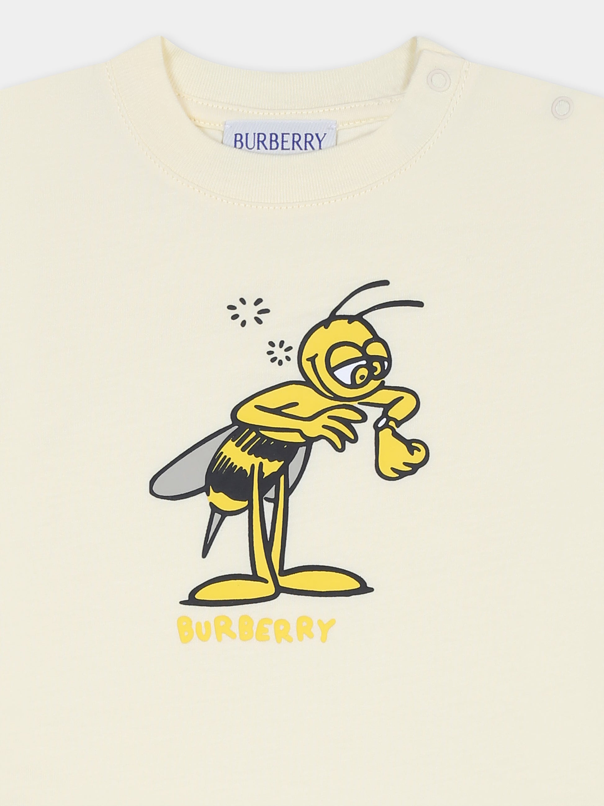 Colore: Giallo Descrizione: Pagliaccetto giallo del luxury brand Burberry Kids, in morbido jersey di cotone leggero, con maniche corte, girocollo a costine, chiusura con bottoni automatici sulla spalla e tra le gambe. È decorato con stampa ape e logo sulla parte anteriore. Questo capo é realizzato con almeno il 70% di cotone organico. Questo capo é realizzato con almeno il 50% di materiali riciclati. Dettagli: 100% Cotone. Lavare a 30°C.