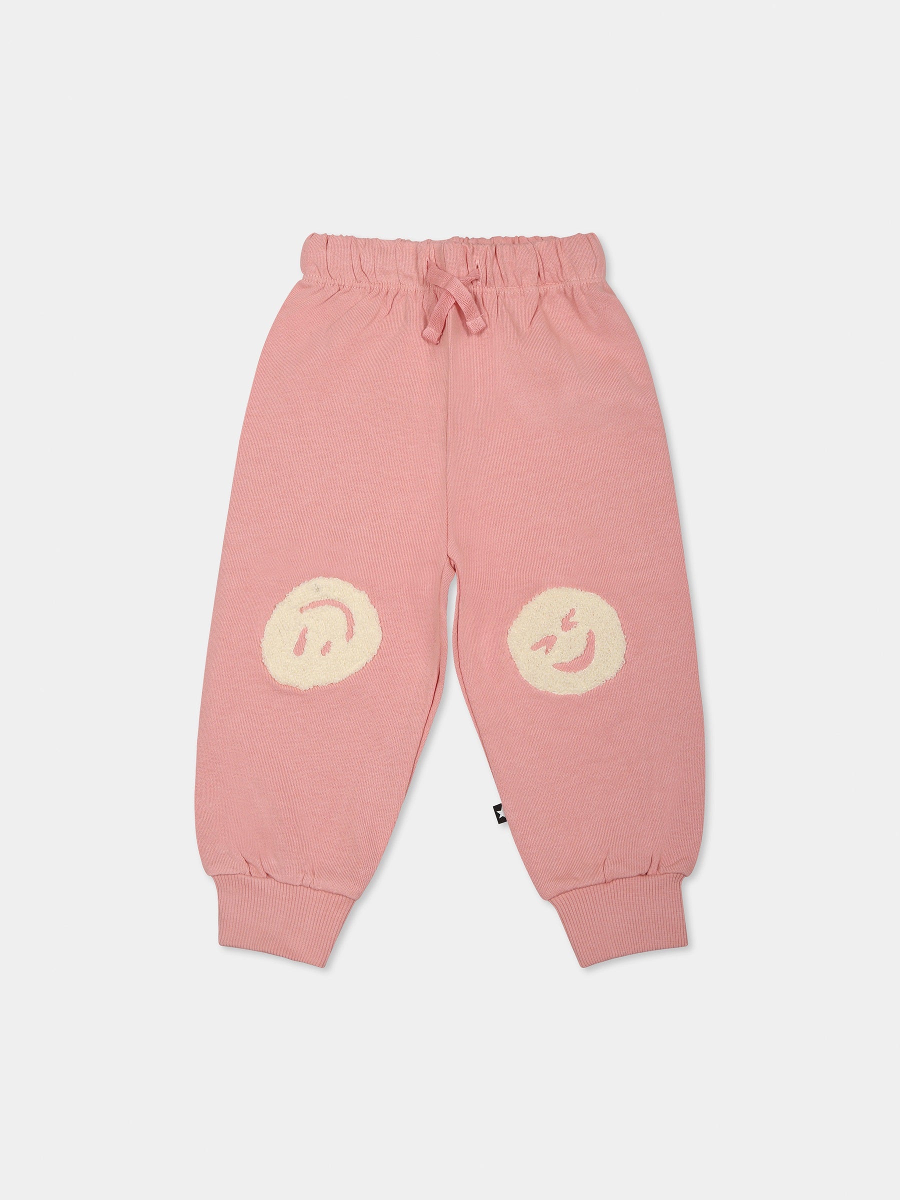 Colore: Rosa Descrizione: Pantaloni rosa in cotone organico garzato certificato GOTS, con vita elasticizzata, coulisse e caviglie a costine. Sono decorati con smile di spugna sulle gambe. Dettagli: 100% Cotone organico. Lavare a 30°C.