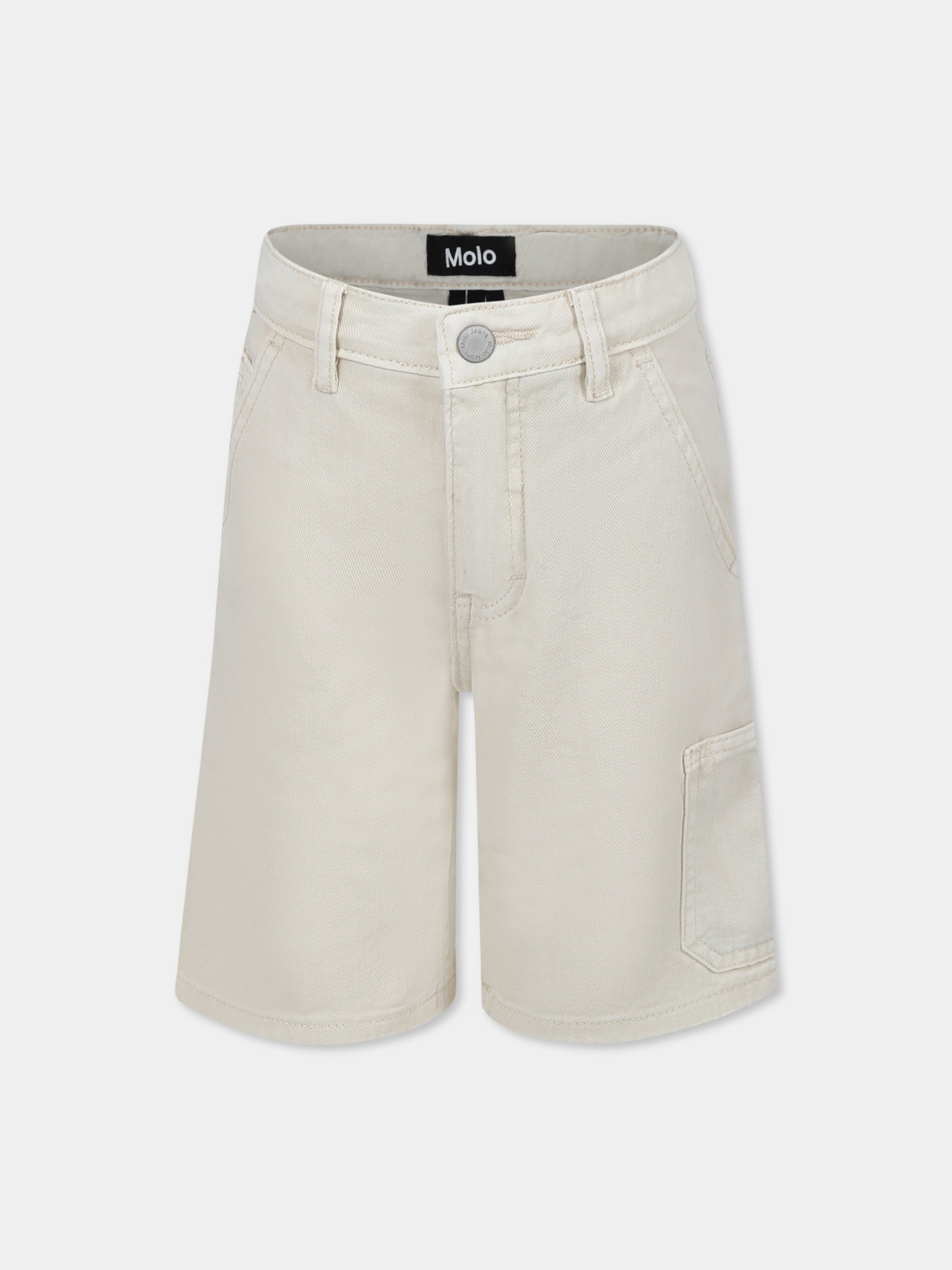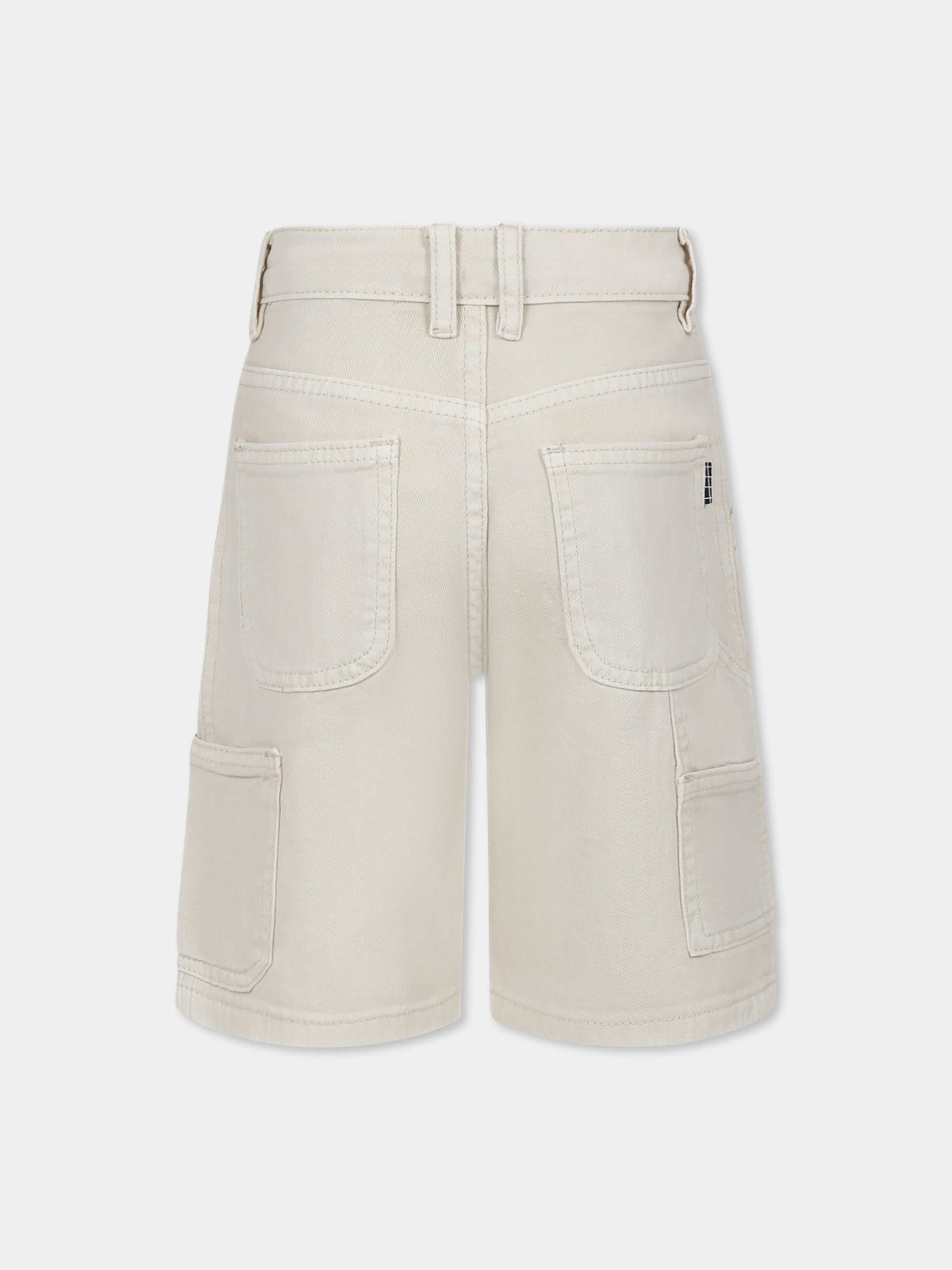 Colore: Avorio Descrizione: Shorts avorio cinque tasche con passanti per cintura, chiusura frontale con zip e bottone automatico, vita regolabile grazie ad elastico interno con bottoni e tasche sui lati. Sono decorati con patch logata sul retro. Dettagli: 100% Cotone. Lavare a 30°C.