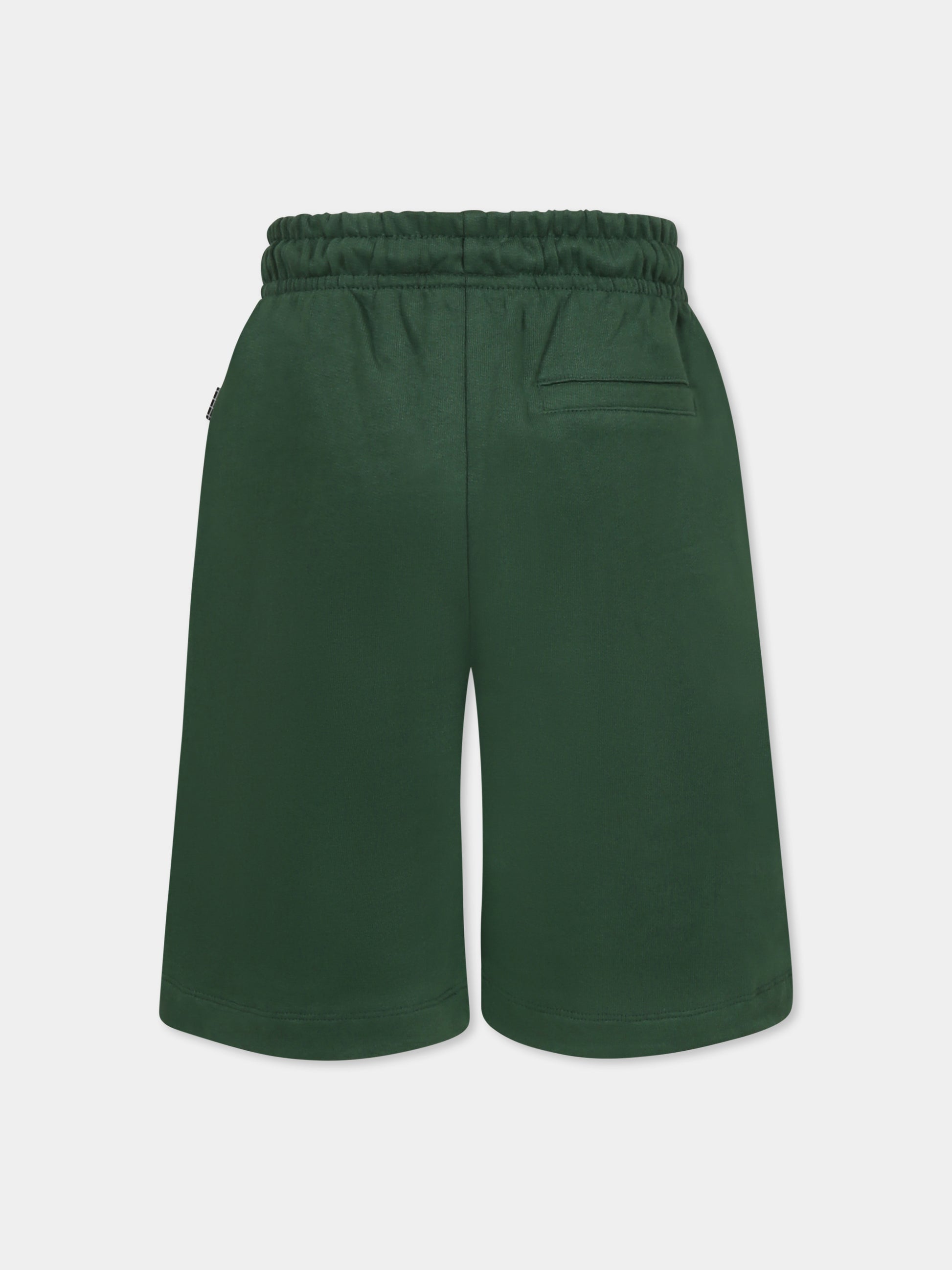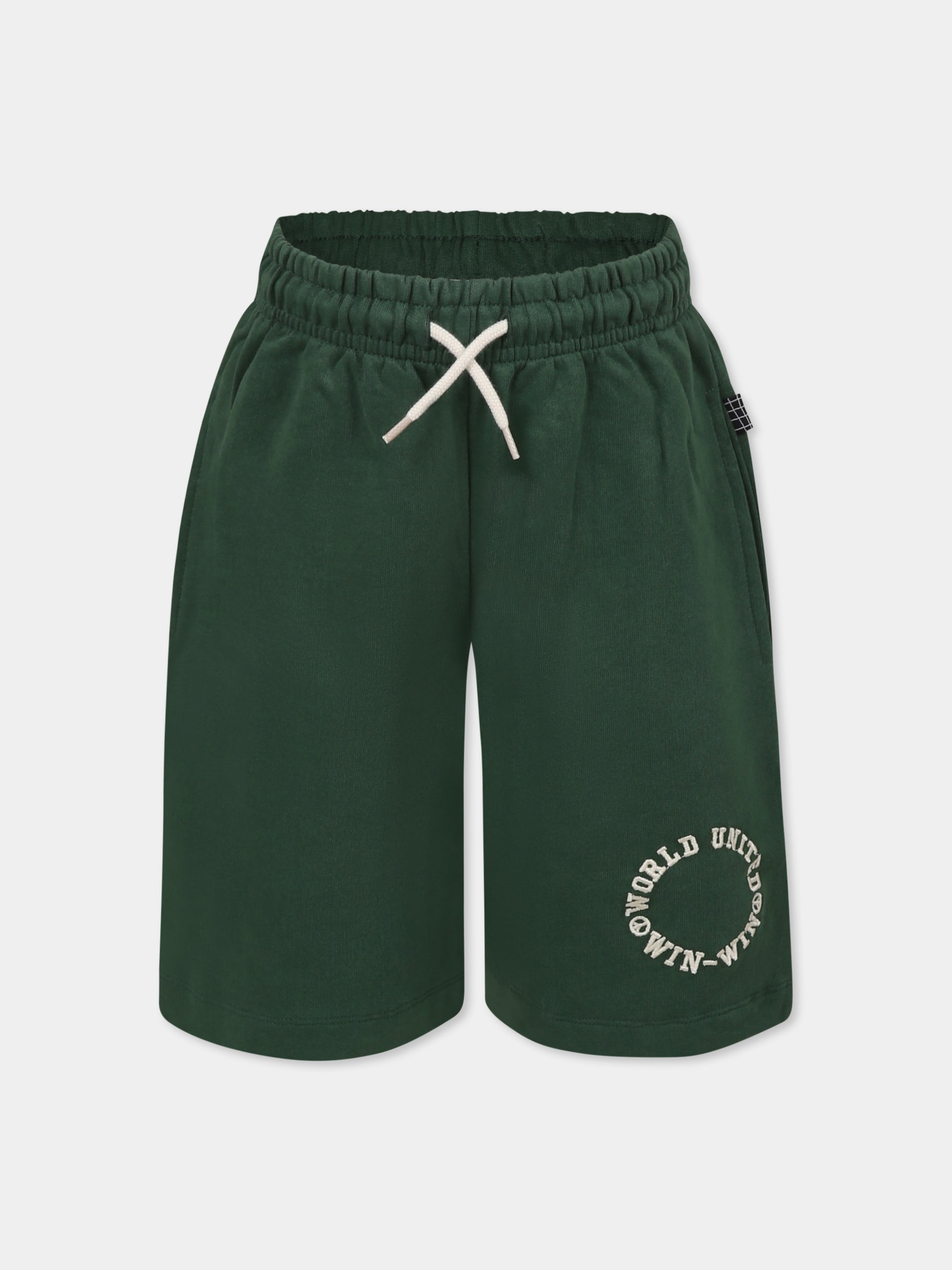 Colore: Verde Descrizione: Shorts verdi in cotone organico certificato GOTS, con vita elasticizzata, coulisse e tasche laterali. Sono decorati con scritta ricamata su una gamba. Dettagli: 100% Cotone organico. Lavare a 30°C.