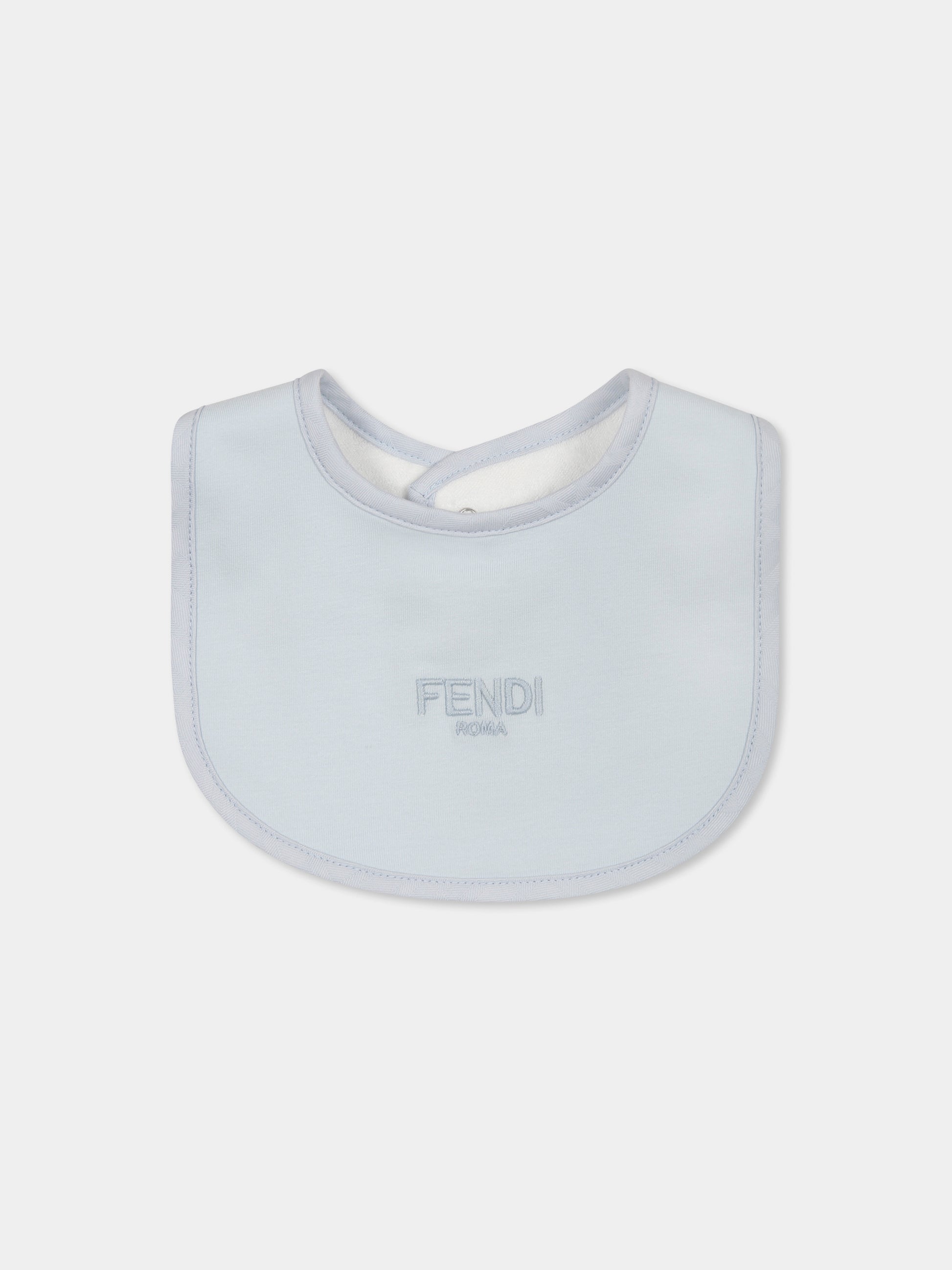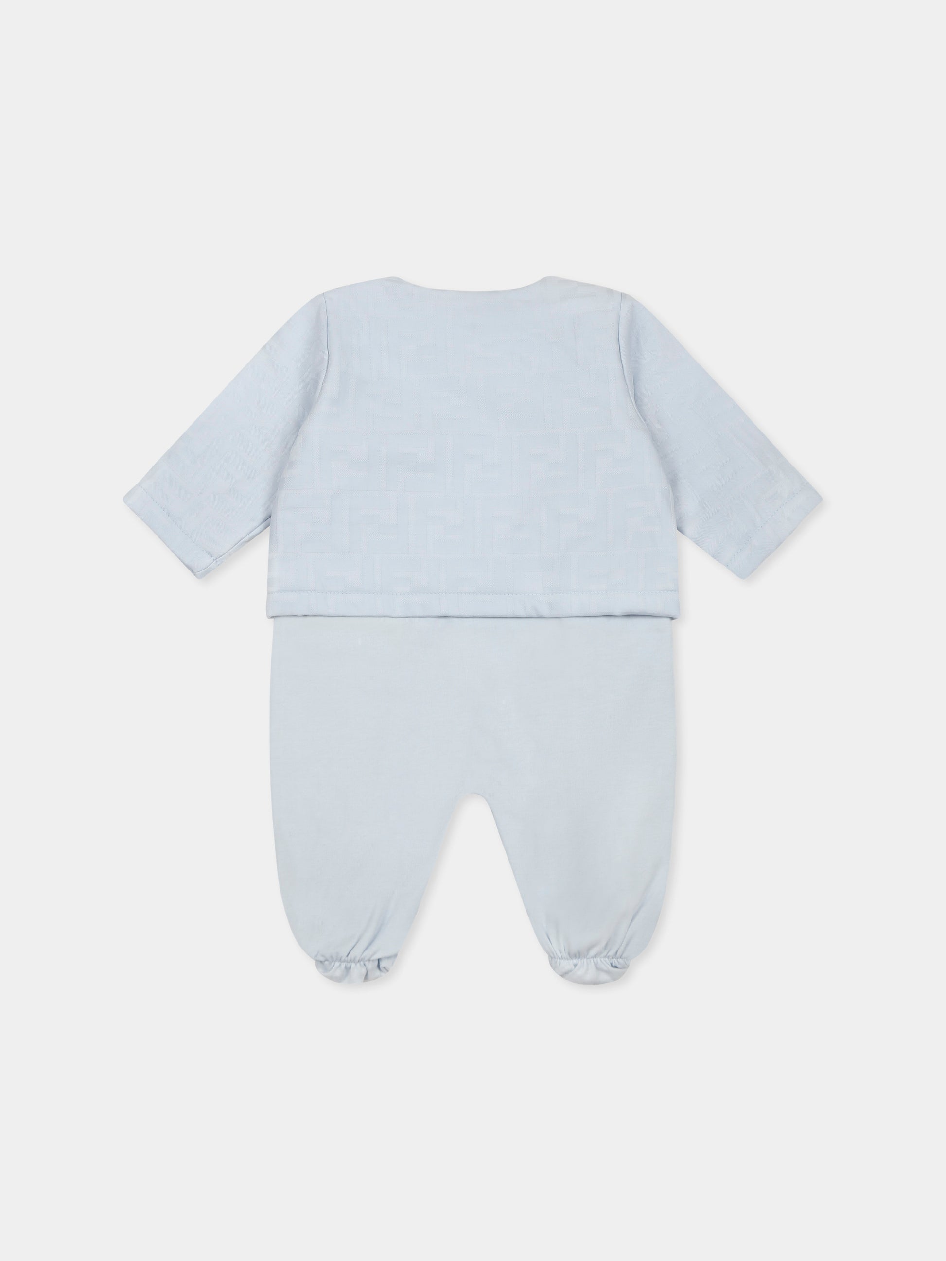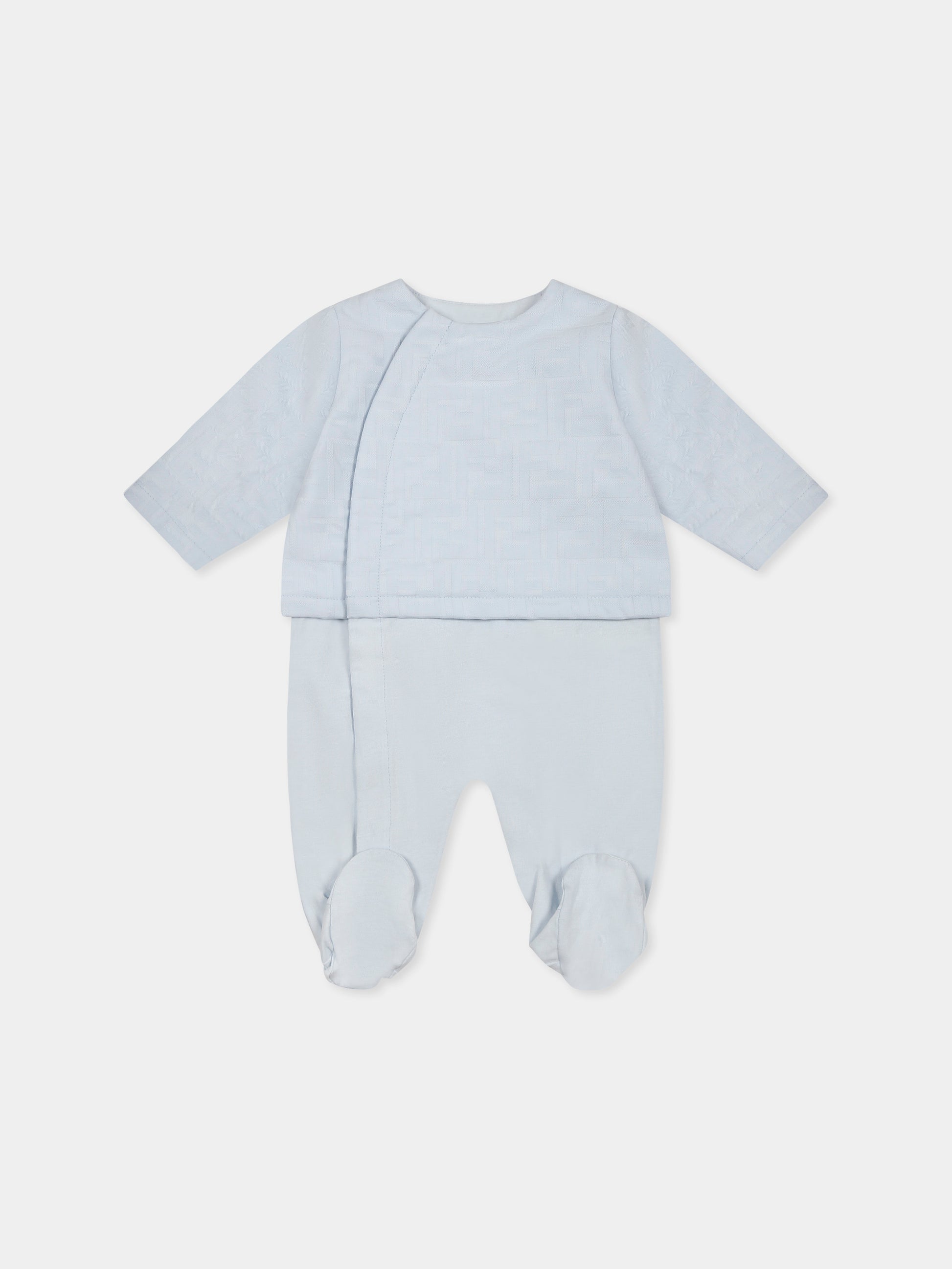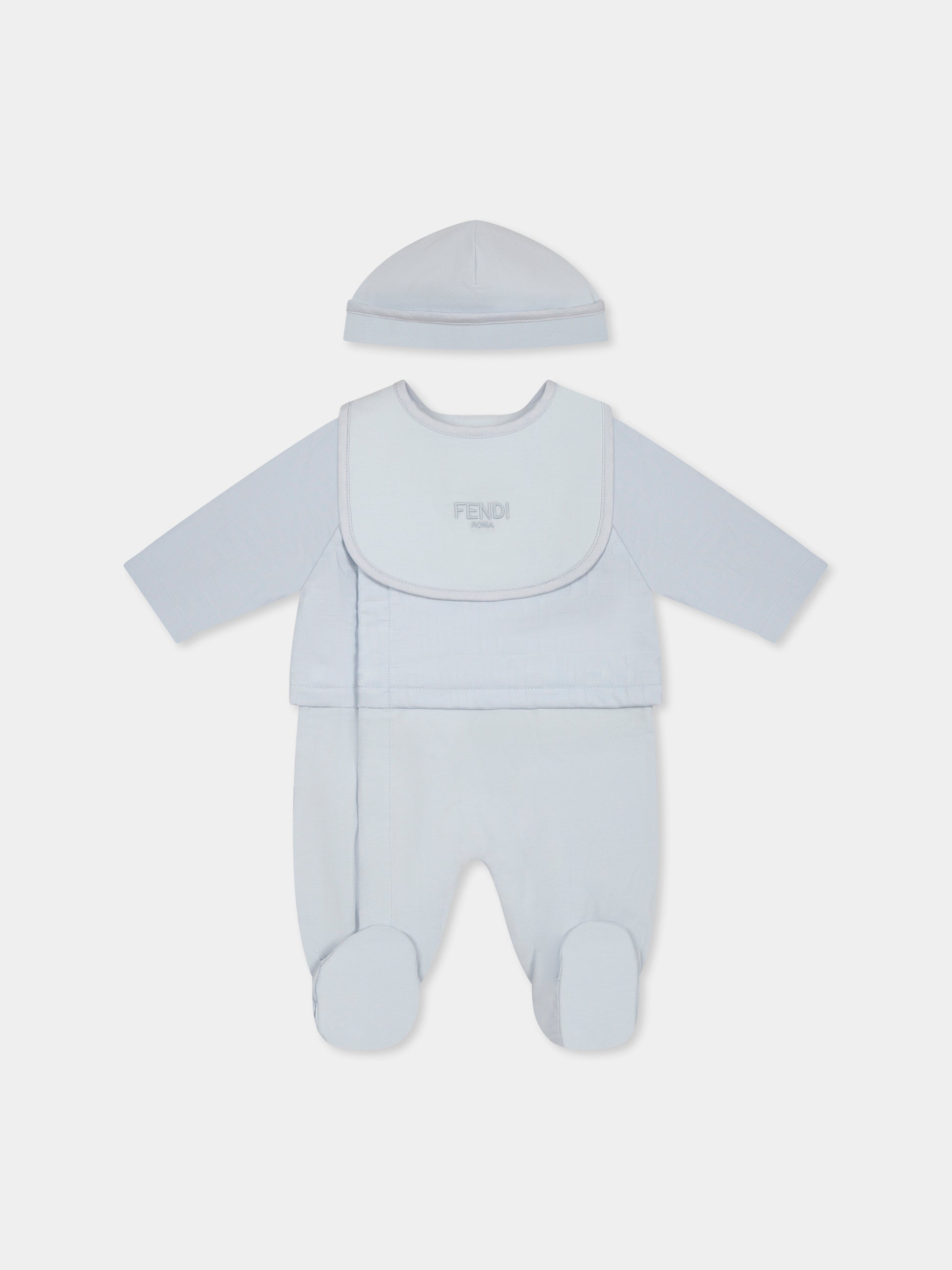 Colore: Celeste Descrizione: Set tutina celeste del luxury brand italiano Fendi Kids, realizzato in cotone, composto da tutina, bavaglino e cappello. Tutina a maniche lunghe, con parte superiore leggermente imbottita, scollo rotondo, chiusura fontale con bottoni automtaici sulla parte anteriore e piedini. È decorata con iconica FF all-over. Bavaglino con bottone automatico sul retro; é decorato con logo Fendi Roma ricamato sulla parte anteriore. Made in Italy Dettagli: 100% Cotone. Lavare a secco.