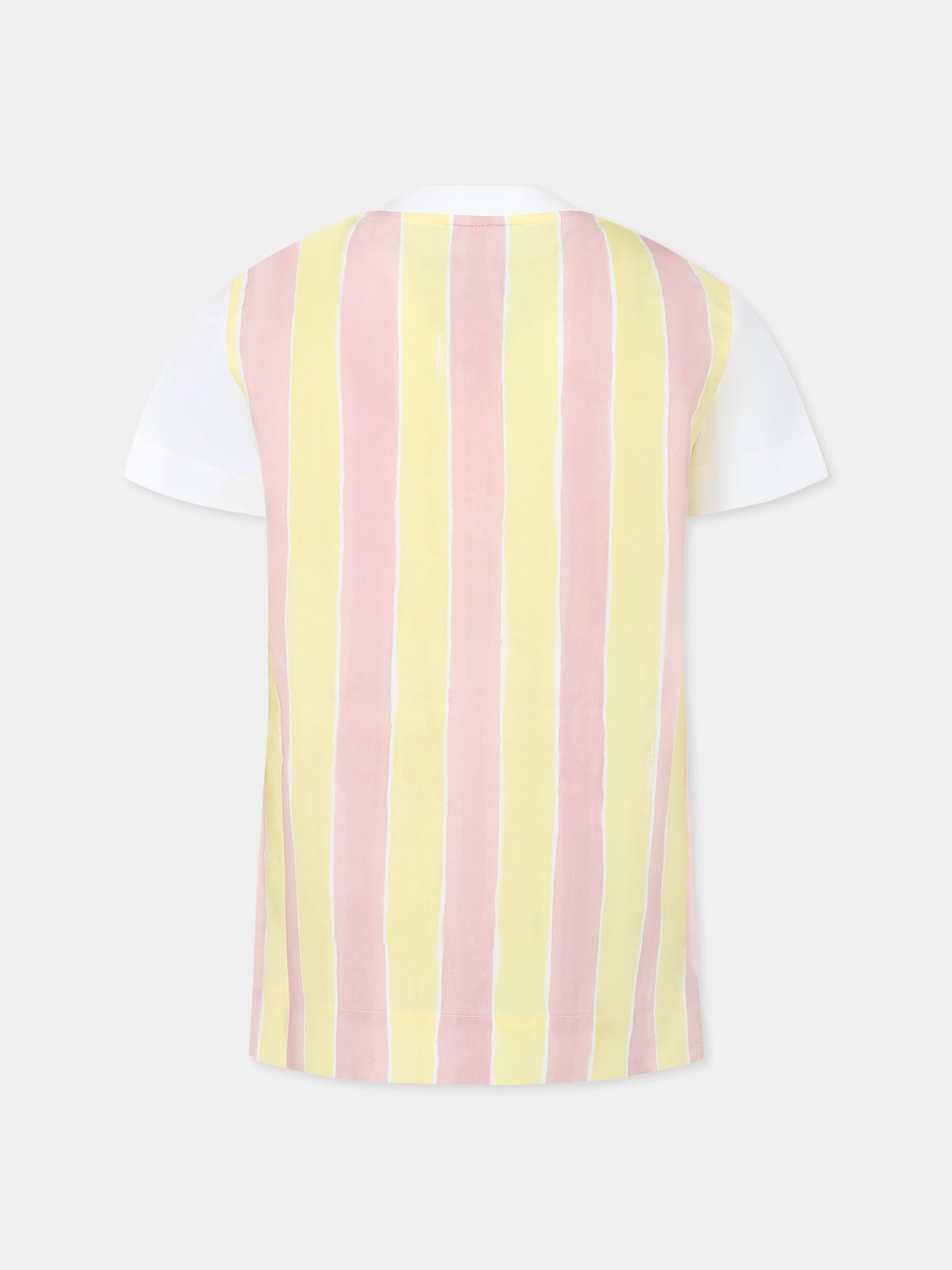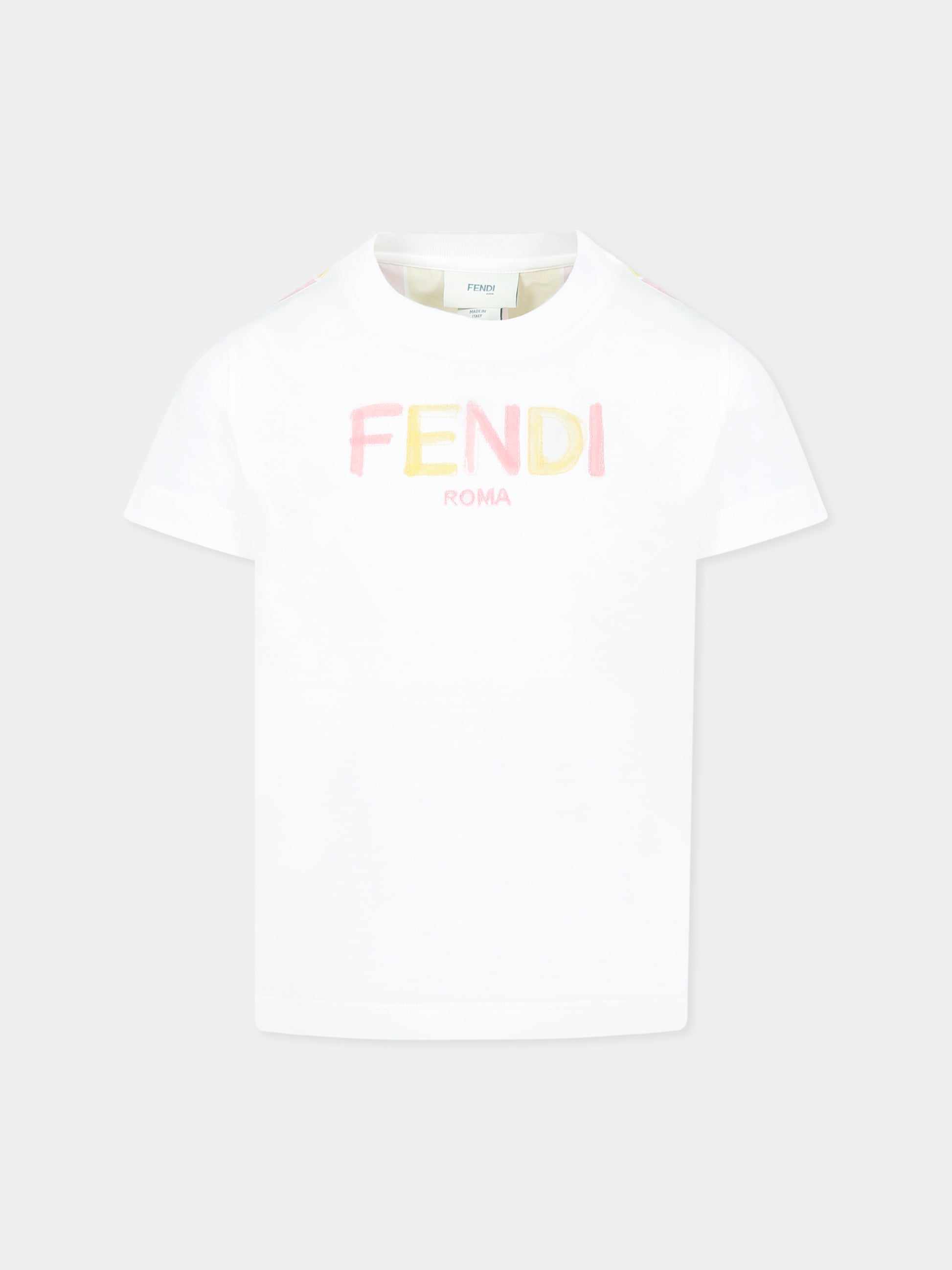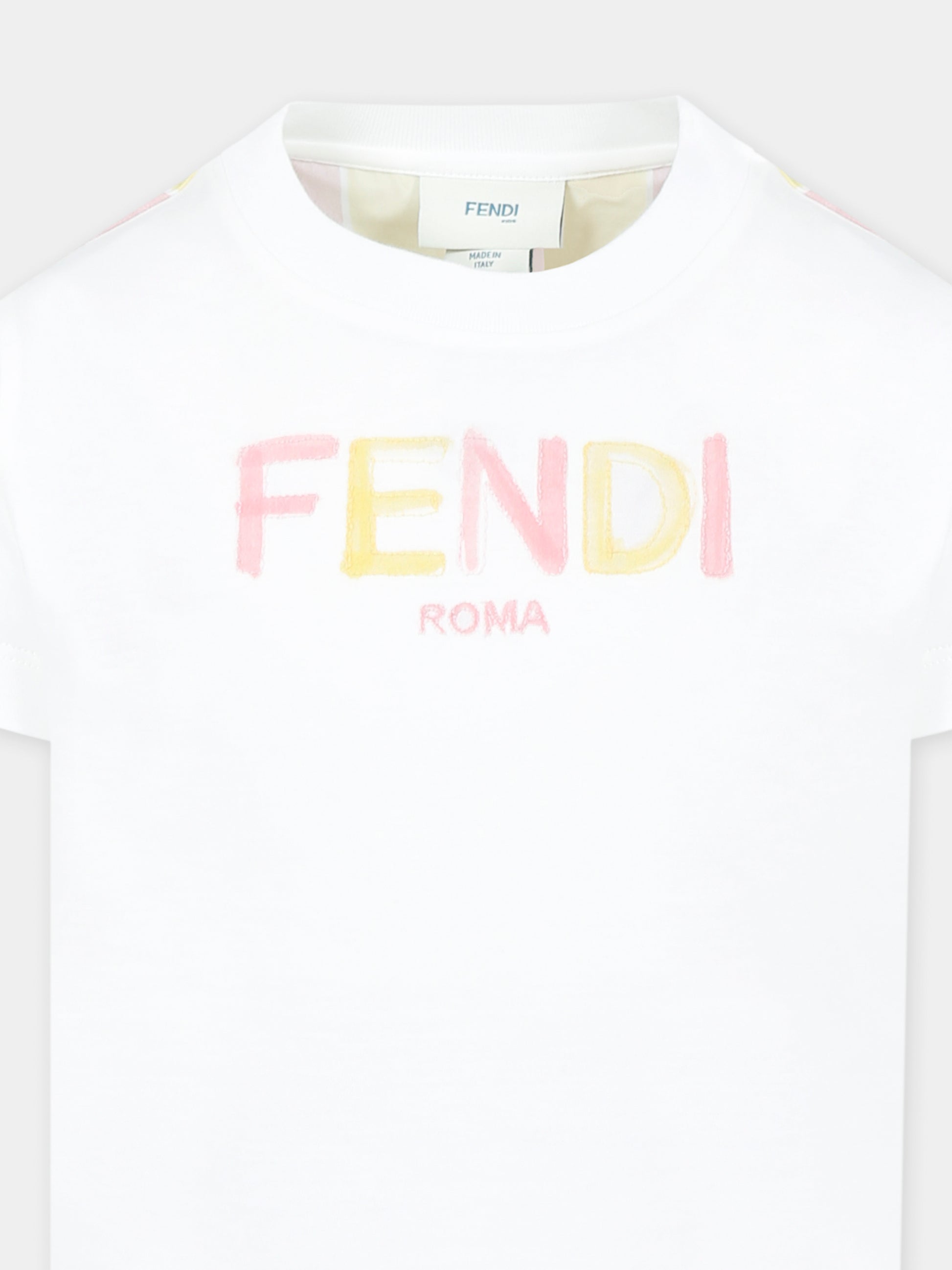 Colore: Bianco Descrizione: T-shirt bianca del luxury brand italiano Fendi Kids, realizzata in cotone. Presenta maniche corte, girocollo a costine e stampa pequin con iconiche righe nei toni del giallo e del rosa sul retro. È decorata con logo Fendi Roma multicolor ricamato sulla parte anteriore Made in Italy Dettagli: 100% Cotone. Lavare a 30°C.
