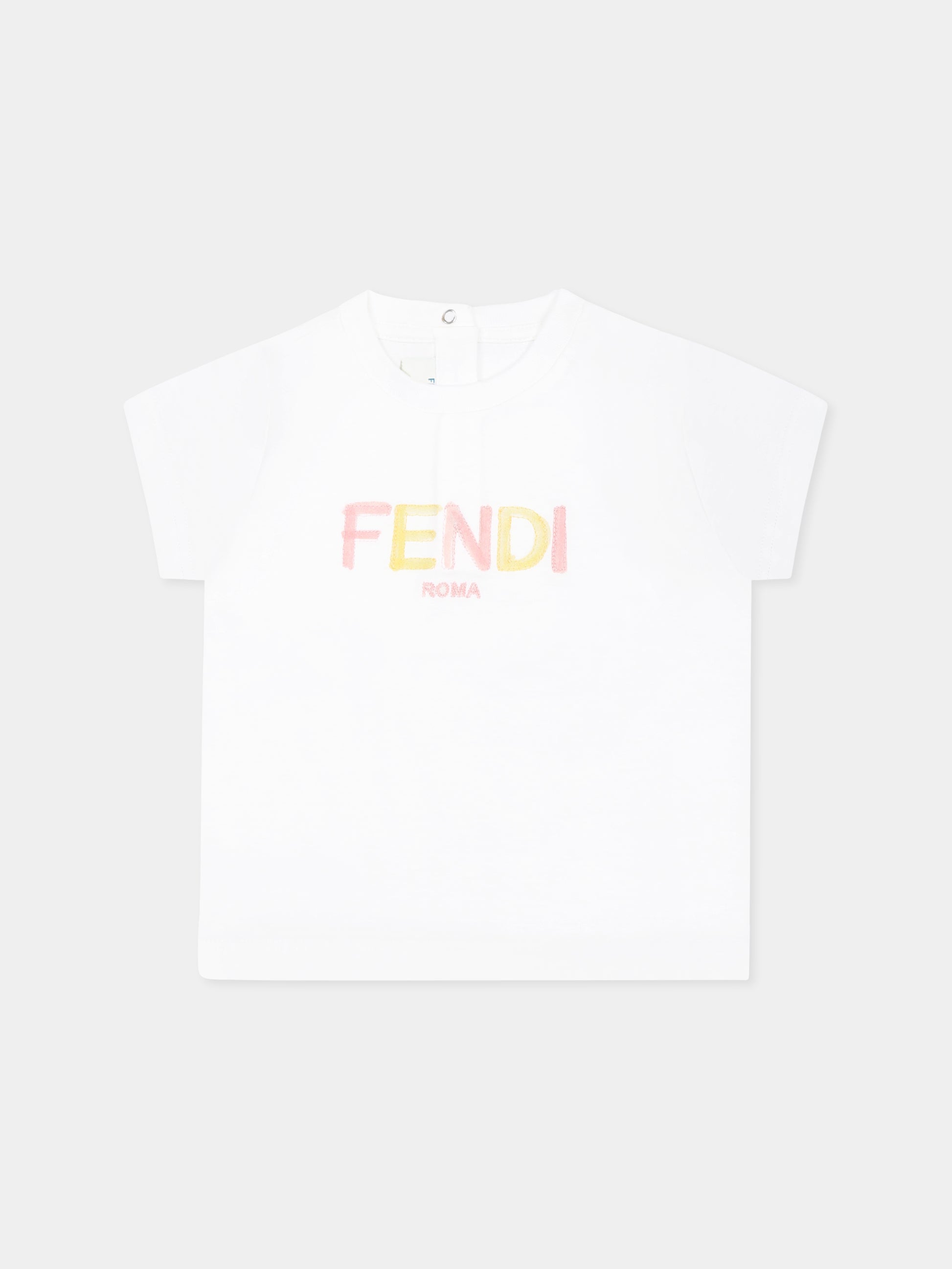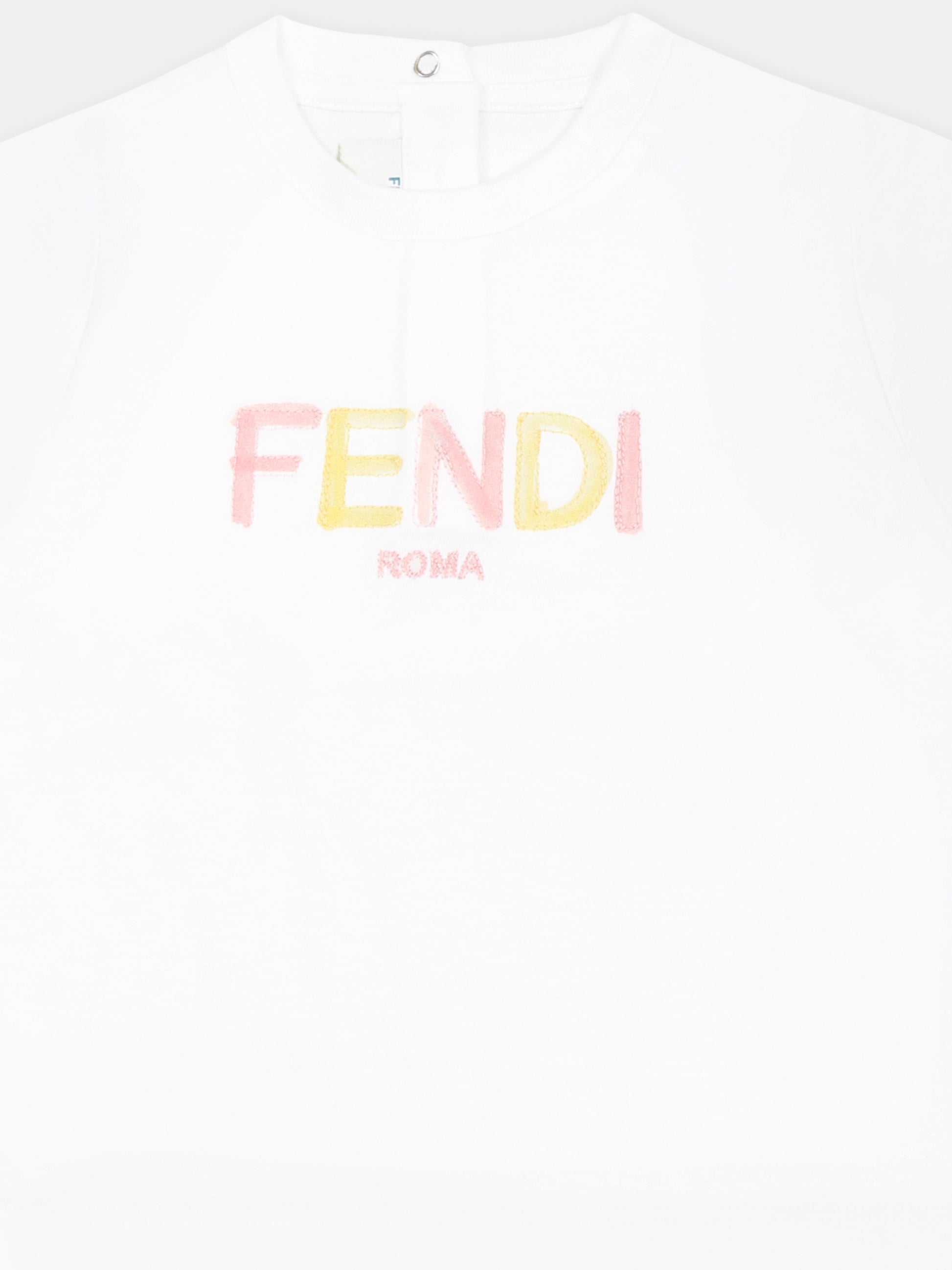 Colore: Bianco Descrizione: T-shirt bianca del luxury brand italiano Fendi Kids, realizzata in cotone. Presenta maniche corte e girocollo a costine. Si chiude con bottoni automati sul retro per una comoda vestibilità. È decorata con logo Fendi Roma multicolor ricamato sulla parte anteriore. Made in Italy Dettagli: 100% Cotone. Lavare a 30°C.