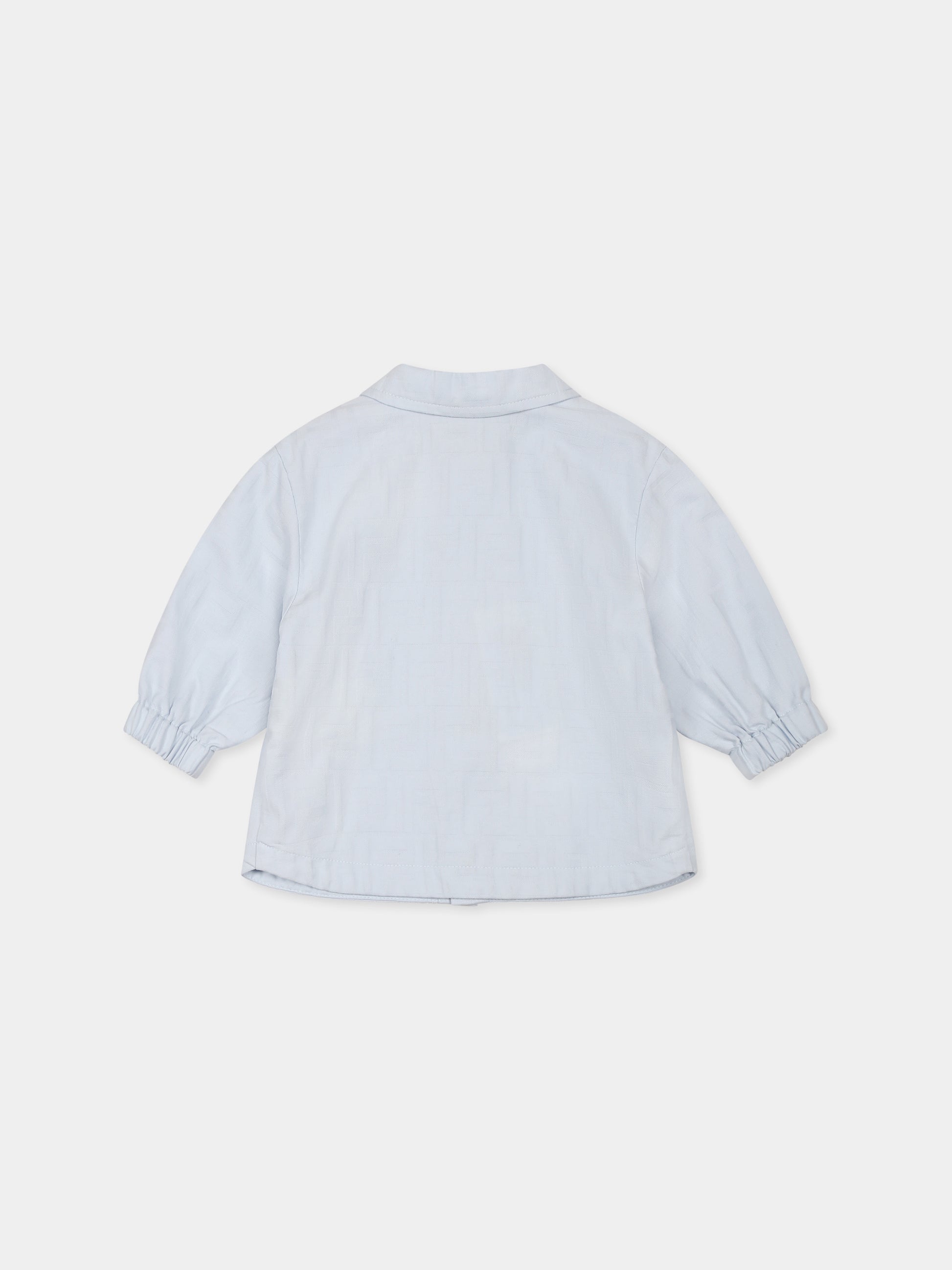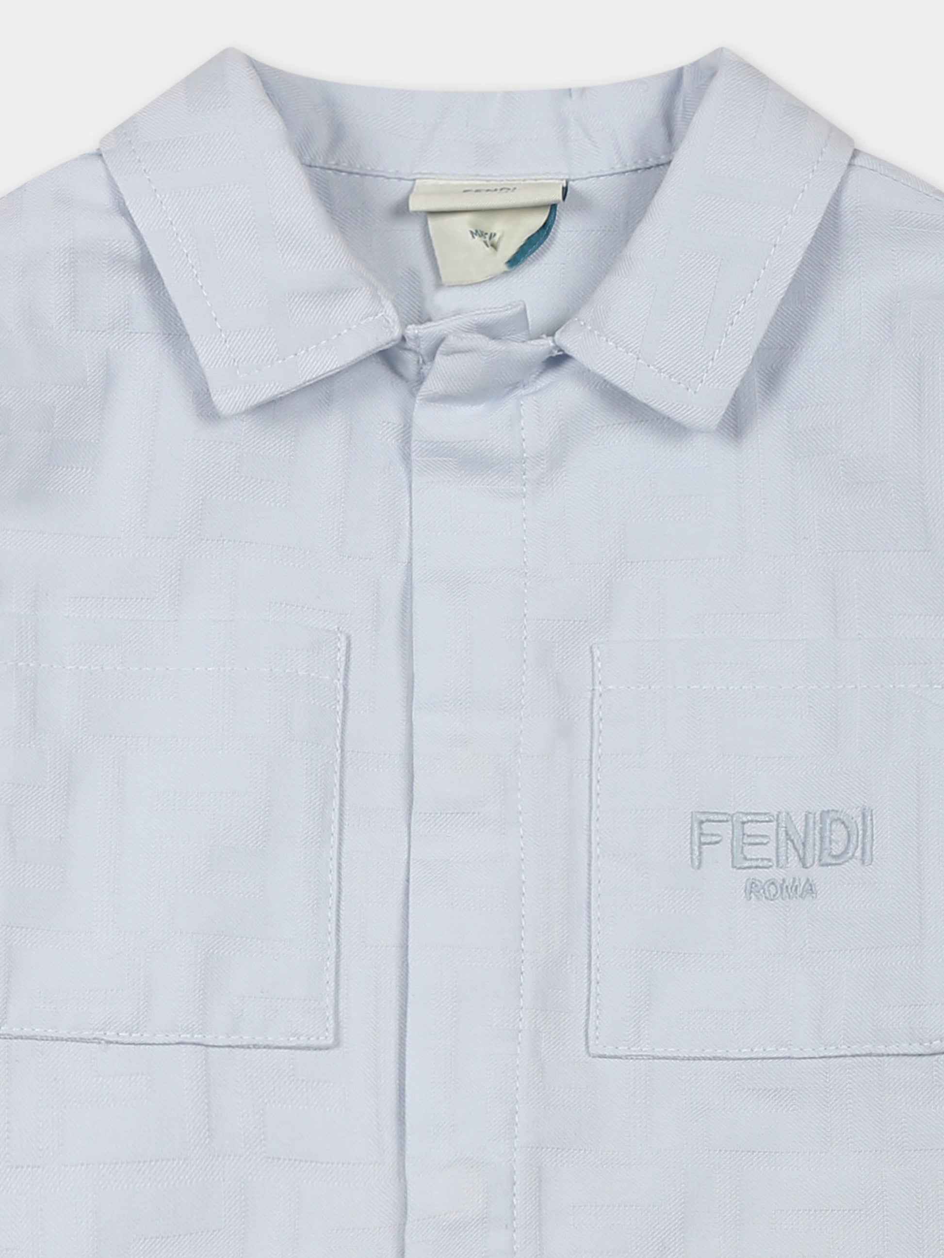 Colore: Celeste Descrizione: Giacca celeste del luxury brand italiano Fendi Kids, in jacquard di cotone. La giacca presenta maniche lunghe, un colletto classico, una chiusura frontale con bottoni automatici, pratiche tasche applicate sul petto e polsini elasticizzati per il massimo comfort. È decorata con iconica FF all-over e logo Fendi Roma ricamato sul petto. Made in Italy Dettagli: 100% Cotone. Lavare a secco.