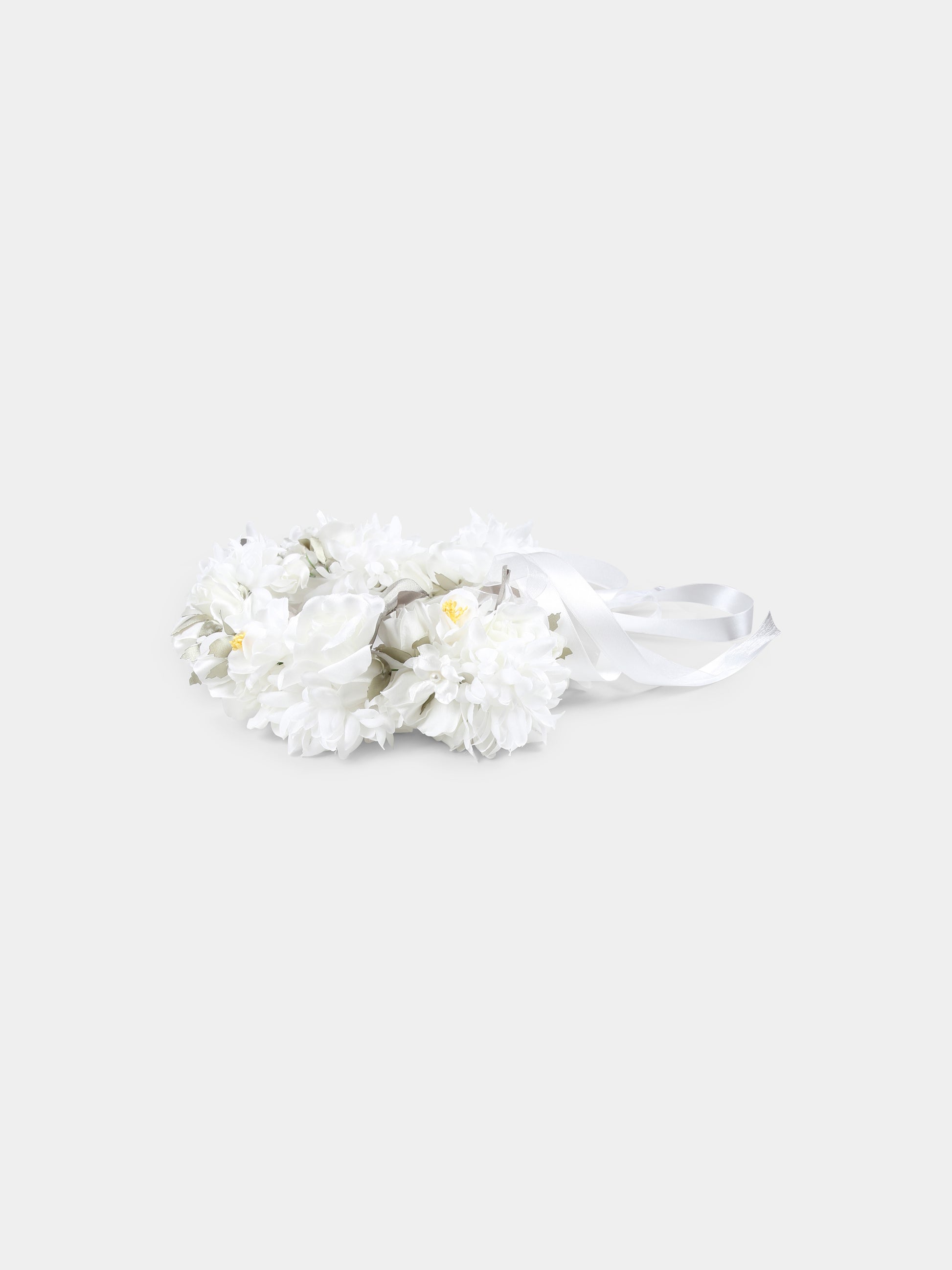 Colore: Bianco Descrizione: Cerchietto bianco in gros grain, con fiocco sul retro; decorato con rose applicate sulla parte superiore. Dettagli: 100% Poliestere.