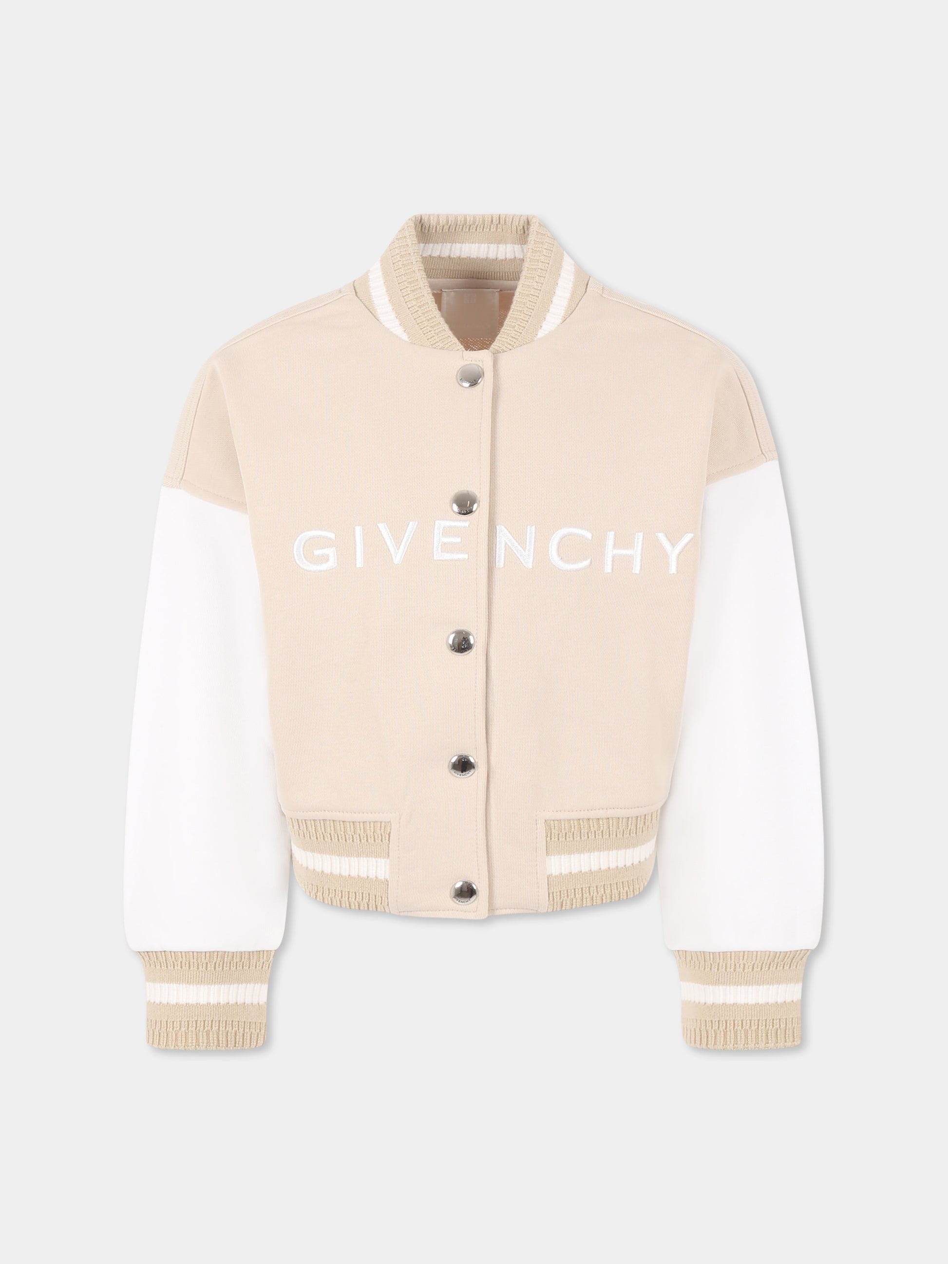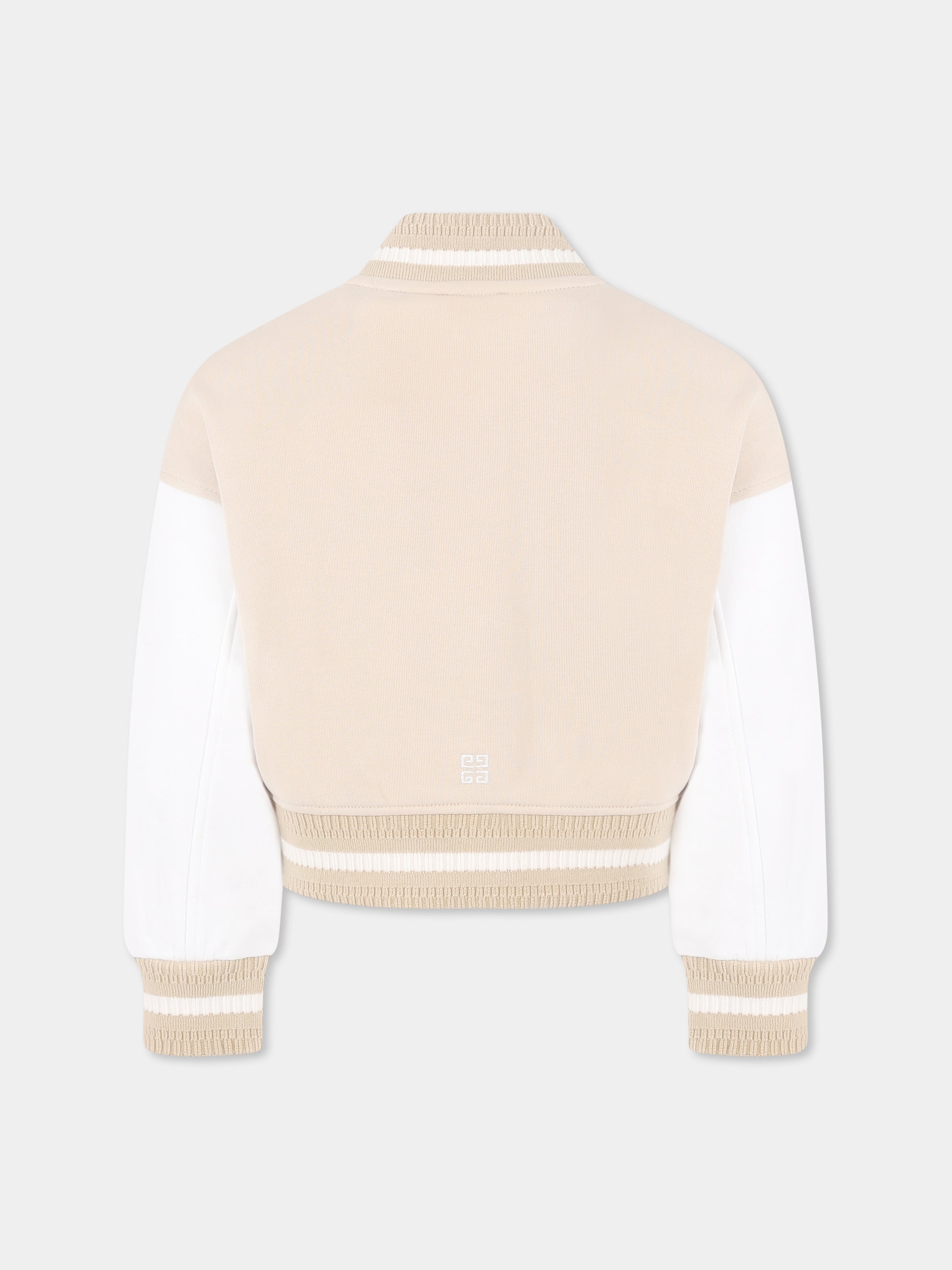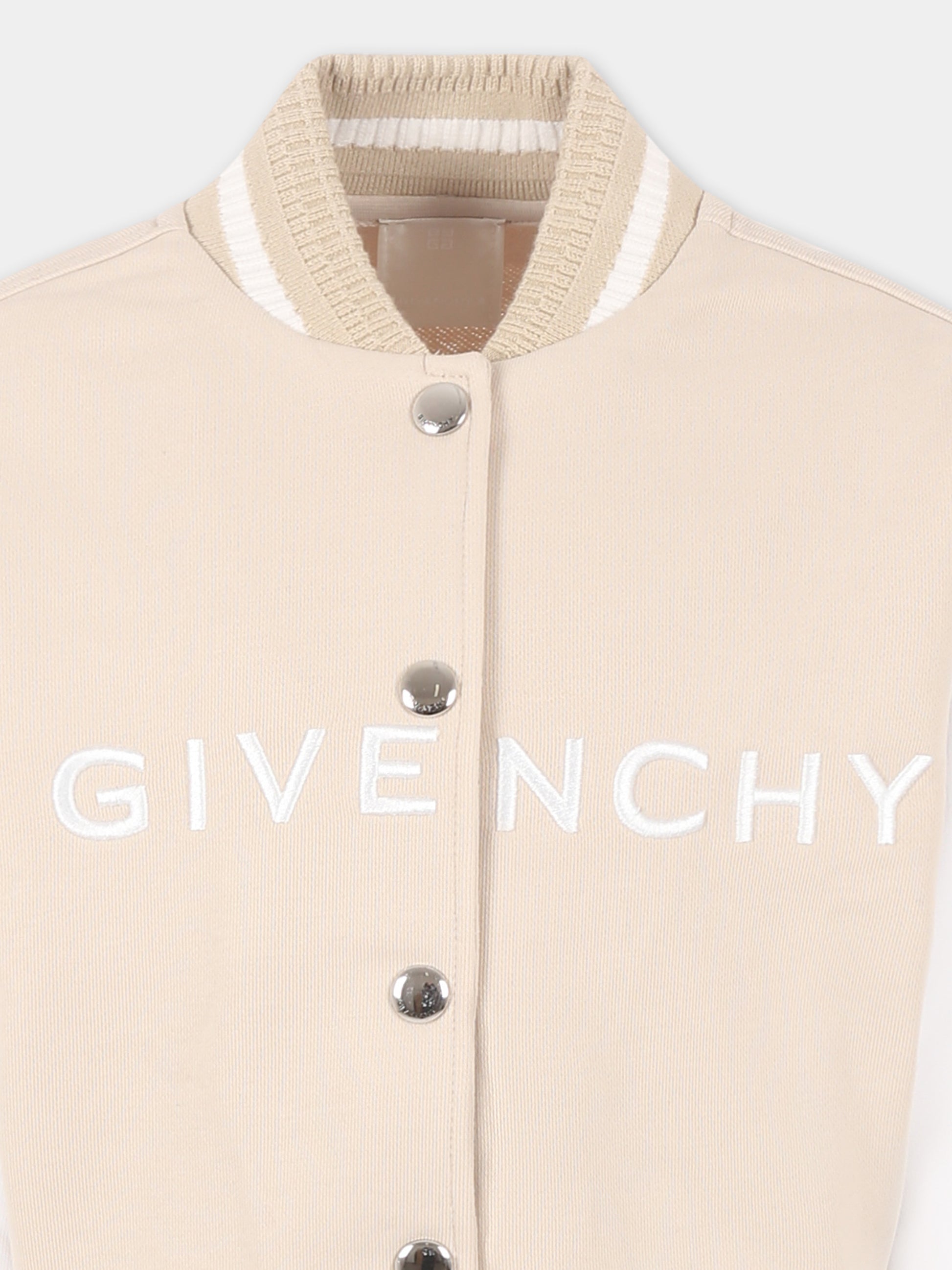 Colore: Beige Descrizione: Bomber crop beige del brand francese Givenchy Kids, in misto cotone, garzato, a maniche lunghe, con colletto basso a costine, chiusura frontale con bottoni automatici, polsini e orlo a costine. È decorato con logo bianco ricamato sulla parte anteriore e iconico motivo 4G sul retro. Dettagli: 85% Cotone, 15% Poliestere. Lavare a 30°C.