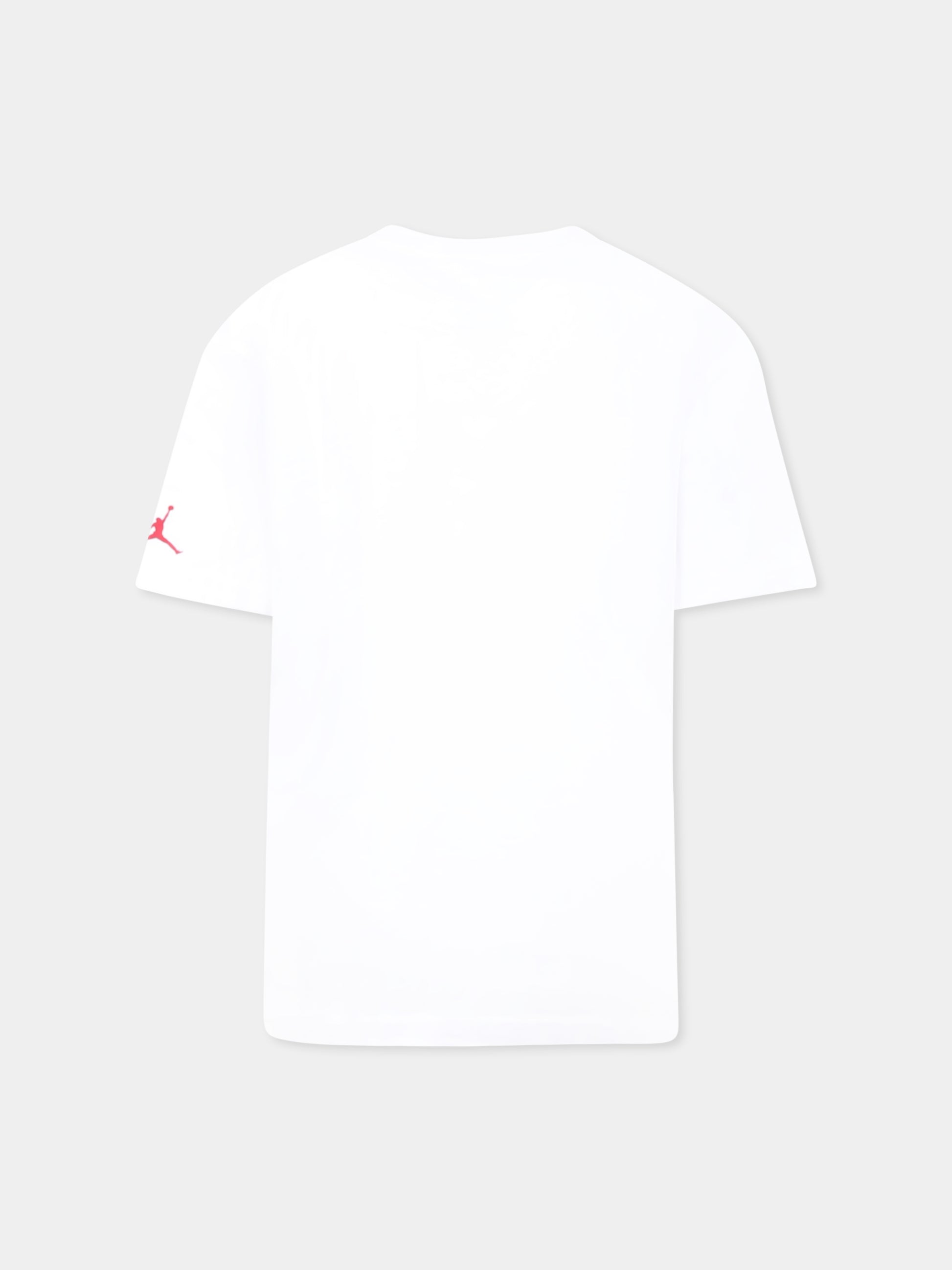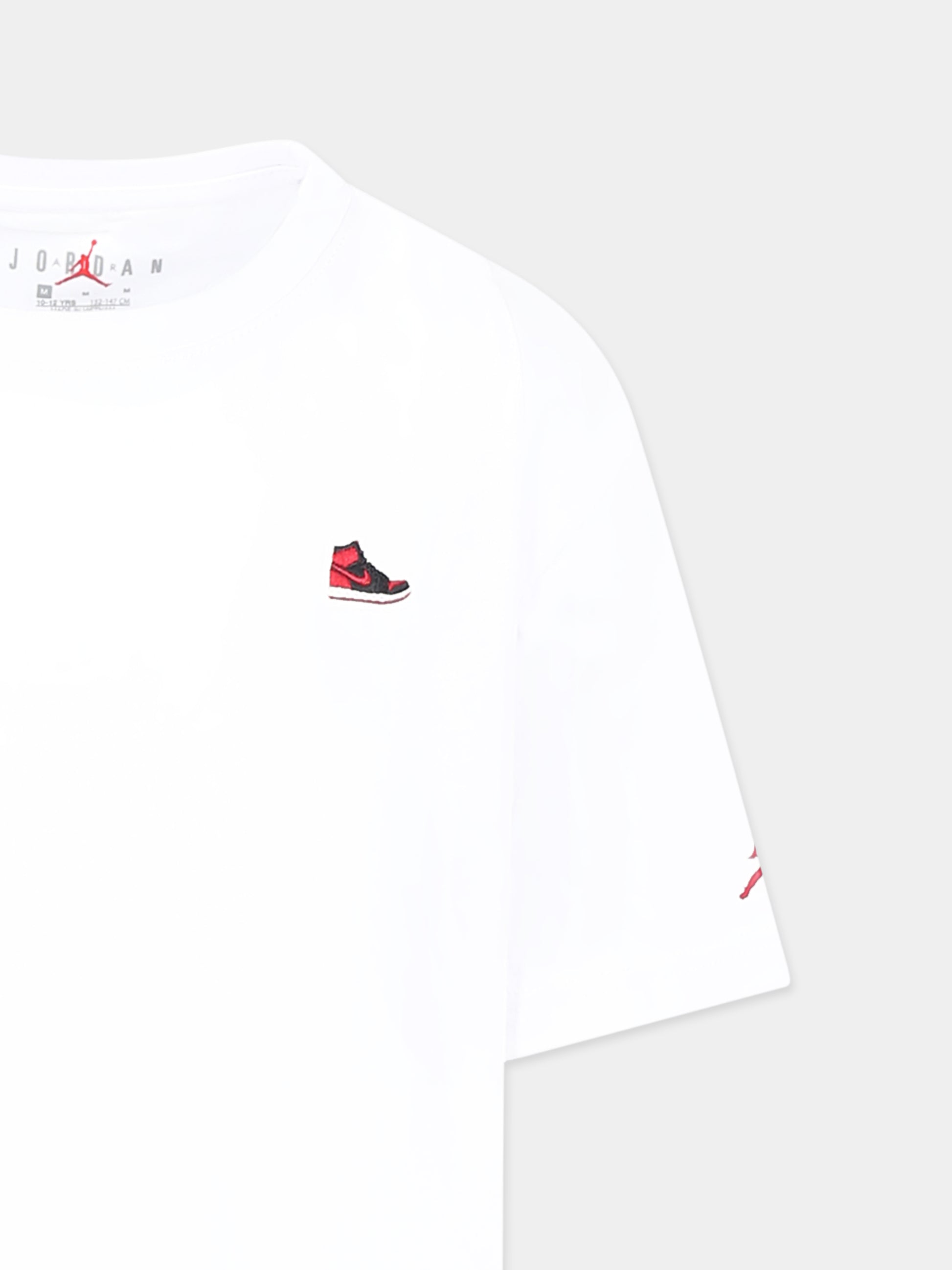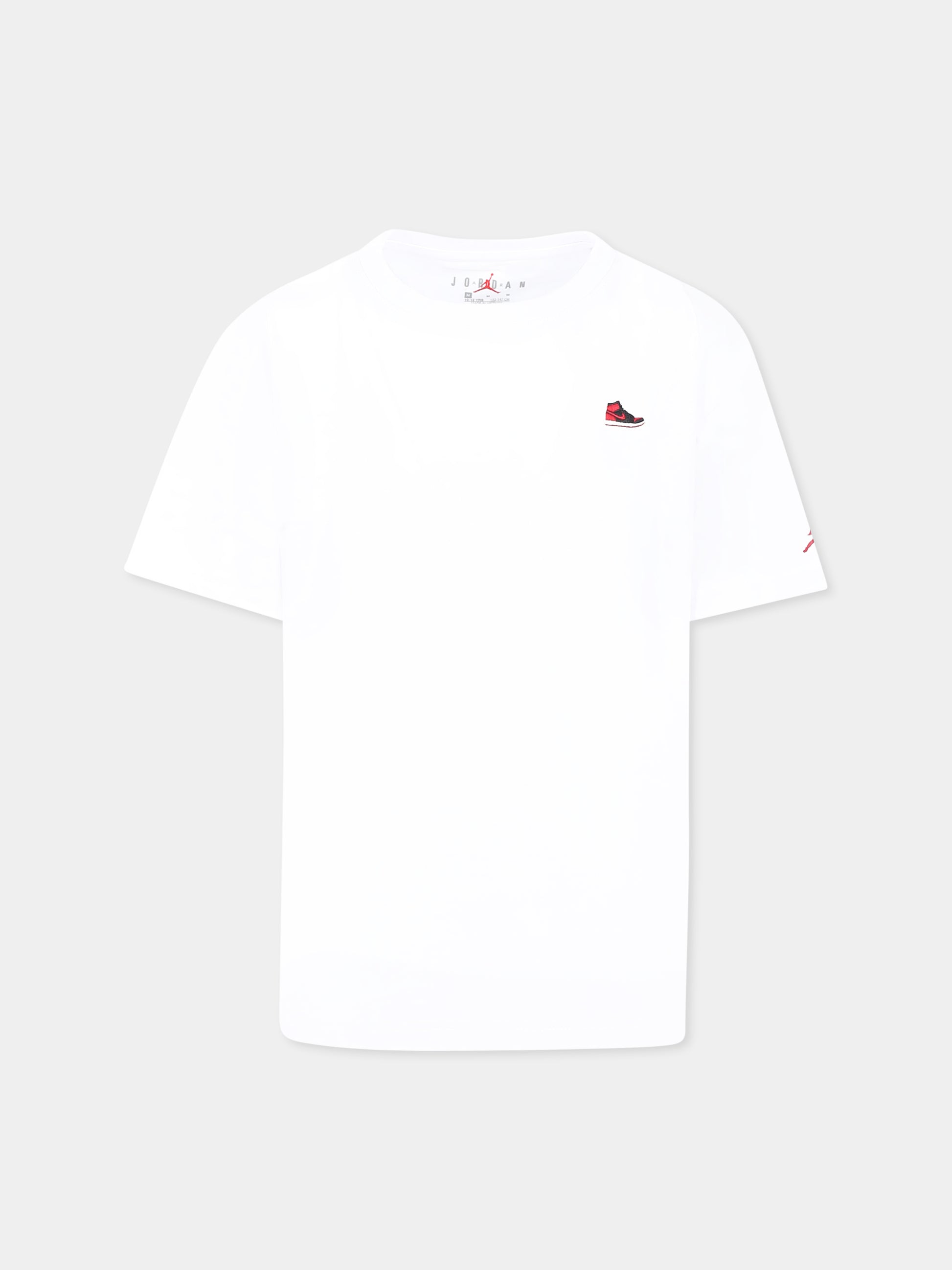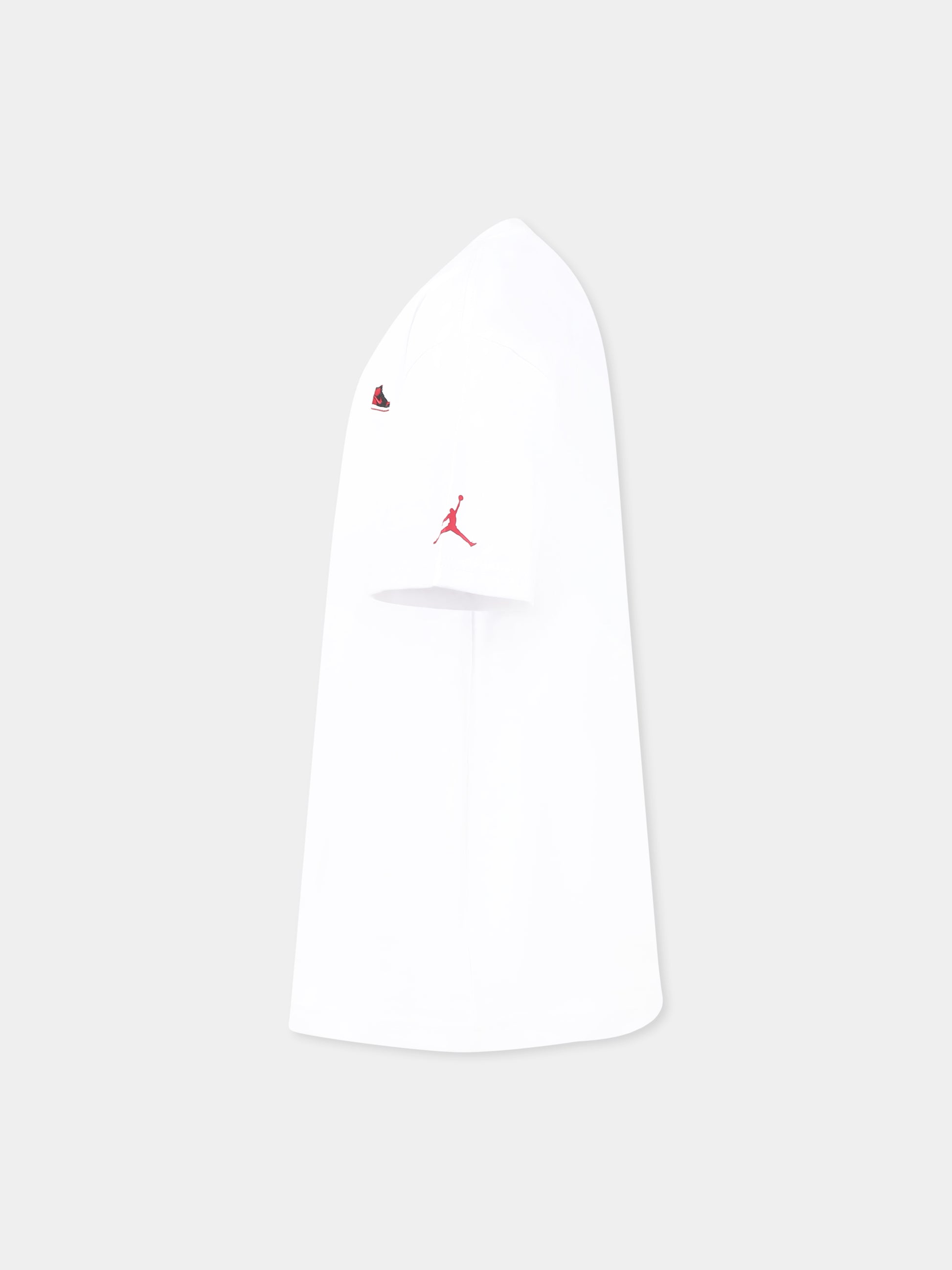 Colore: Bianco Descrizione: T-shirt bianca in misto cotone pesante, con maniche corte e girocollo a costine. È decorata con sneaker ricamata sul petto e iconico Jumpman sulla manica. Dettagli: 60% Cotone, 40% Poliestere. Lavare a 30°C.