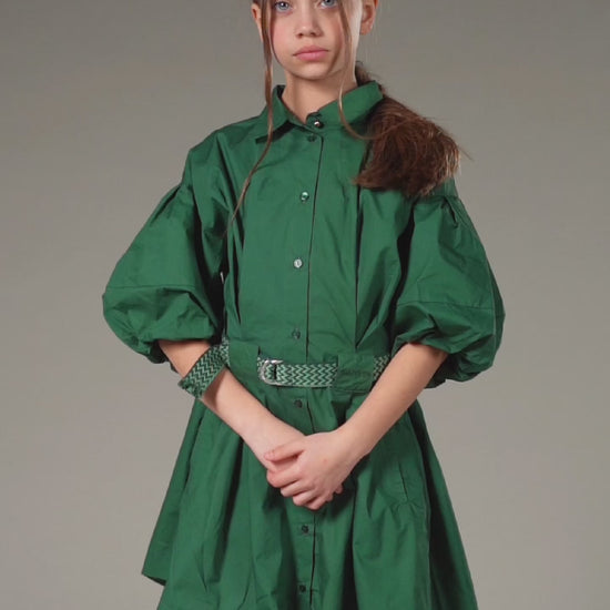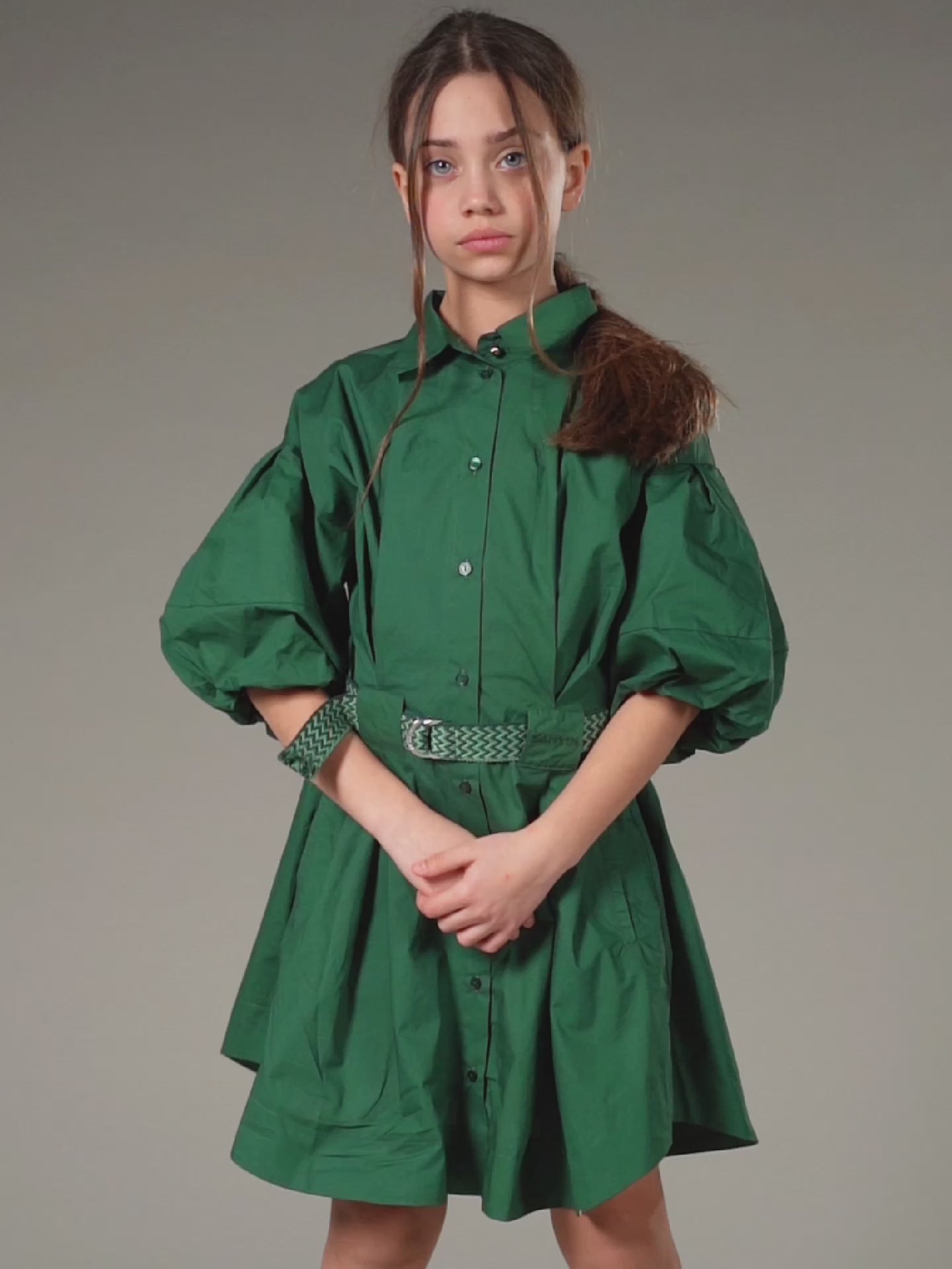 Colore: Verde Descrizione: Vestito verde del brand francese Lanvin Petite, realizzato in popeline di cotone, con maniche corte a palloncino, colletto classico, chiusura frontale con bottoni, tasche laterali e cintura Curb in vita. È decorato con logo Lanvin ricamato sulla parte anteriore. Dettagli: 100% Cotone. Lavare a 30°C.