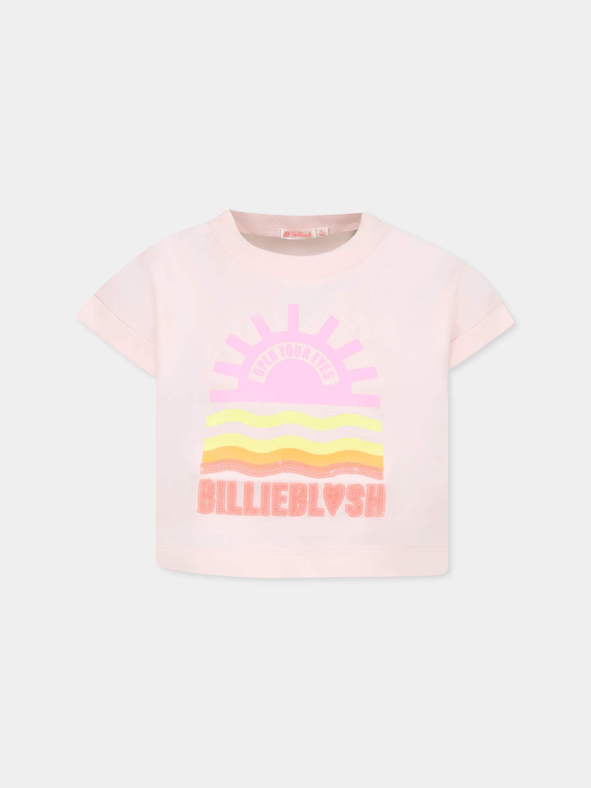 Colore: Rosa Descrizione: T-shirt crop rosa in cotone, con maniche corte e girocollo a costine. È decorata con stampa sole e logo di paillettes sulla parte anteriore. Dettagli: 100% Cotone. Lavare a 30°C.