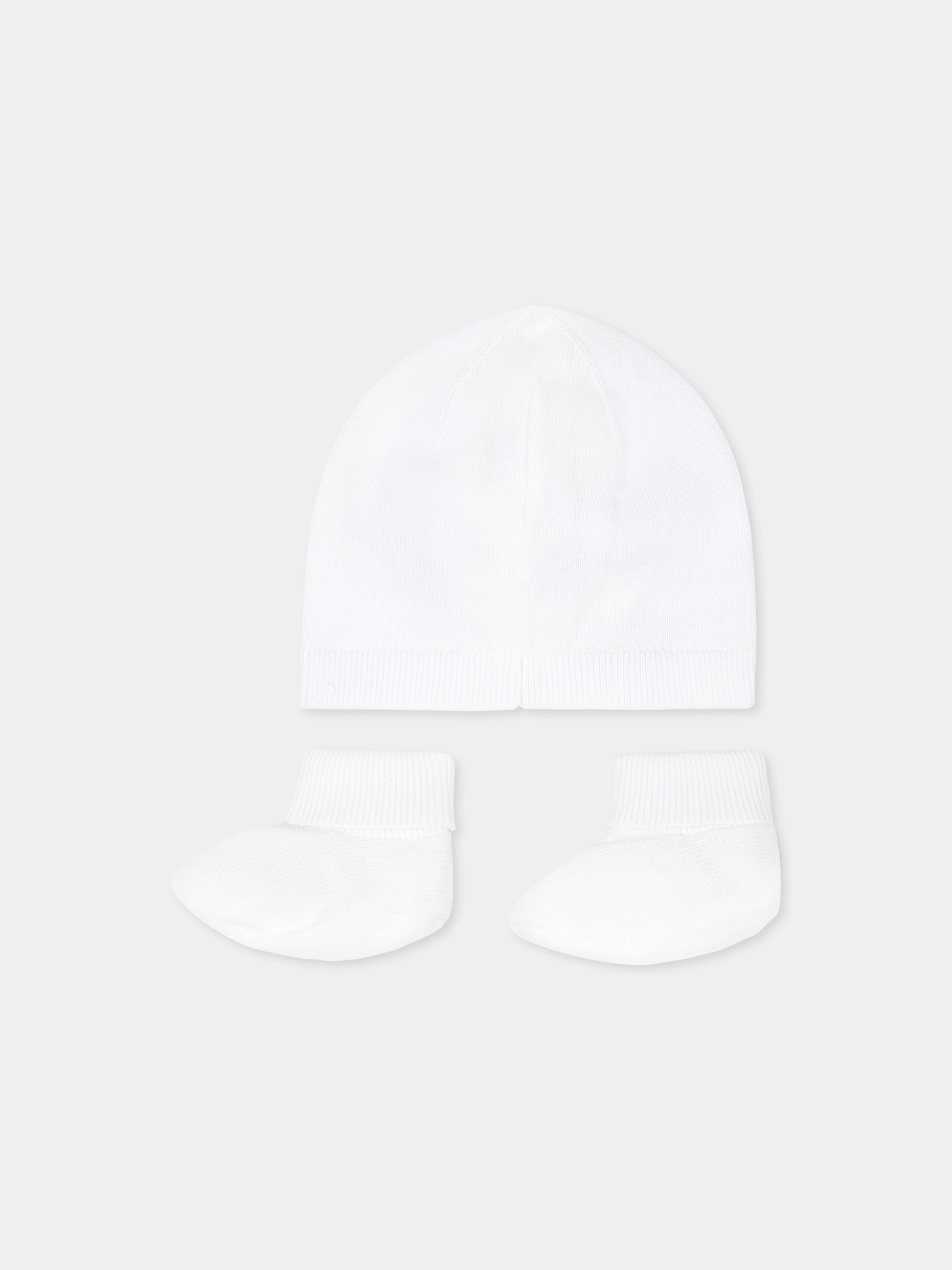 Colore: Bianco Descrizione: Set accessori bianco in maglia, composto da cappello e babbucce. Cappello con orlo a costine; decorato con logo frontale ricamato e panda. Babbucce con risvolto; decorati con logo laterale. Dettagli: 100% Cotone. Lavare a 30°C.
