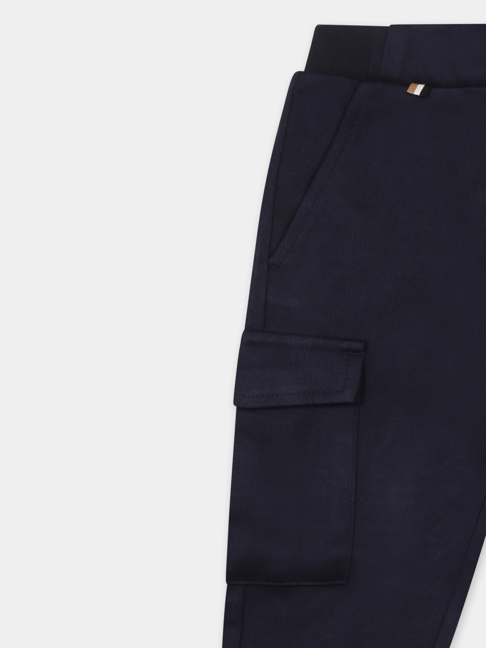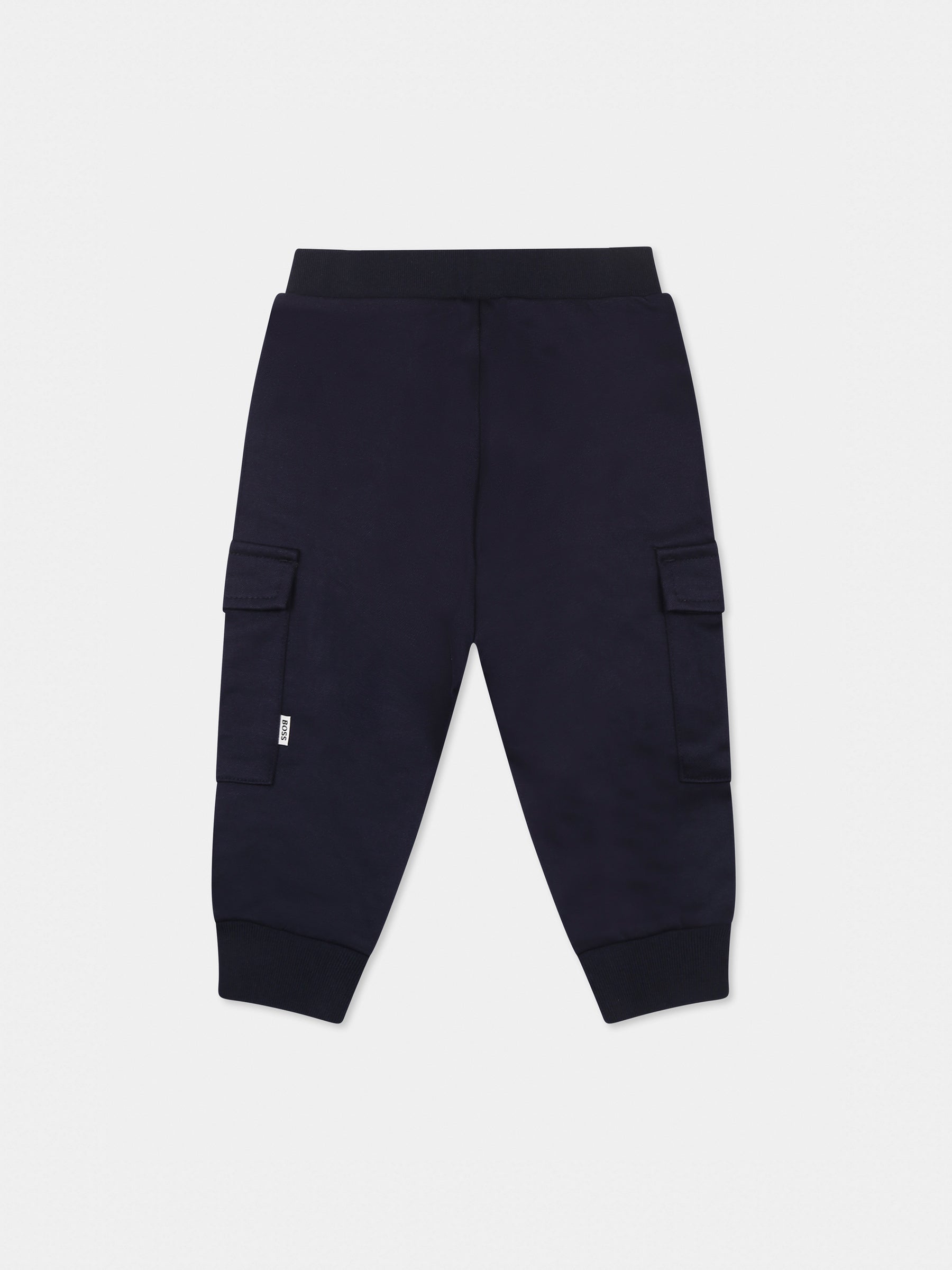 Colore: Blu Descrizione: Pantaloni blu con vita elasticizzata, tasche laterali, tasche cargo sui lati e caviglie a csotine. Sono decorati con dettaglio tricolore sulla parte anteriore e patch logata sul retro. Dettagli: 62% Viscosa, 33% Poliammide, 5% Elastan. Lavare a 30°C.