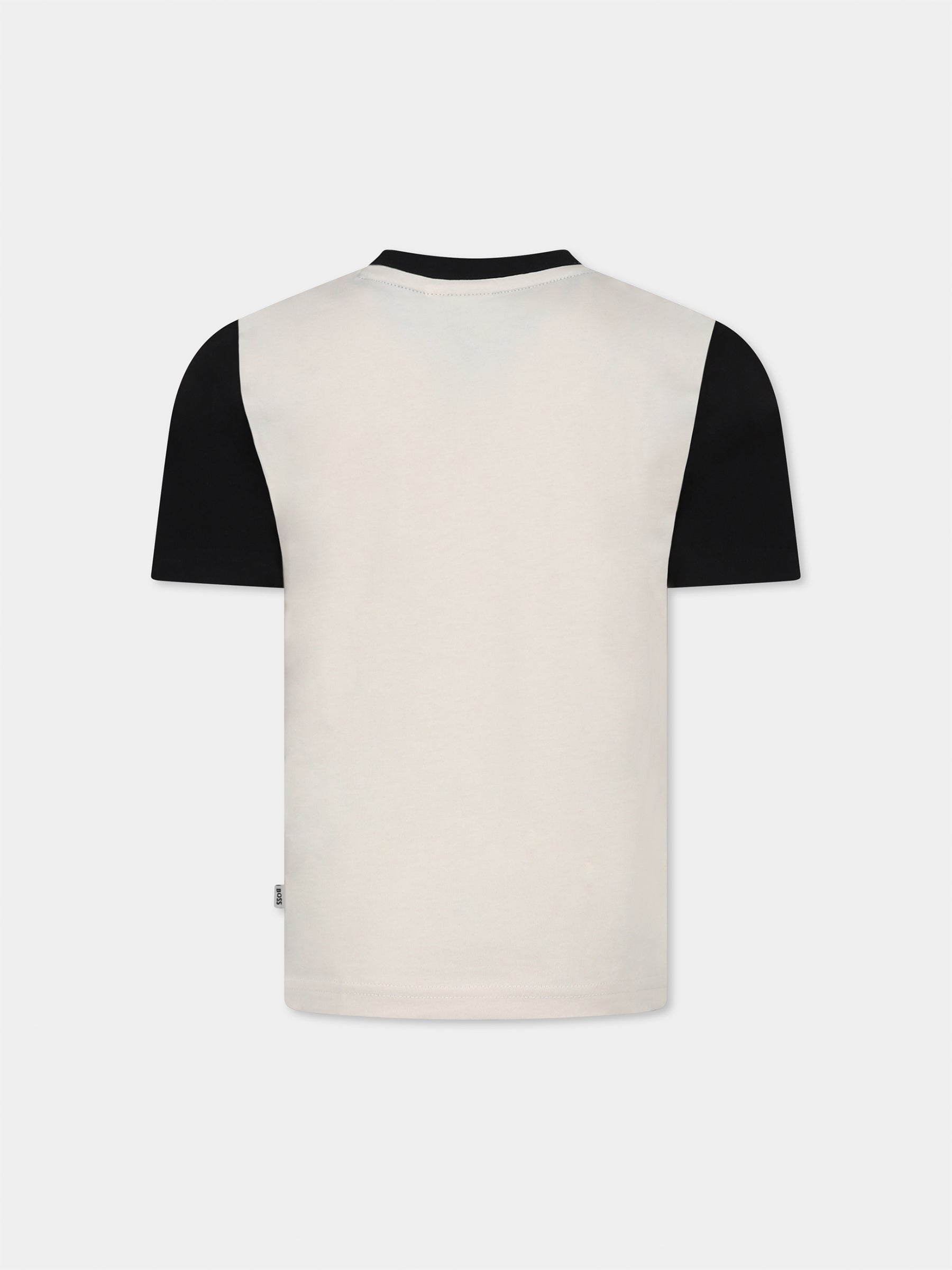 Colore: Beige Descrizione: T-shirt beige in cotone, con maniche corte, girocollo a costine e dettagli a contrasto bianco e nero suil lati. È decorata con logo nero sul petto. Dettagli: 100% Cotone. Lavare a 30°C.