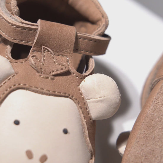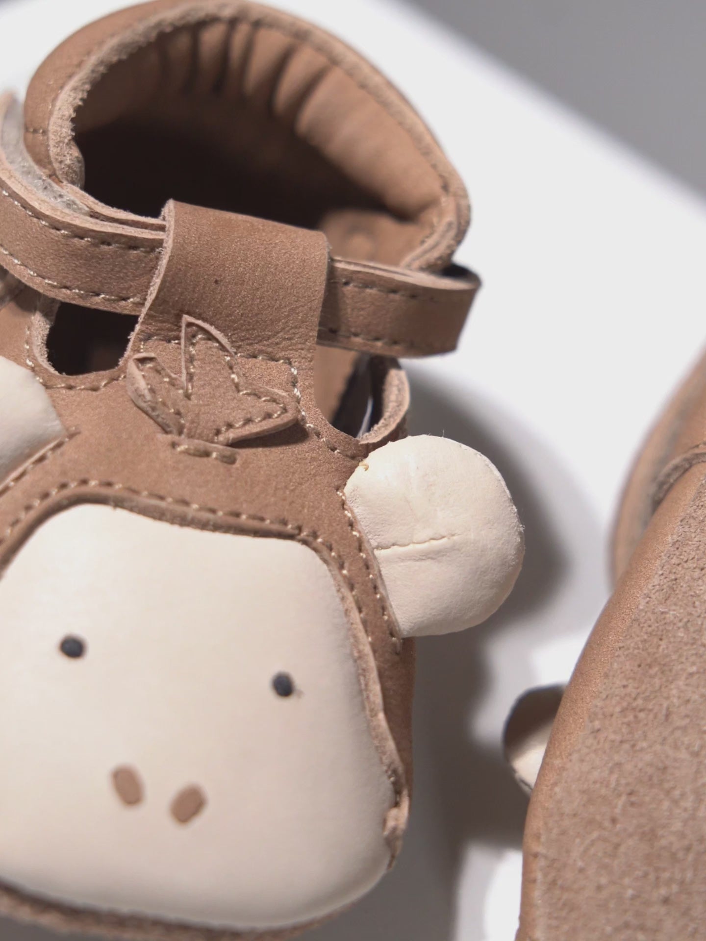 Colore: Marrone Descrizione: Occhi di bue marroni in nabuk, con suola in suede, cinturino, chiusura a strappo, orecchie applicate sui lati e punta tonda. Sono decorate con scimmia sulla parte anteriore e logo sul retro. Dettagli: 100% Pelle.