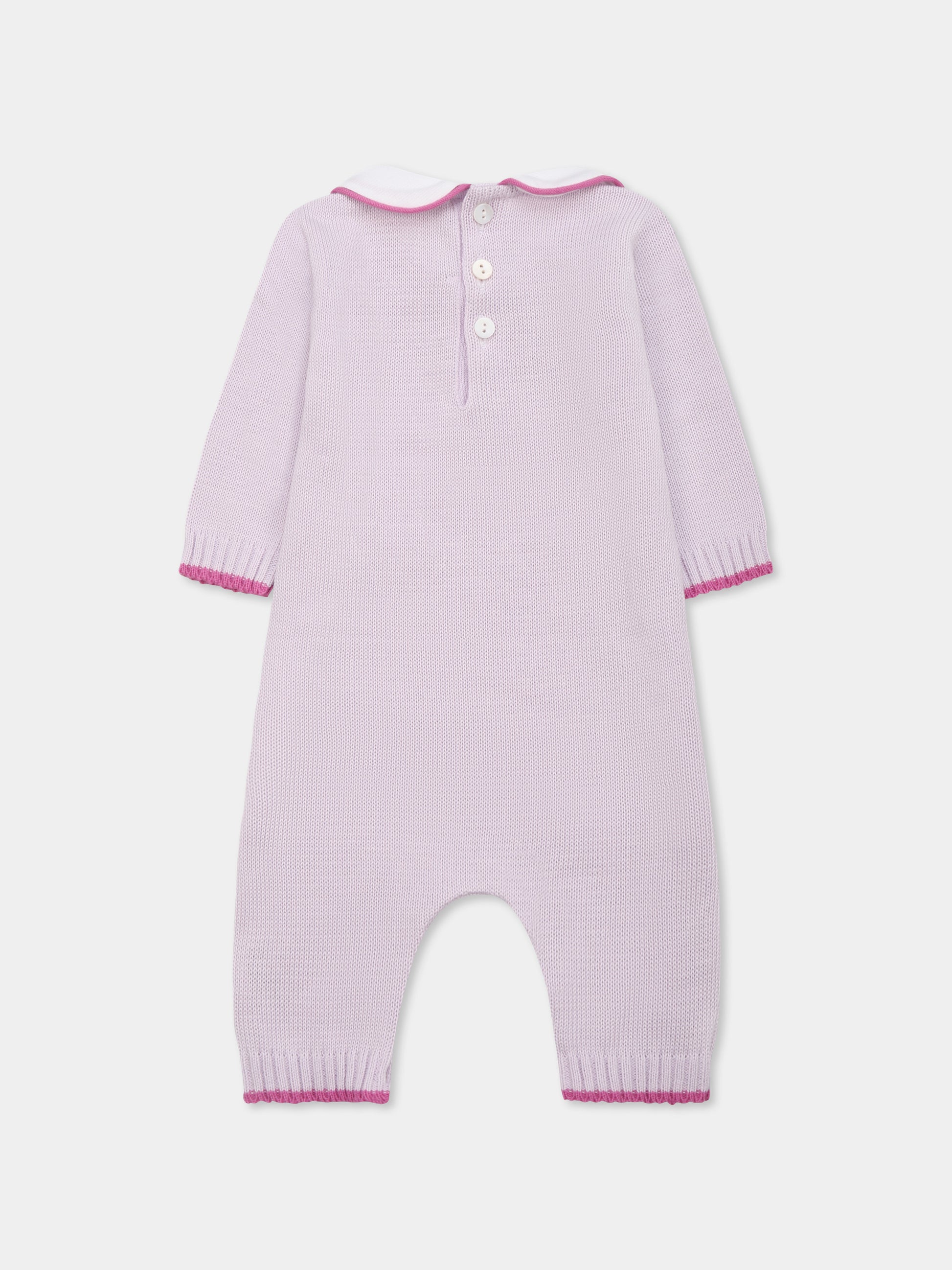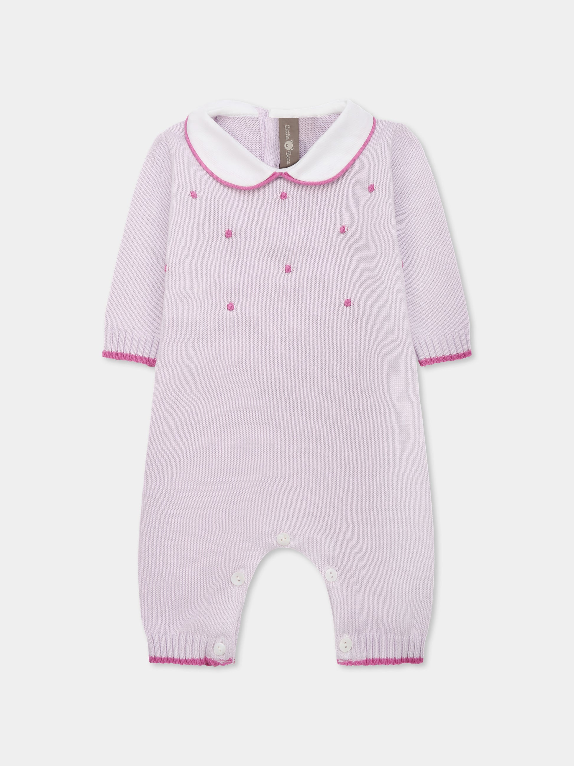 Colore: Viola Descrizione: Tutina viola in filo di cotone, a maniche lunghe, con colletto peter pan in popeline di cotone bianco, bottoni in madreperla sul retro e tra le gambe, polsini e caviglie a costine con dettaglio a contrasto. È decorata con pois ricamati sulla parte anteriore. Made in Italy Dettagli: 100% Cotone. Lavare a mano.