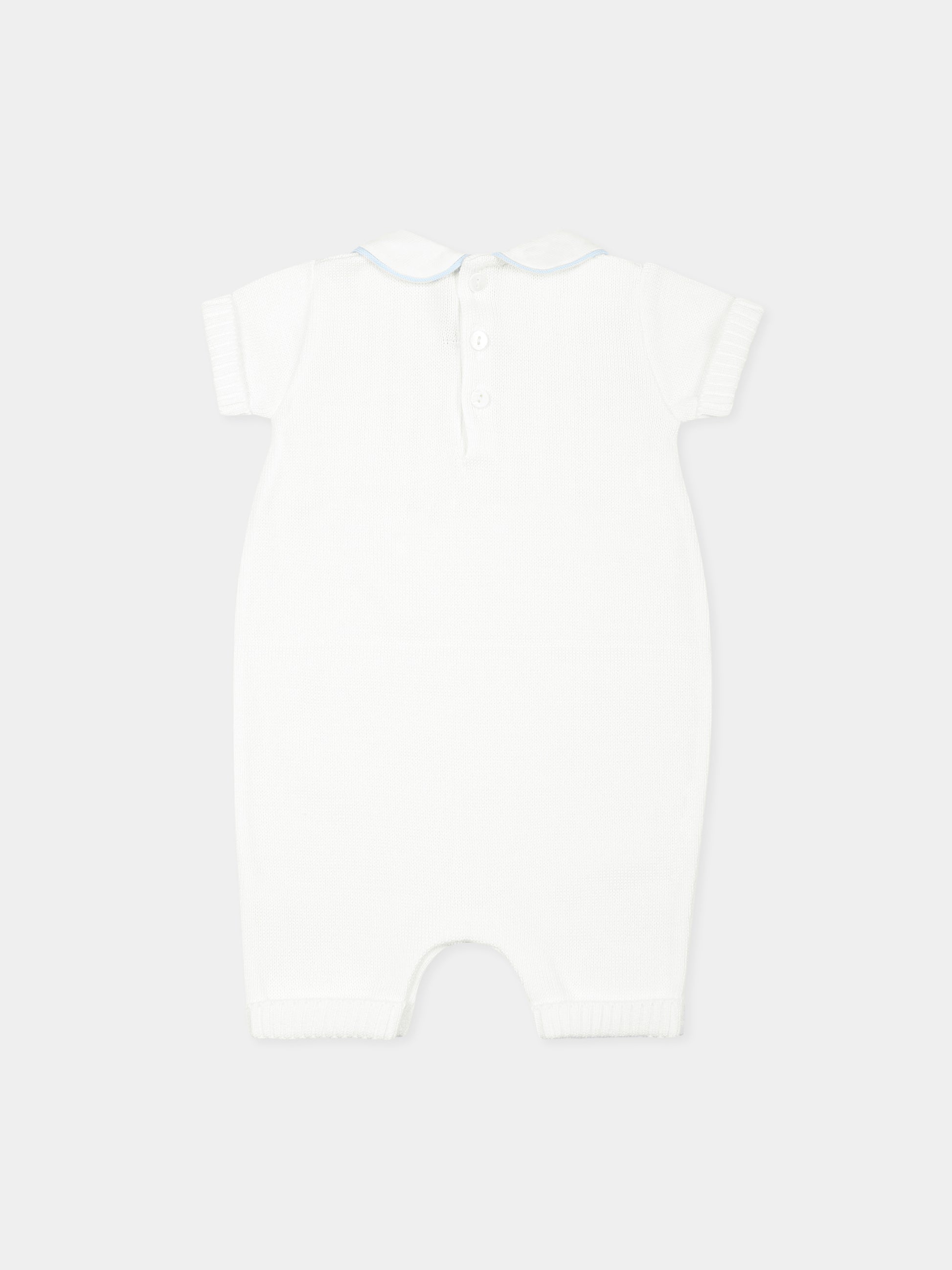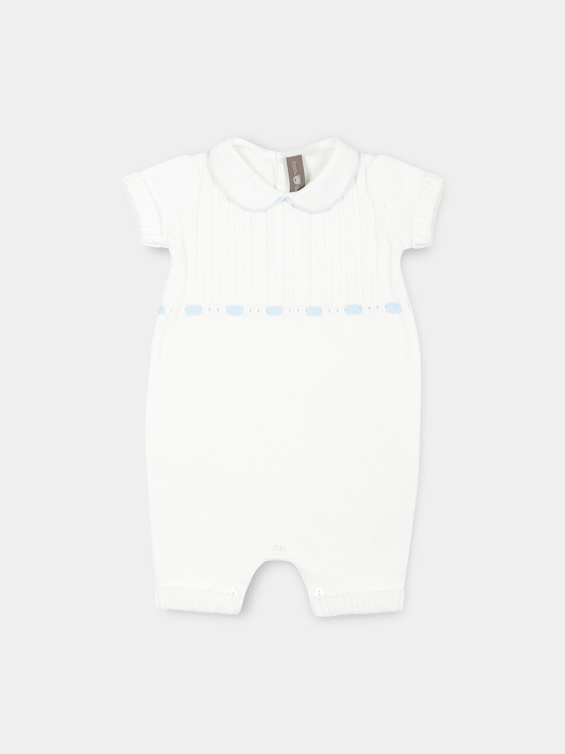 Colore: Bianco Descrizione: Pagliaccetto bianco in filo di cotone, a maniche corte, con colletto peter pan in popeline di cotone, chiusura con bottoni in madreperla sul retro e tra le gambe, maniche e caviglie con risvolto. È decorato con nastro celeste sulla parte anteriore. Made in Italy Dettagli: 100% Cotone. Lavare a mano.