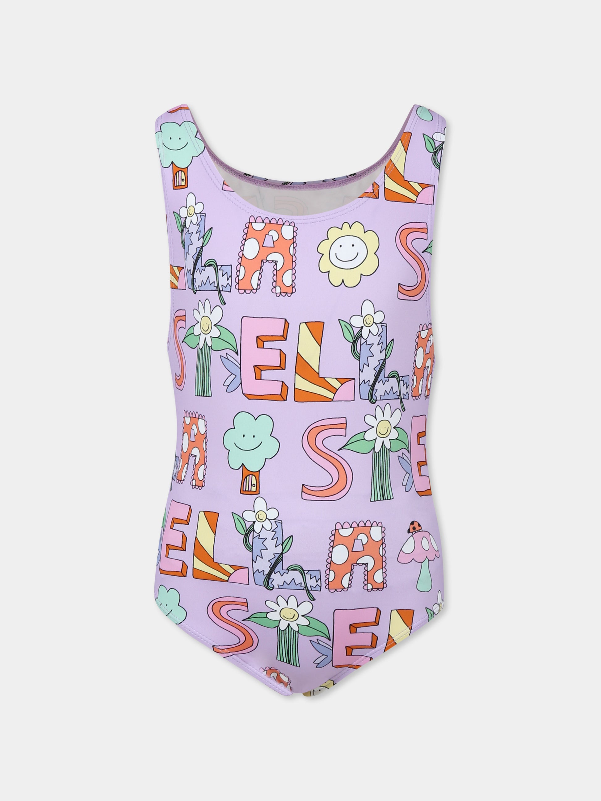 Colore: Viola Descrizione: Costume intero viola, con spalline e scollo rotondo; realizzato con materiali riciclati. È decorato con logo e stampa bosco all-over. Dettagli: 78% Poliammide, 22% Elastan. Lavare a 30°C.