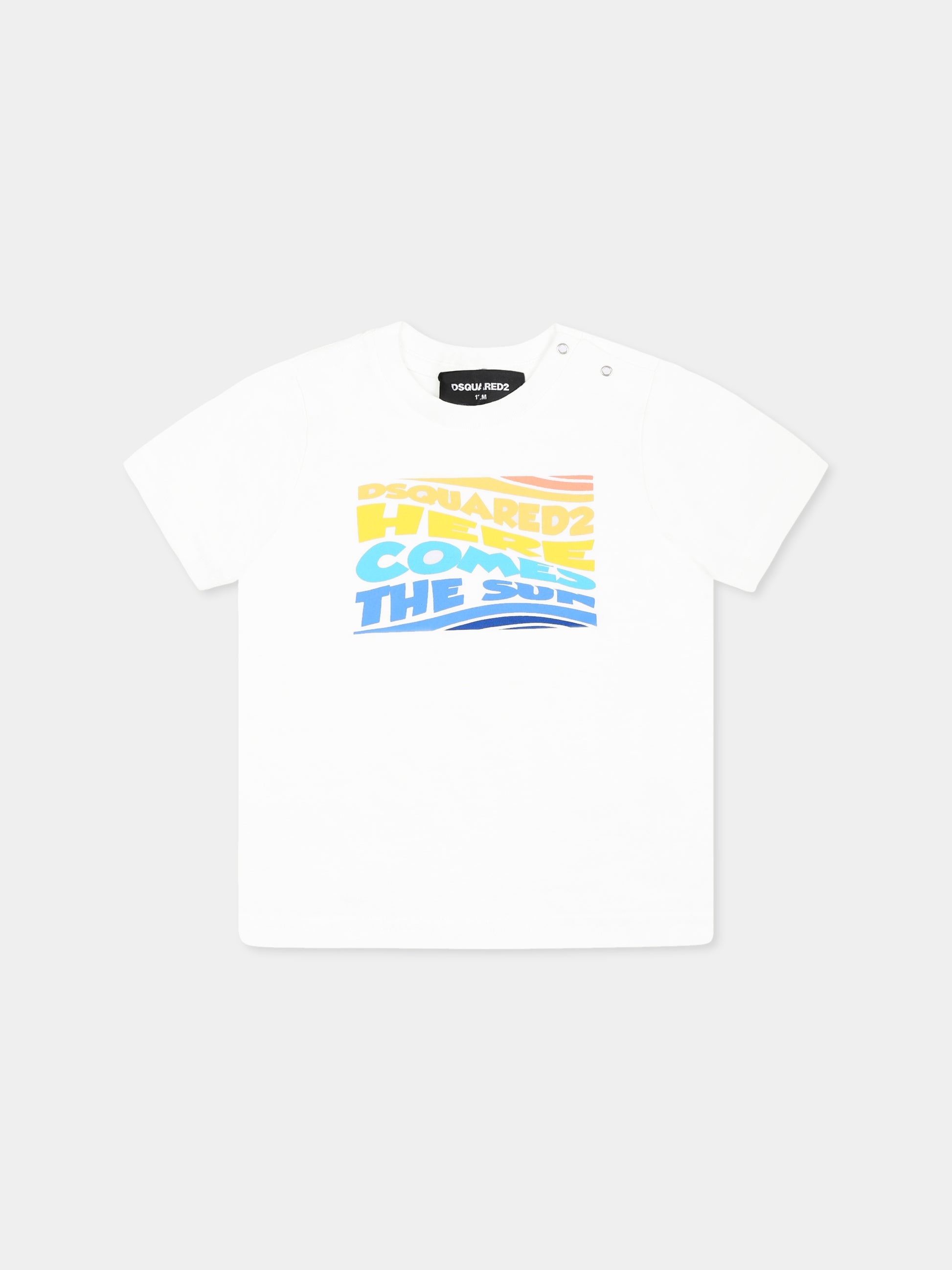 Colore: Bianco Descrizione: T-shirt bianca in cotone, con maniche corte, girocollo e orlo a costine, chiusura con bottoni automatici sulla spalla. È decorata con logo e scritta multicolor sulla parte anteriore. Dettagli: 100%Cotone. Lavare a 30°C.