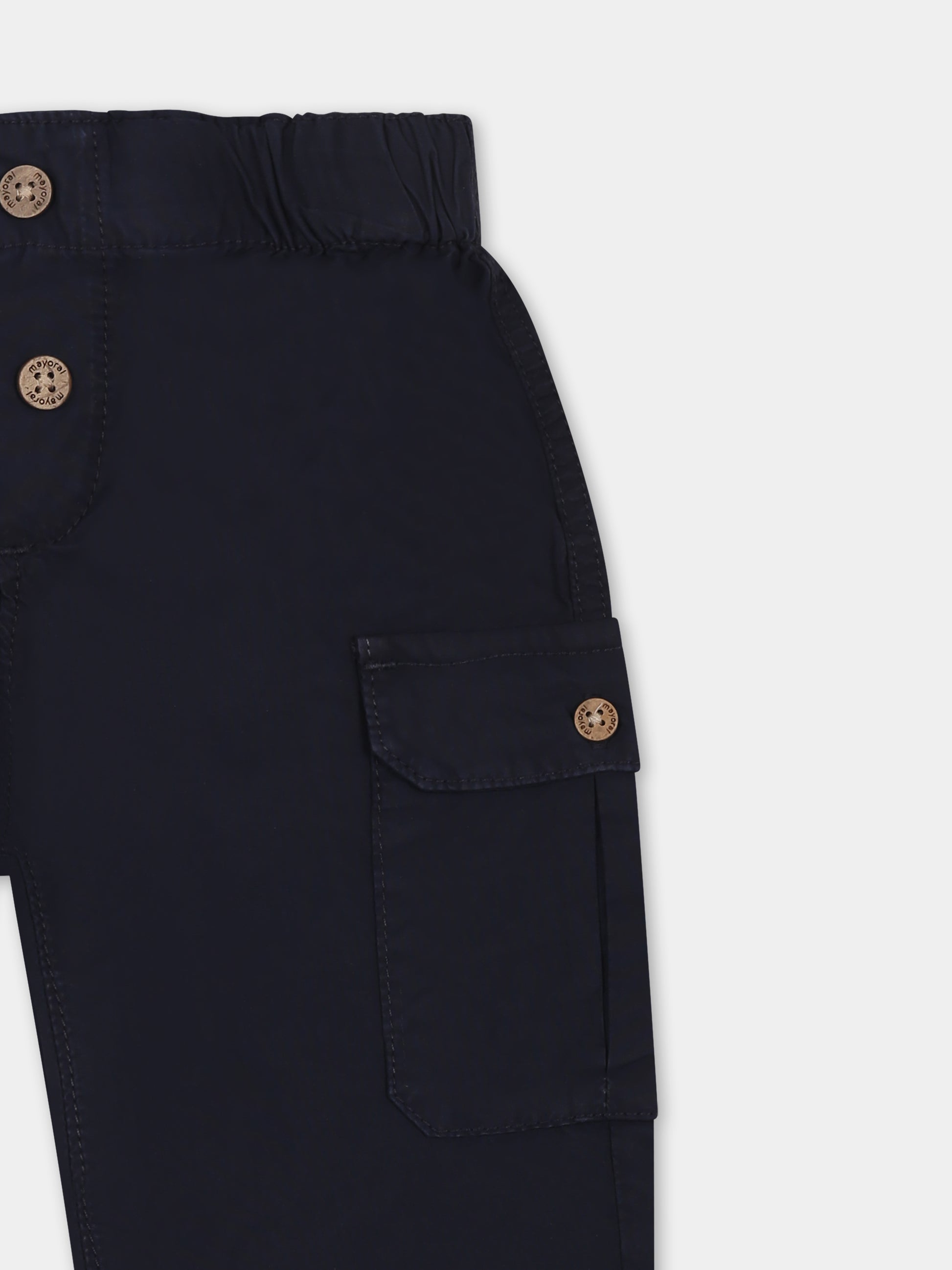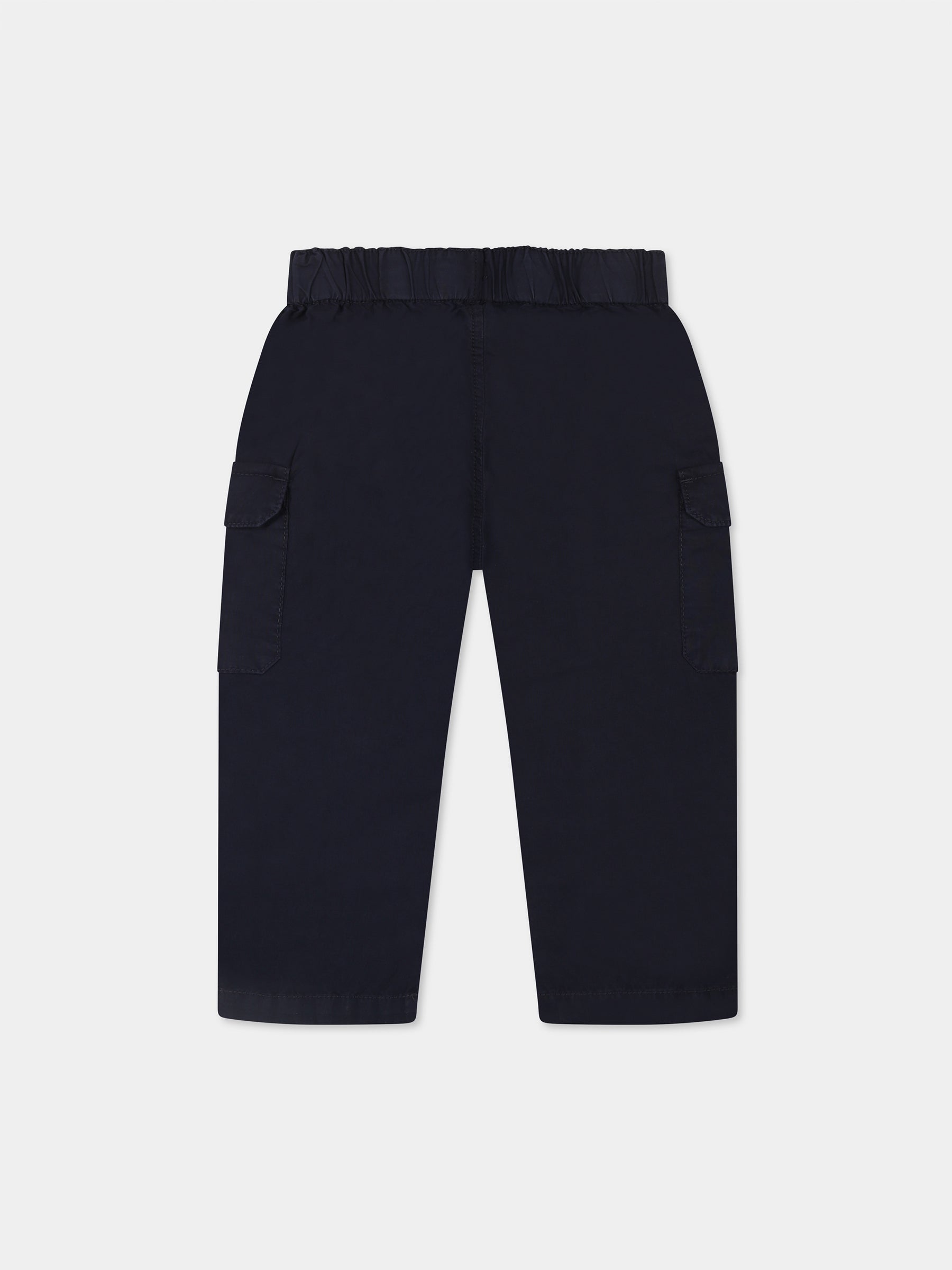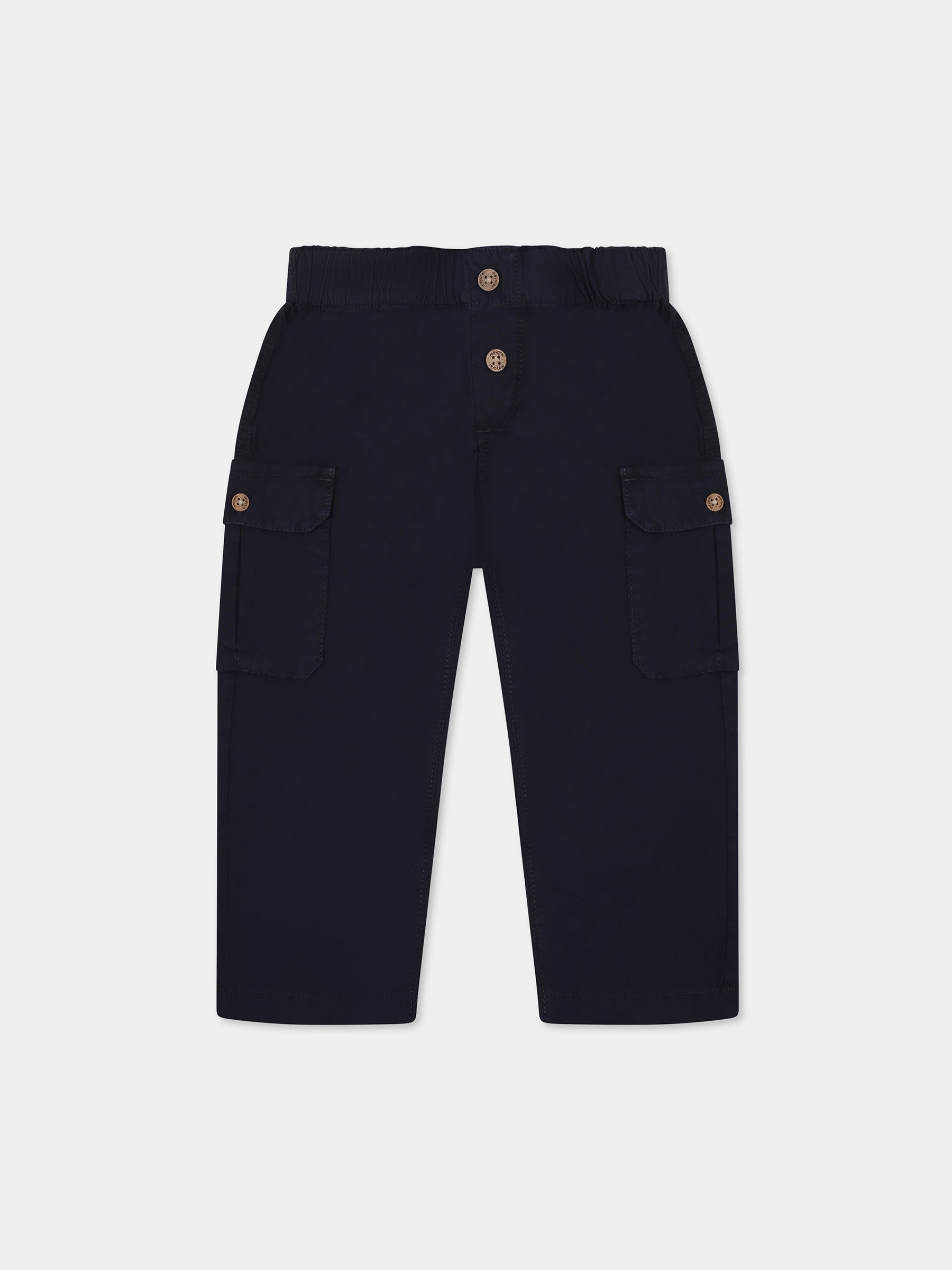 Colore: Blu Descrizione: Pantaloni blu in cotone con vita regolabile grazie ad elastico interno con bottoni, tasche cargo sui lati e bottoni logati sulla parte anteriore. Dettagli: 100% Cotone. Lavare a 30°C.